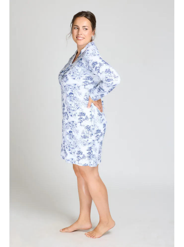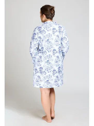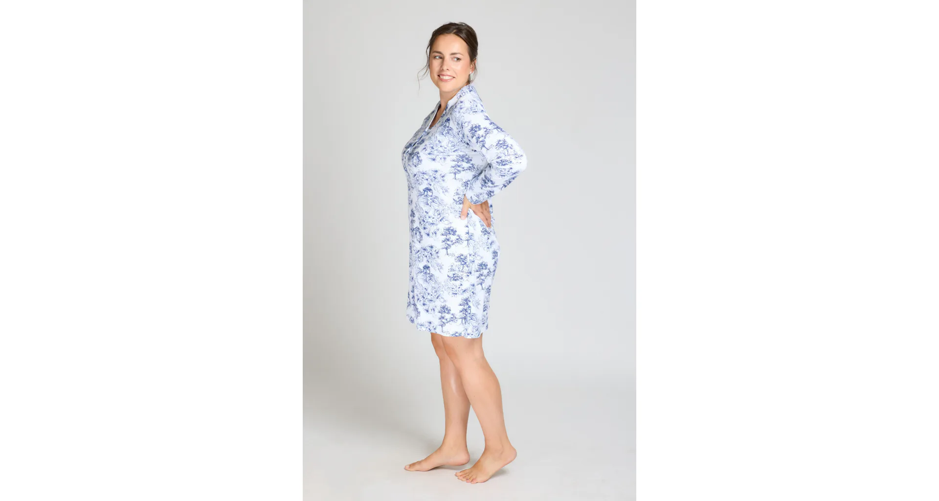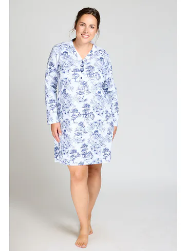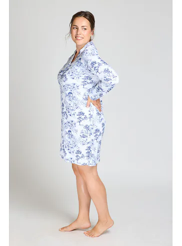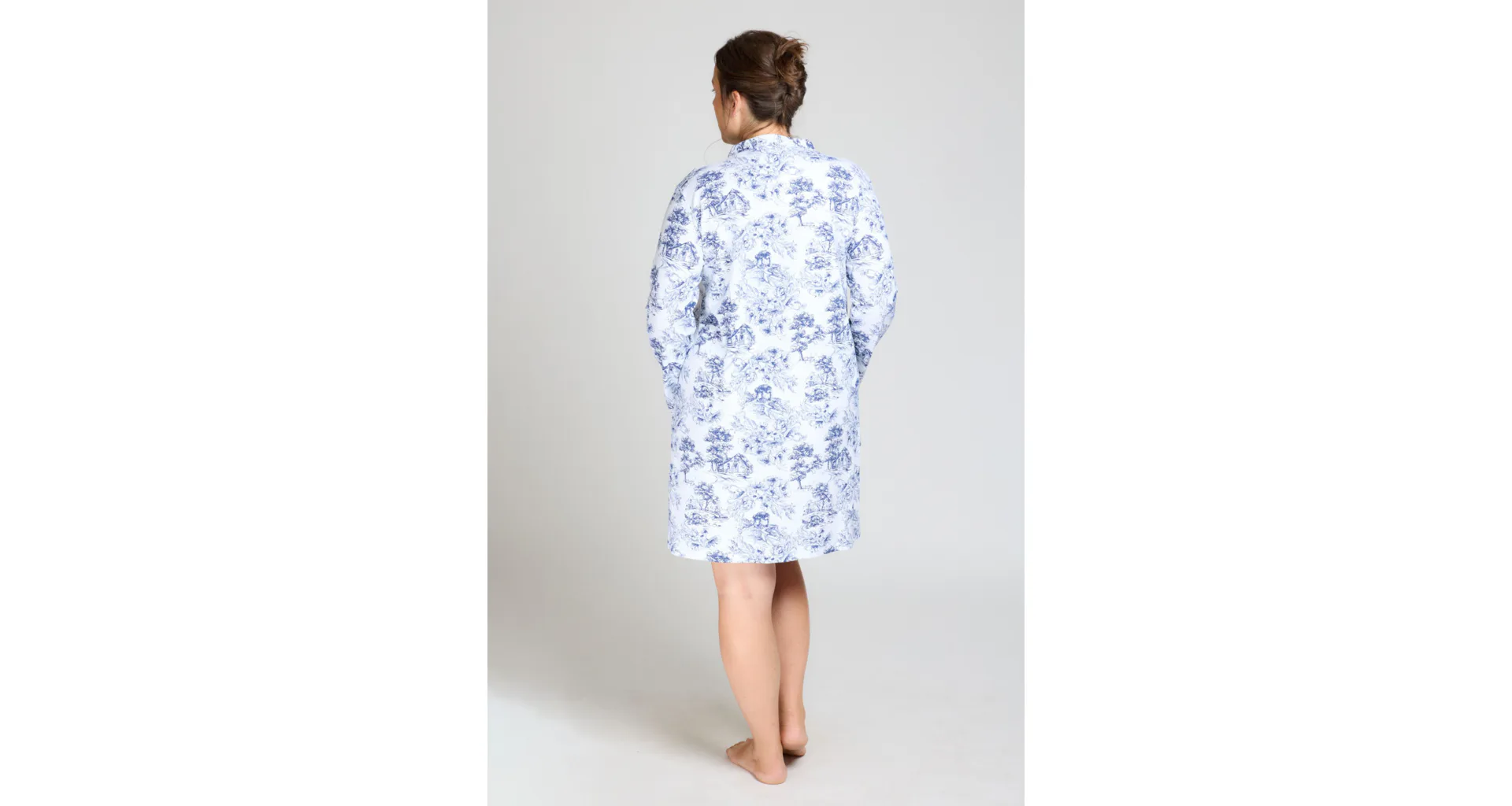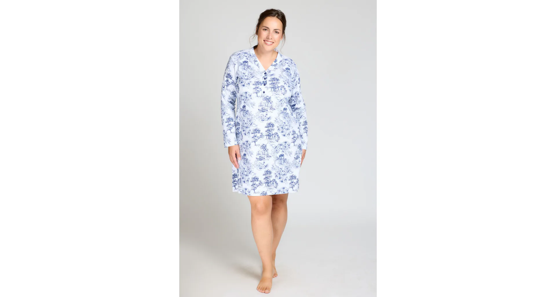 Elegantná dámska košeľa na spanie zaujme modrým motívom na bielom podklade. Má voľný strih, ktorý nijako neobmedzuje v pohybe a zaistí vám maximálny komfort. Nočná košeľa s dlhým rukávom a dĺžkou ku kolenám je skvelou voľbou na celoročné nosenie.