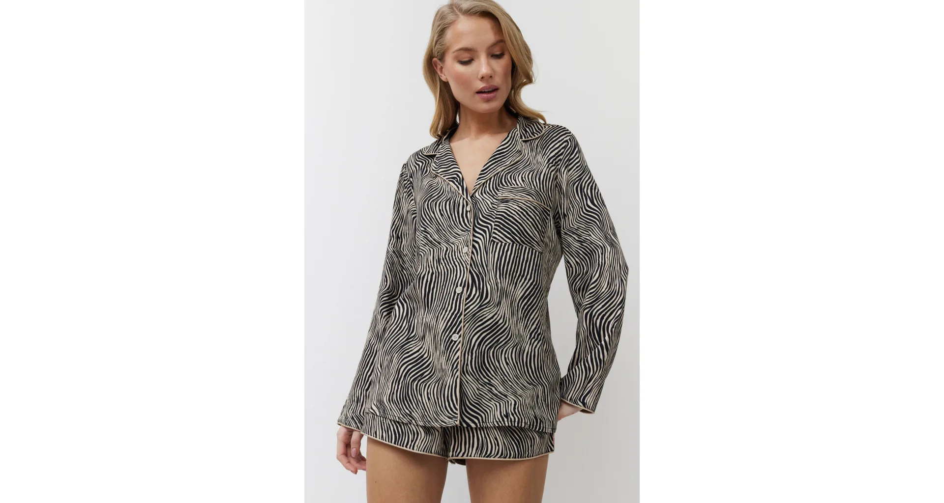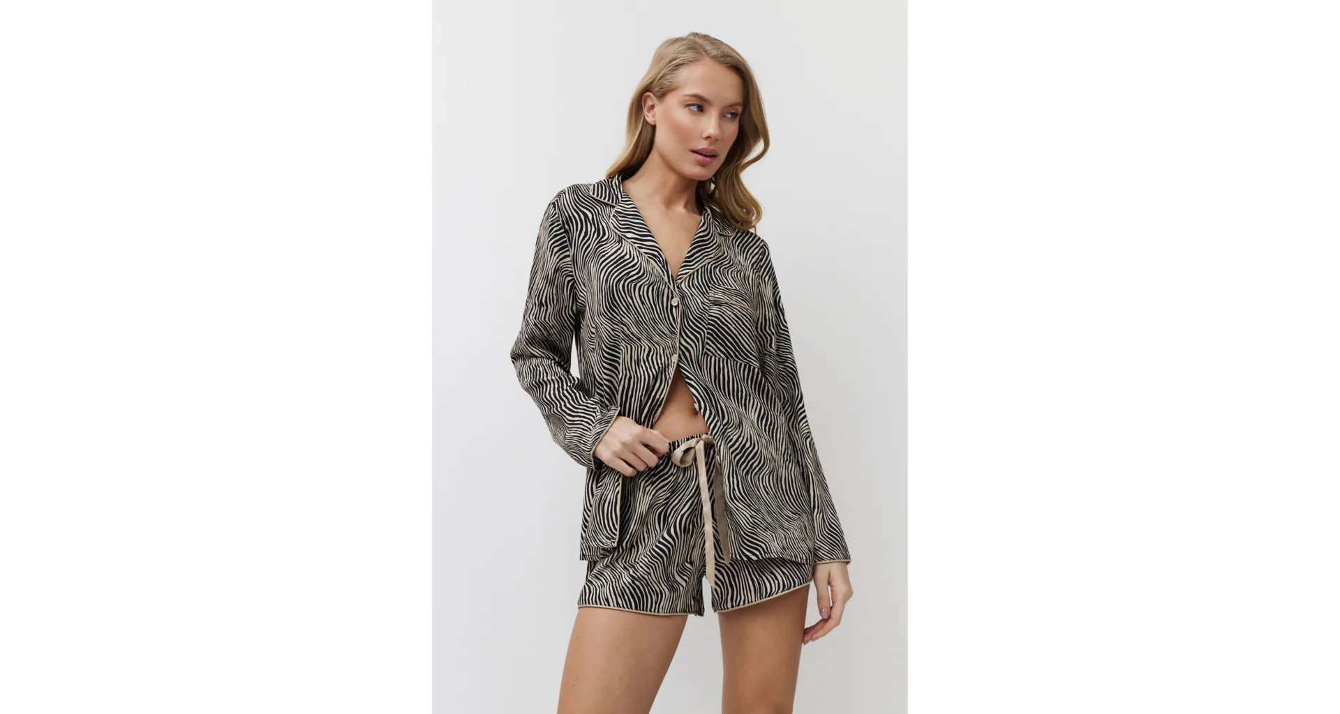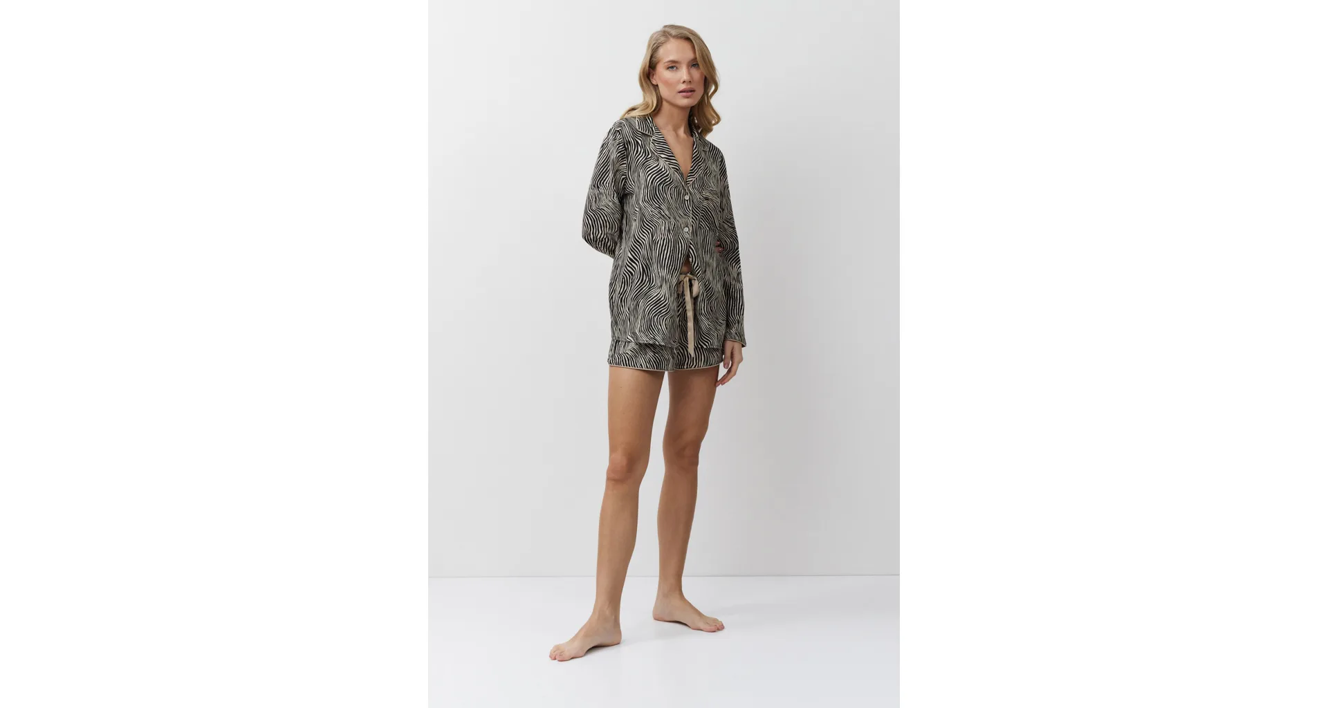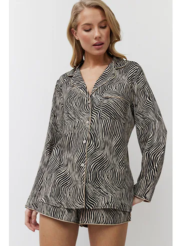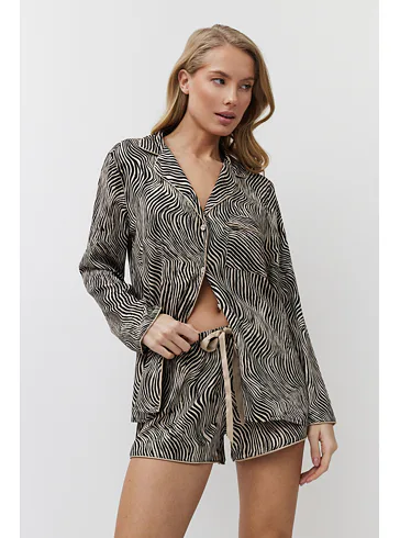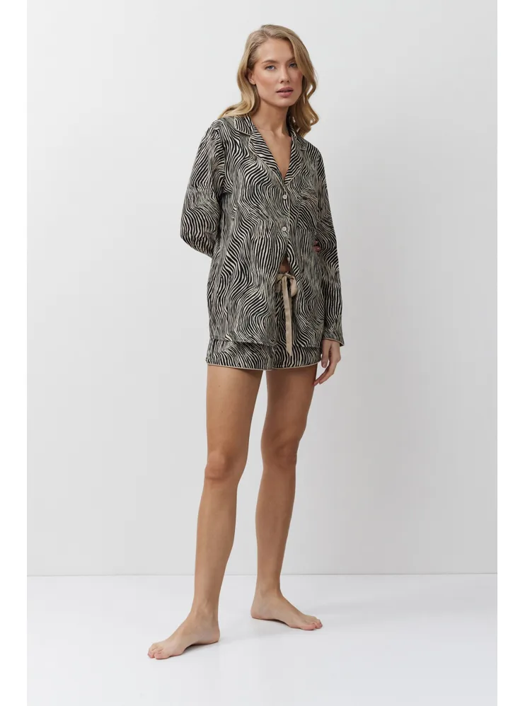 Dámsky pyžamový komplet tvorí košeľa s dlhým rukávom a krátke kraťasy. Košeľa má praktické zapínanie na gombíky a kraťasy je možné utiahnuť opaskom pre optimálne prispôsobenie vašej postave. Zebrí vzor dodáva pyžamu štýlový a exotický vzhľad.