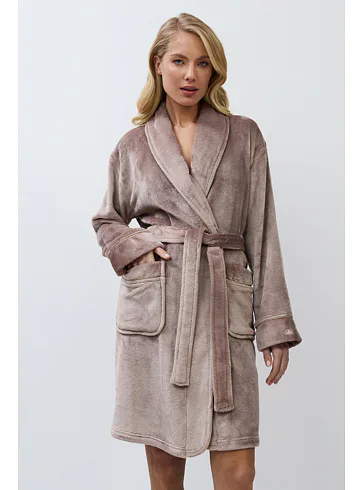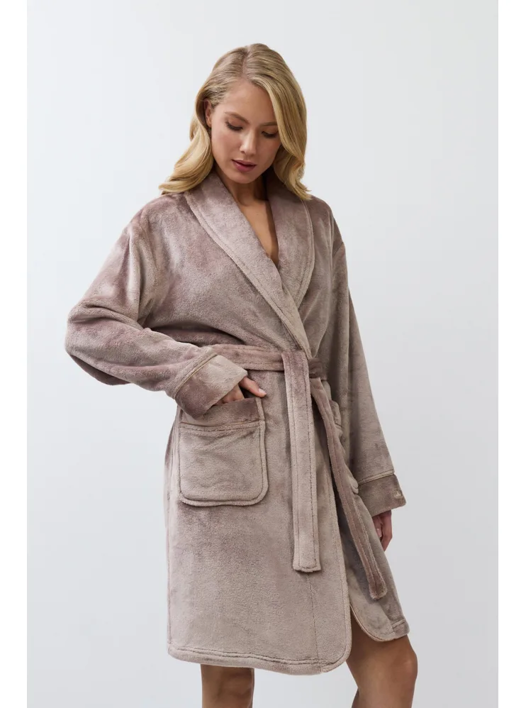 Zahrejte sa v teplom dámskom župane a doprajte si kráľovskú eleganciu. Golier, manžety a vrecká zdobí saténová lemovka, ktorá županu dodáva nádych luxusu. Má praktické vrecká na uloženie drobností a dĺžku približne nad kolená.