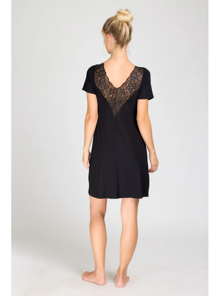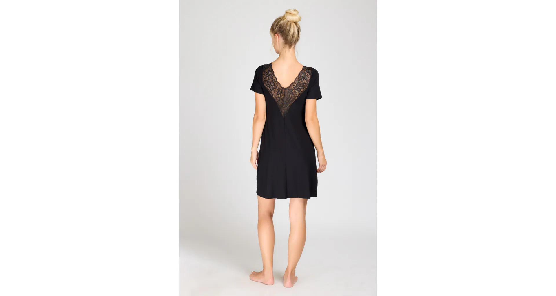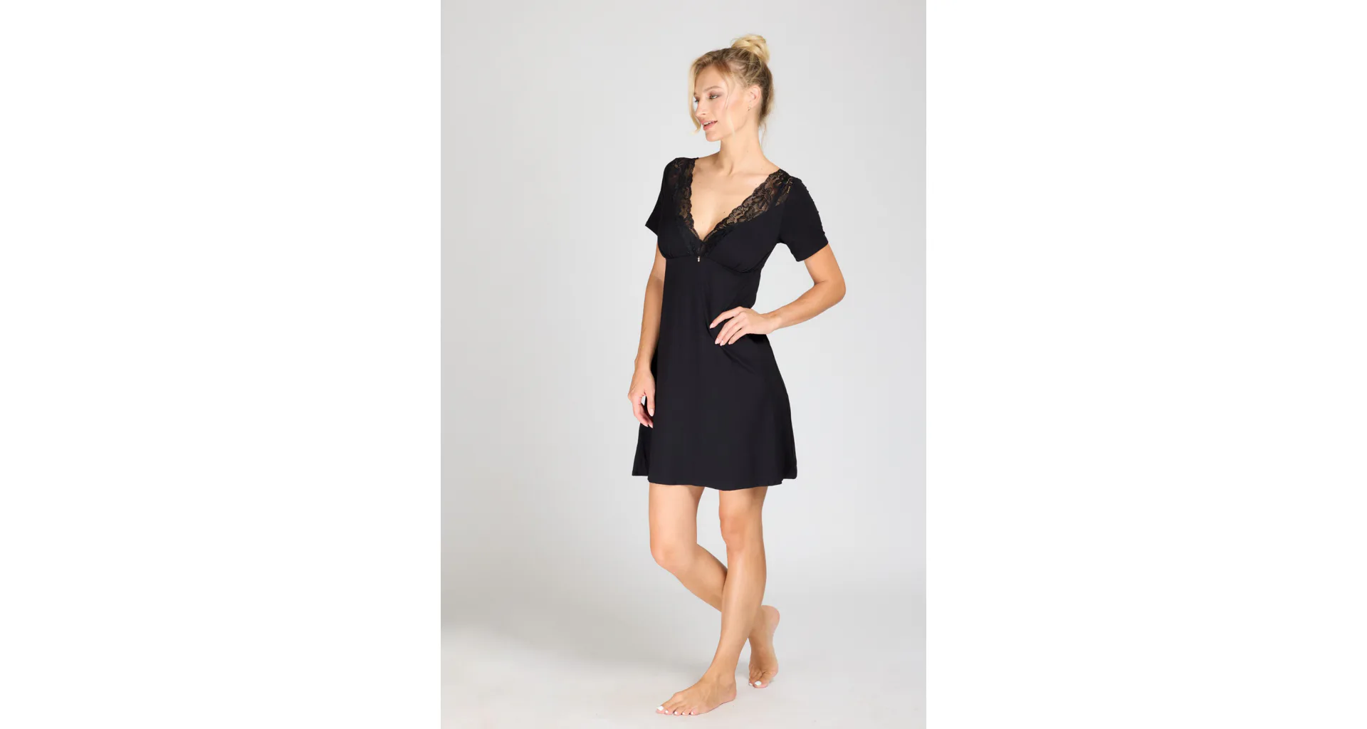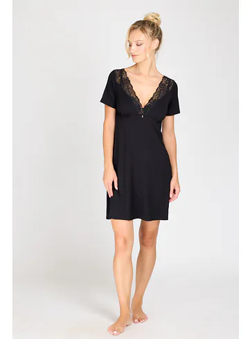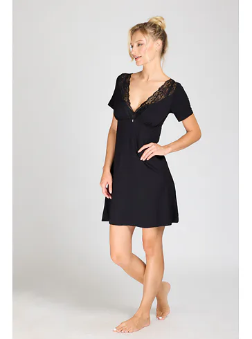 Objavte kombináciu komfortu a elegancie. Dámska nočná košeľa s krátkym rukávom je ideálna na spanie či ako atraktívny domáci odev. Zaujme hlbokým výstrihom zdobeným romantickou čipkou. Odpočívajte v košeli z príjemnej viskózy.