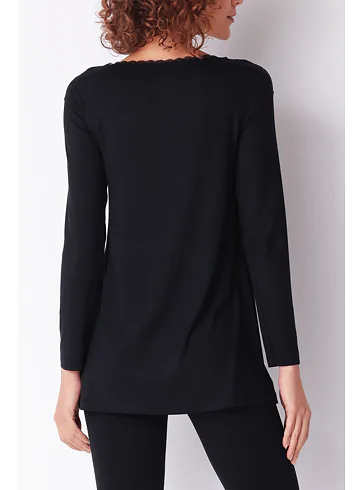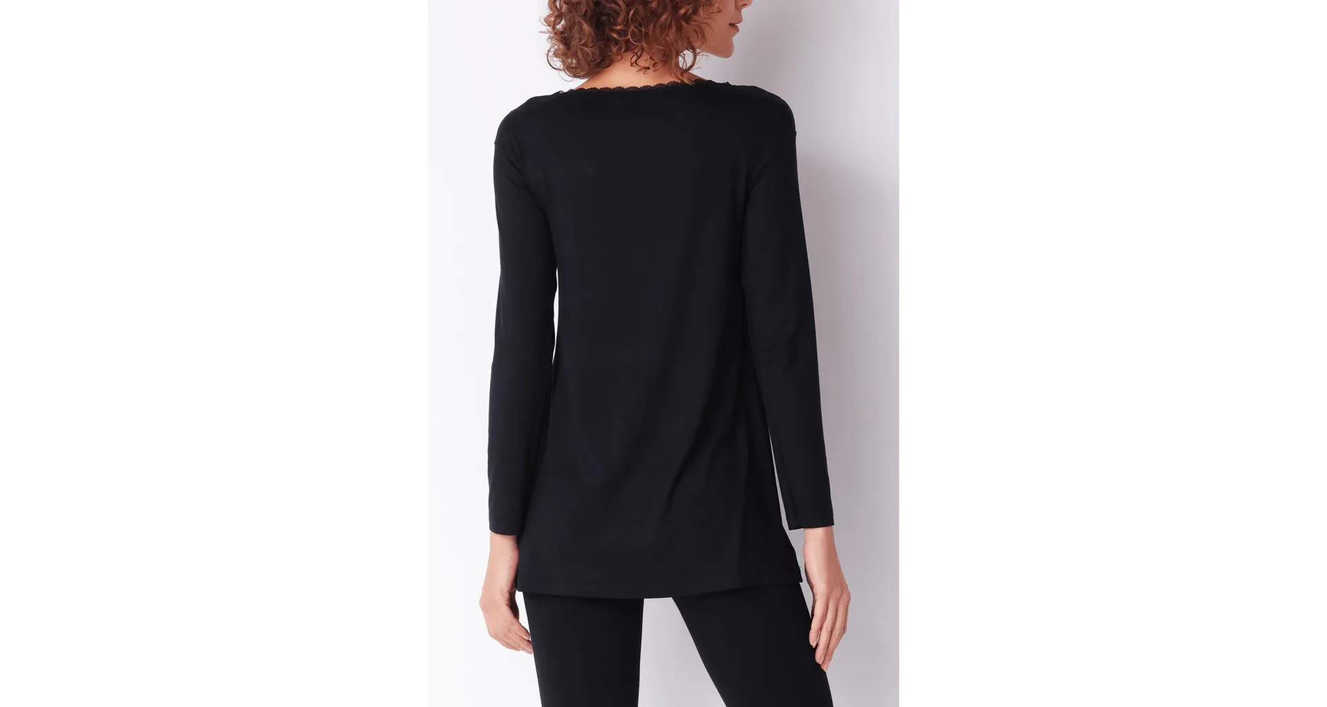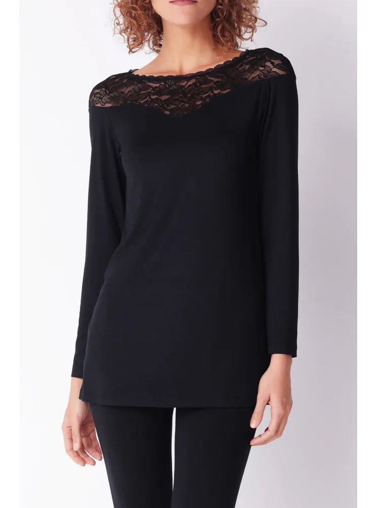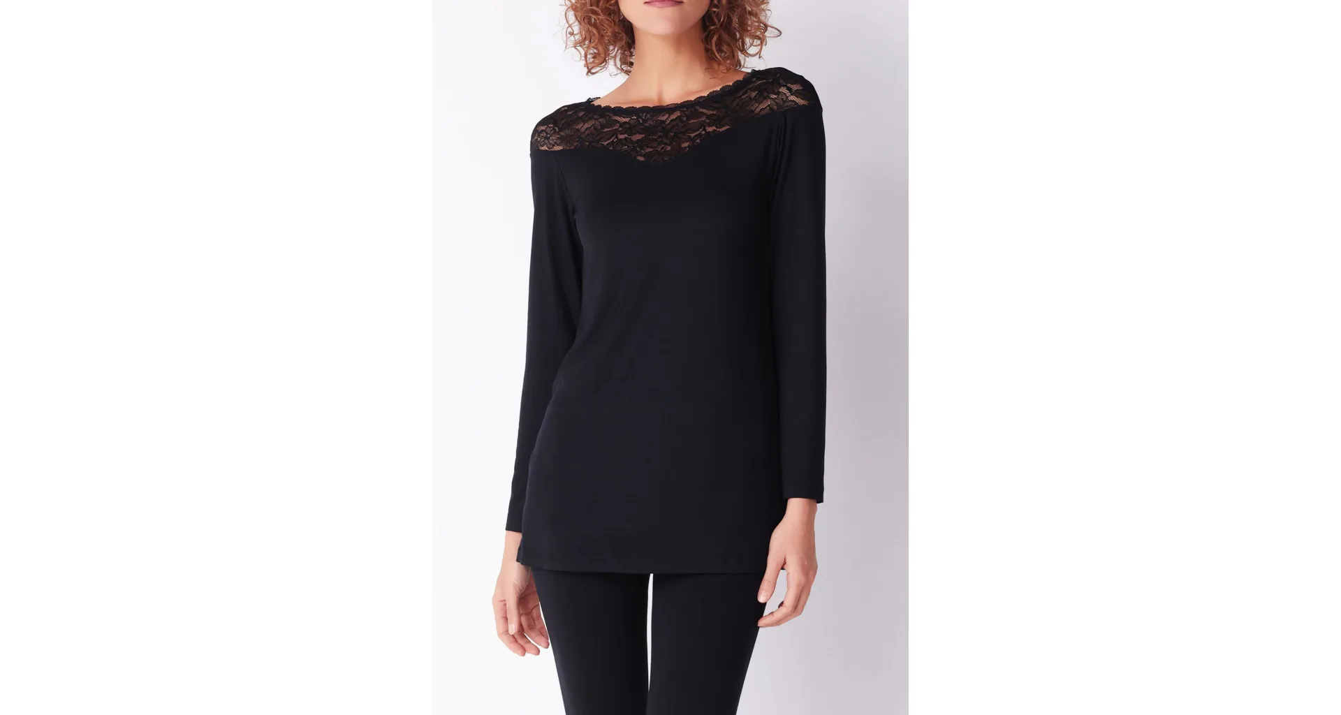 Dámska čierna blúzka zaujme na prvý pohľad jemnou čipkou v oblasti dekoltu a ramien. Vďaka voľnejšiemu a predĺženému strihu je vhodná aj pre plné tvary.