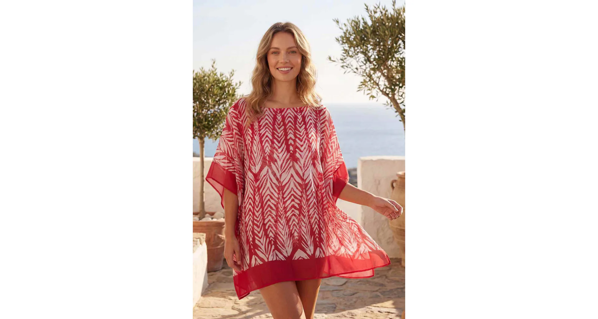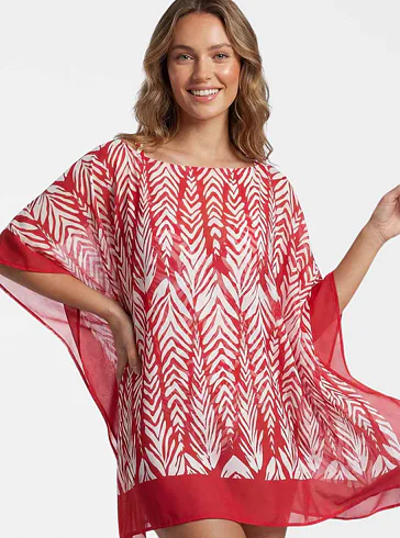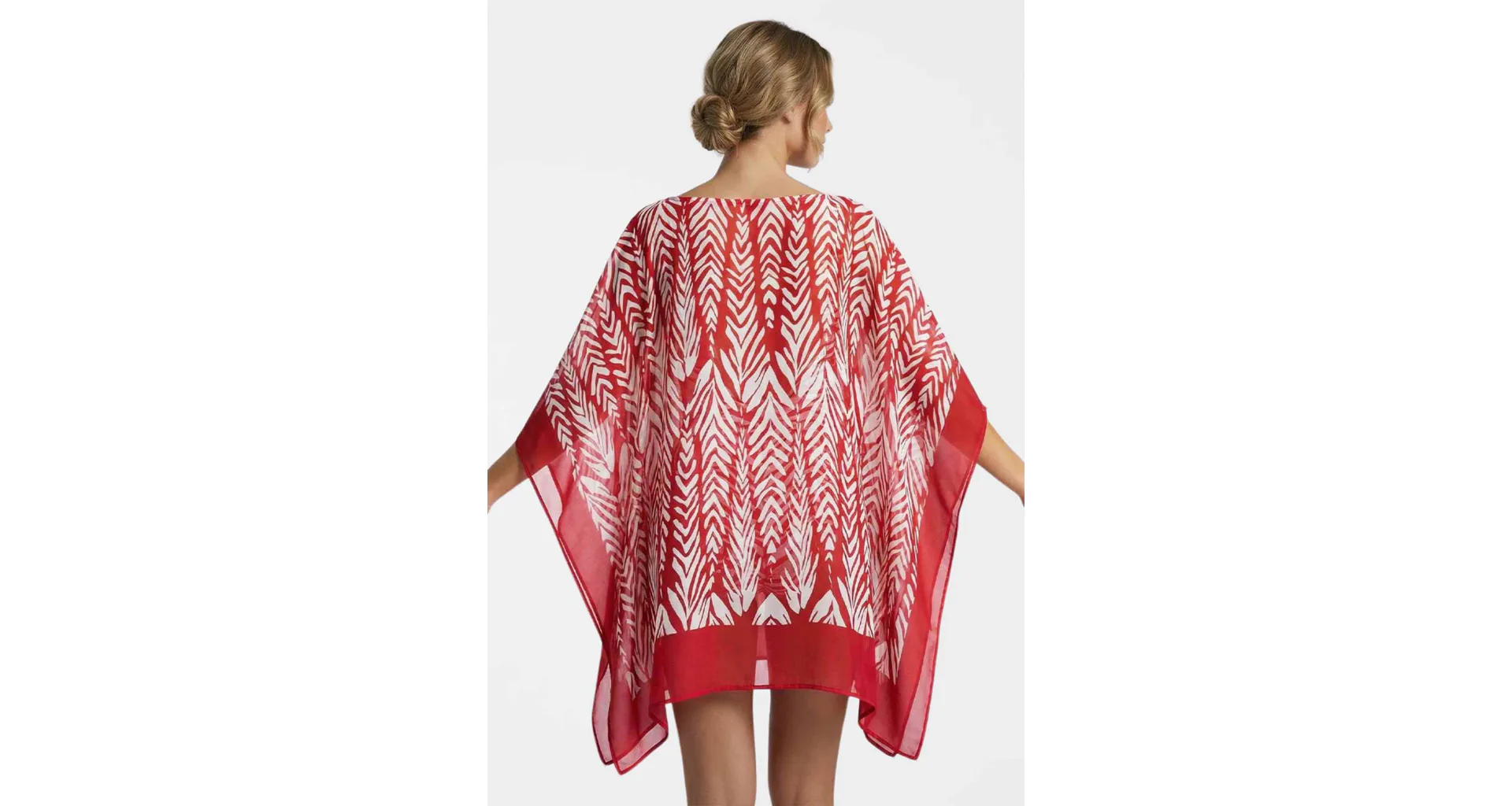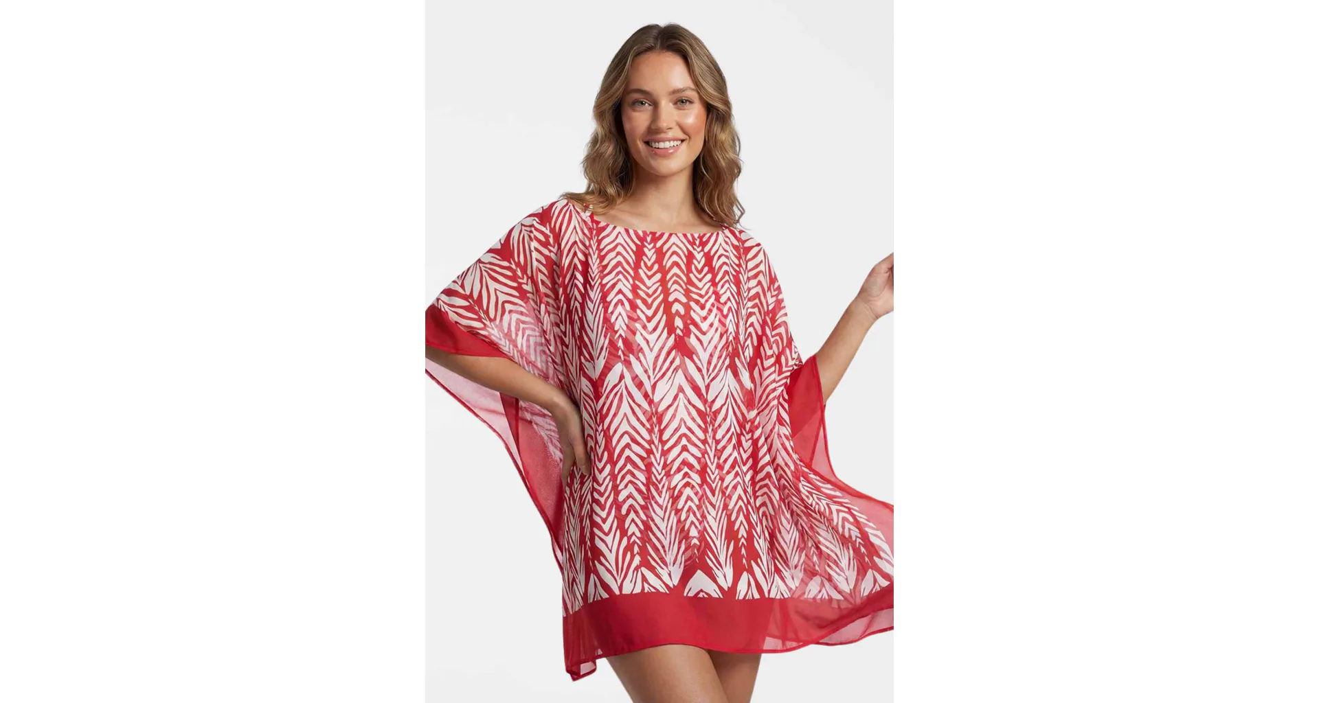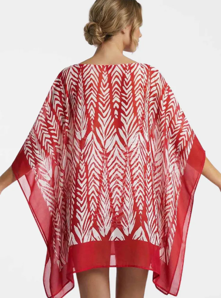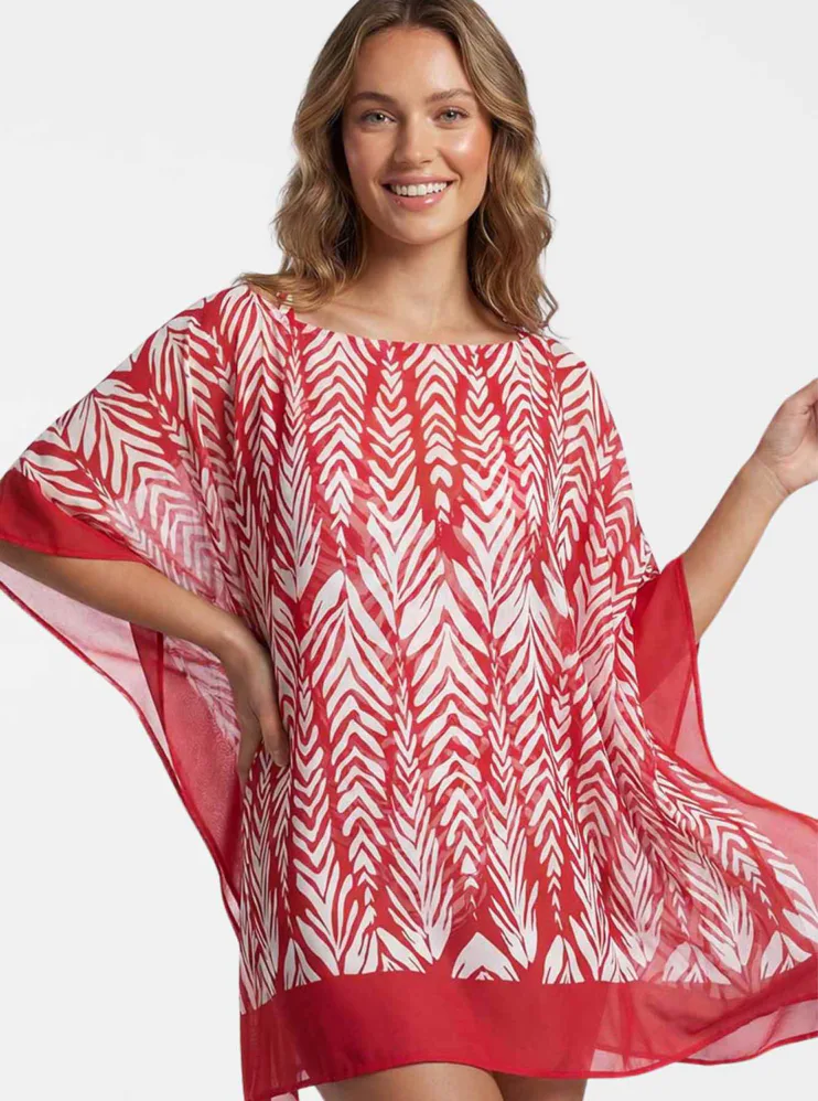 Dodajte svojmu letnému outfitu štýl a ľahkosť. Vzdušný kaftán je ideálny na pláž, k bazénu alebo na promenádu. Zaujme výrazným červenobielym tropickým vzorom a zaistí pohodlie pri nosení. Kaftán s dĺžkou ku kolenám je ideálny ako prehoz cez plavky.