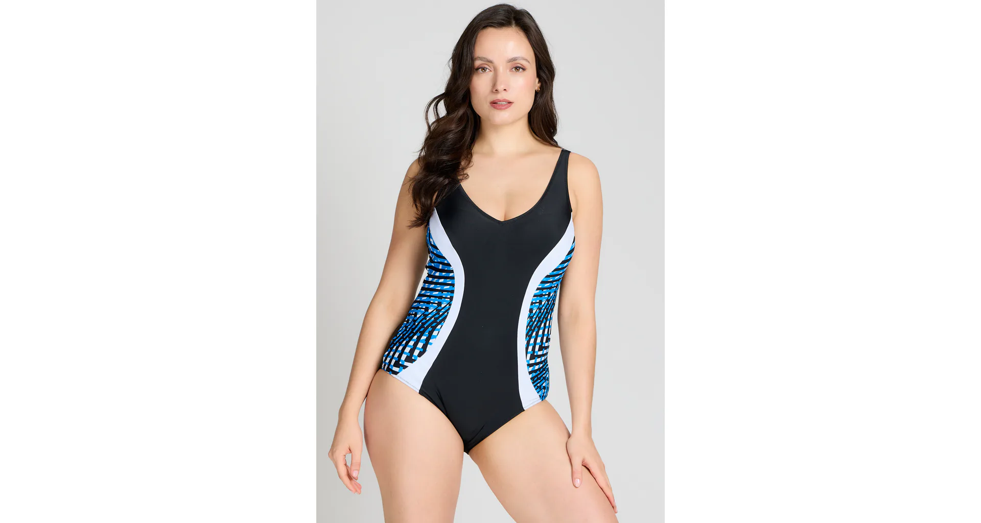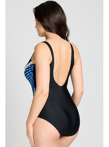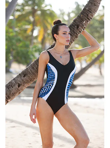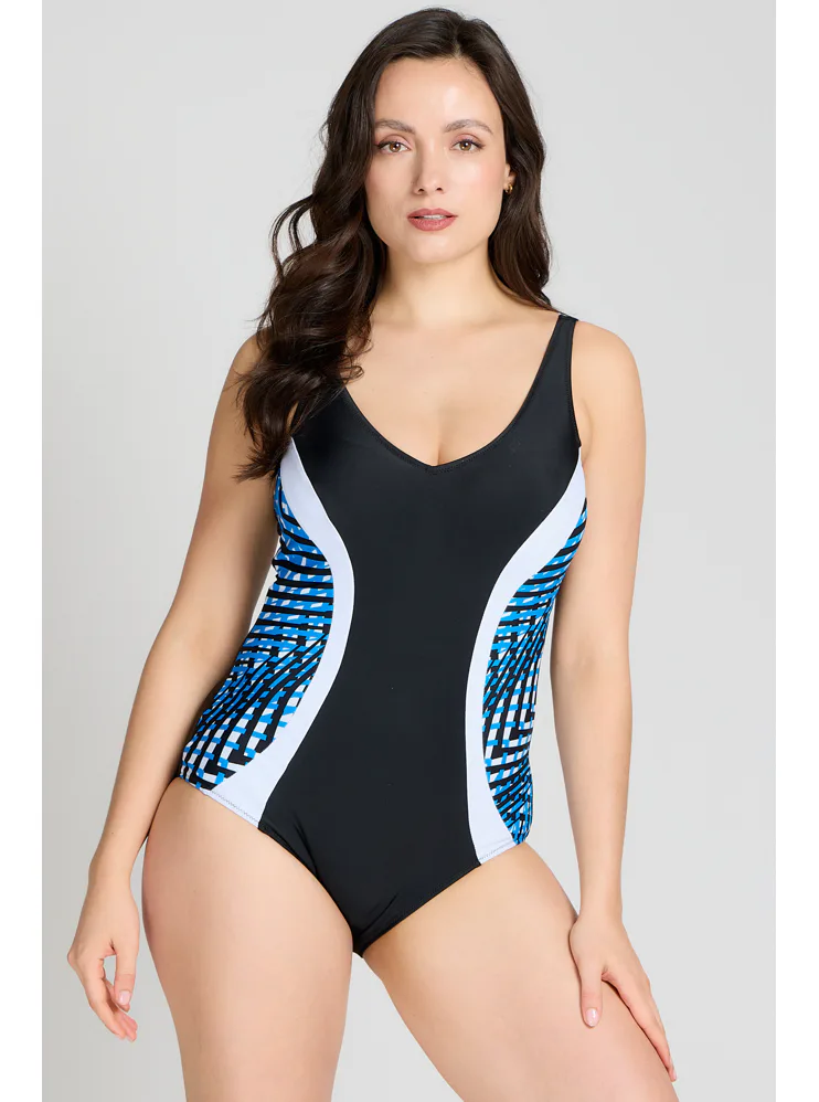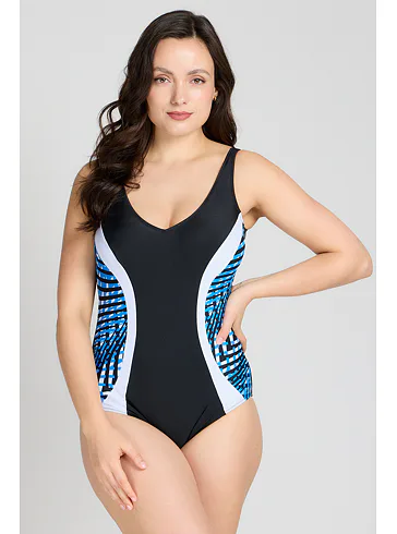 Dámske jednodielne plavky bez kostíc dokonale padnú každej postave. Očarí vás kontrastnými farbami a geometrickým vzorom, ktorý opticky zoštíhli postavu. Ľahko vystužené košíčky poskytnú potrebnú oporu a nijako neobmedzujú v pohodlí. Výstrih do písmena V vykúzli neodolateľný dekolt. Plavky majú širšie ramienka a dajú sa zaobstarať až do veľkosti 100. Pripravte sa s predstihom na letné dni strávené pri vode a kúpte si elegantné dámske plavky.