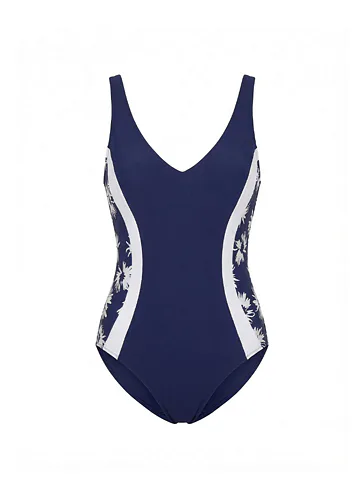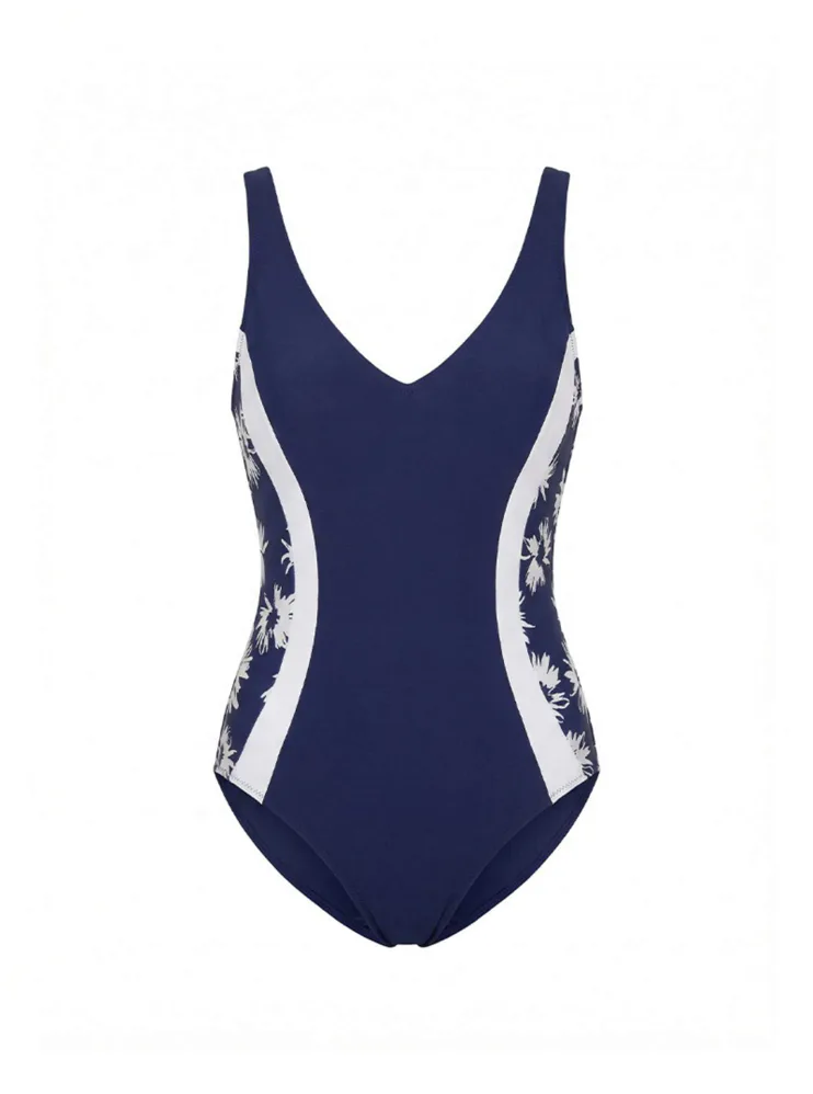 Užite si leto v jednodielnych plavkách, ktoré opticky zoštíhlia postavu a zvýraznia vaše ženské krivky. Plavky upútajú tmavo modrou farbou s kontrastnými bočnými panelmi a jemným kvetinovým vzorom. Do setu zaobstaráte aj kaftan s rovnakým vzorom.