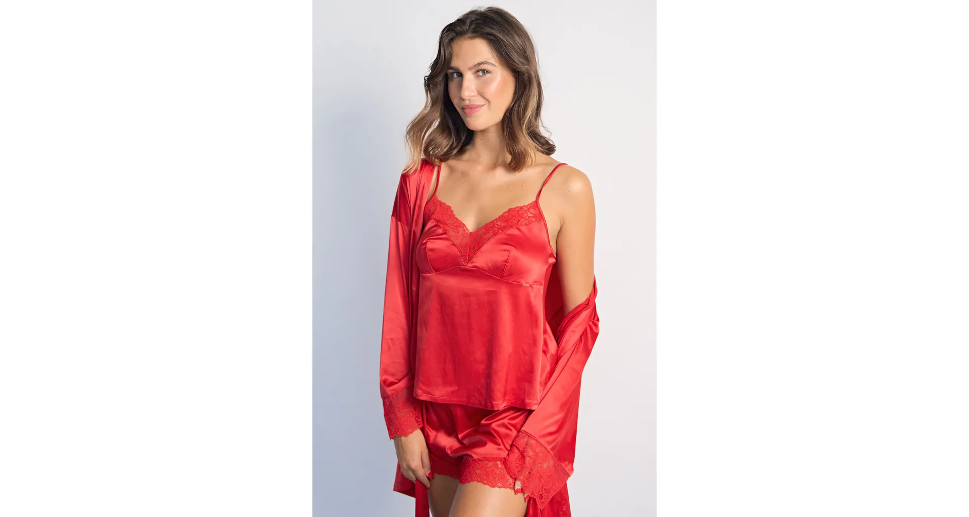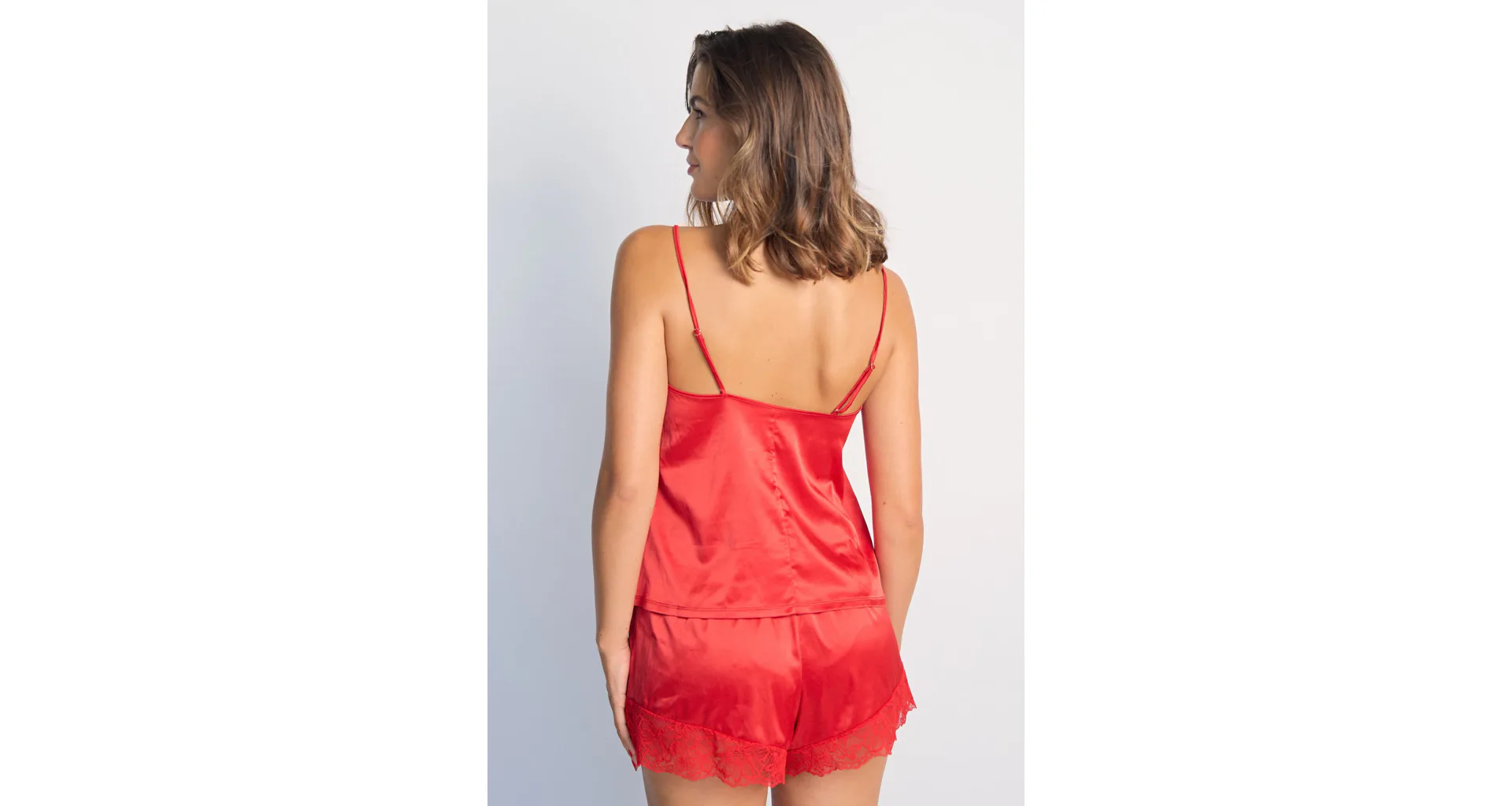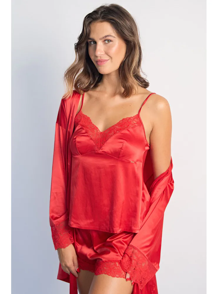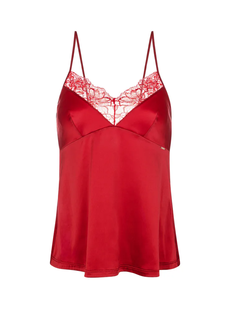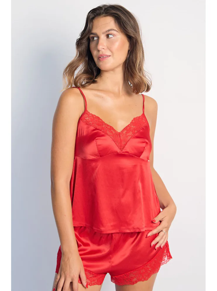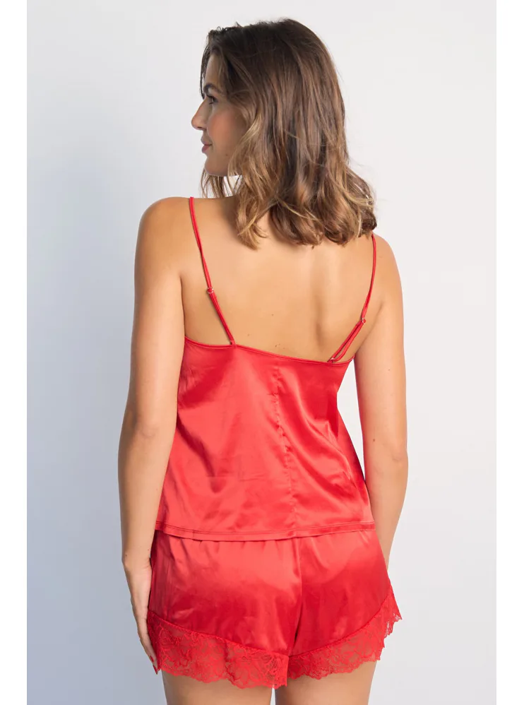 Červené tielko má nastaviteľné ramienka, vďaka ktorým si ľahko nastavíte hĺbku dekoltu. Saténové tielko príjemne chladí a je hebké na dotyk. Vo výstrihu má nežnú čipku, ktorá mu dodáva romantický nádych. Možno si zaobstarať aj červené šortky a mať tak kompletný set.