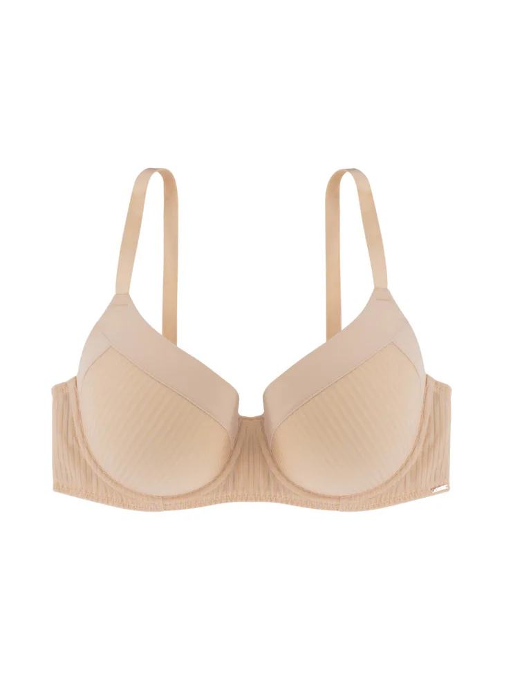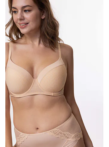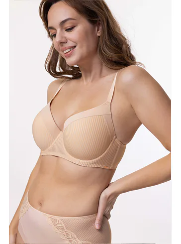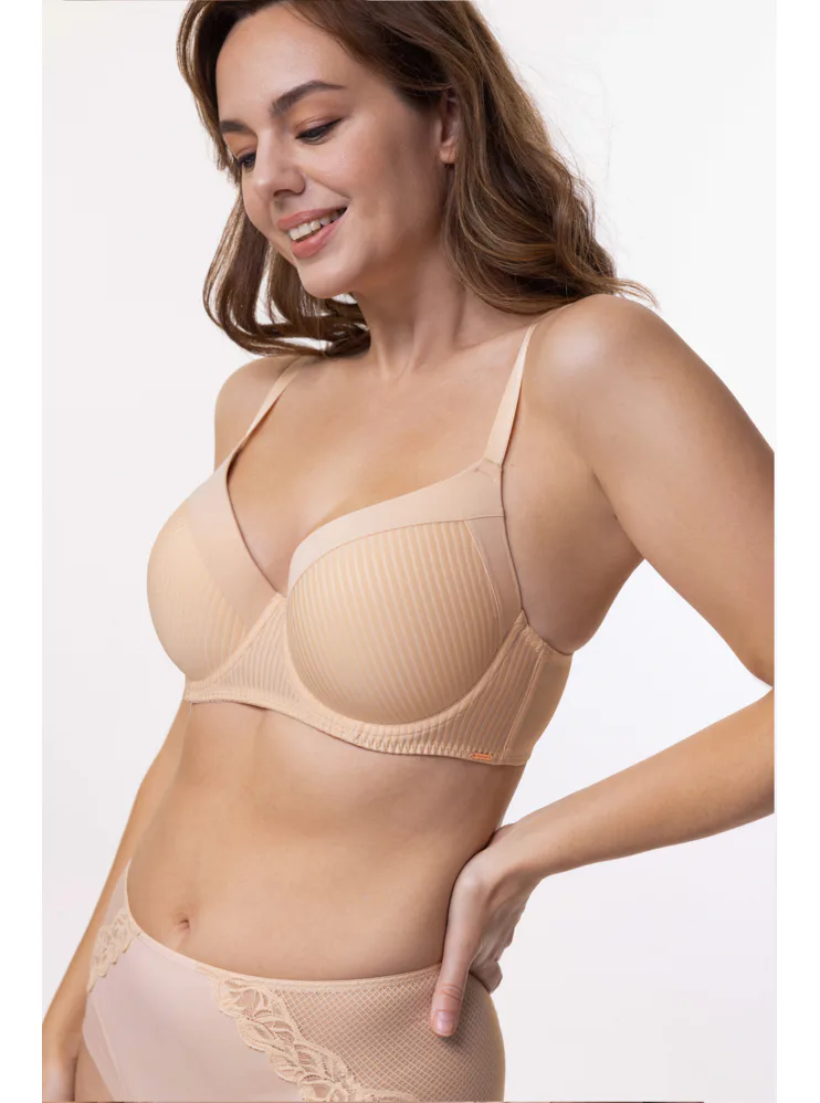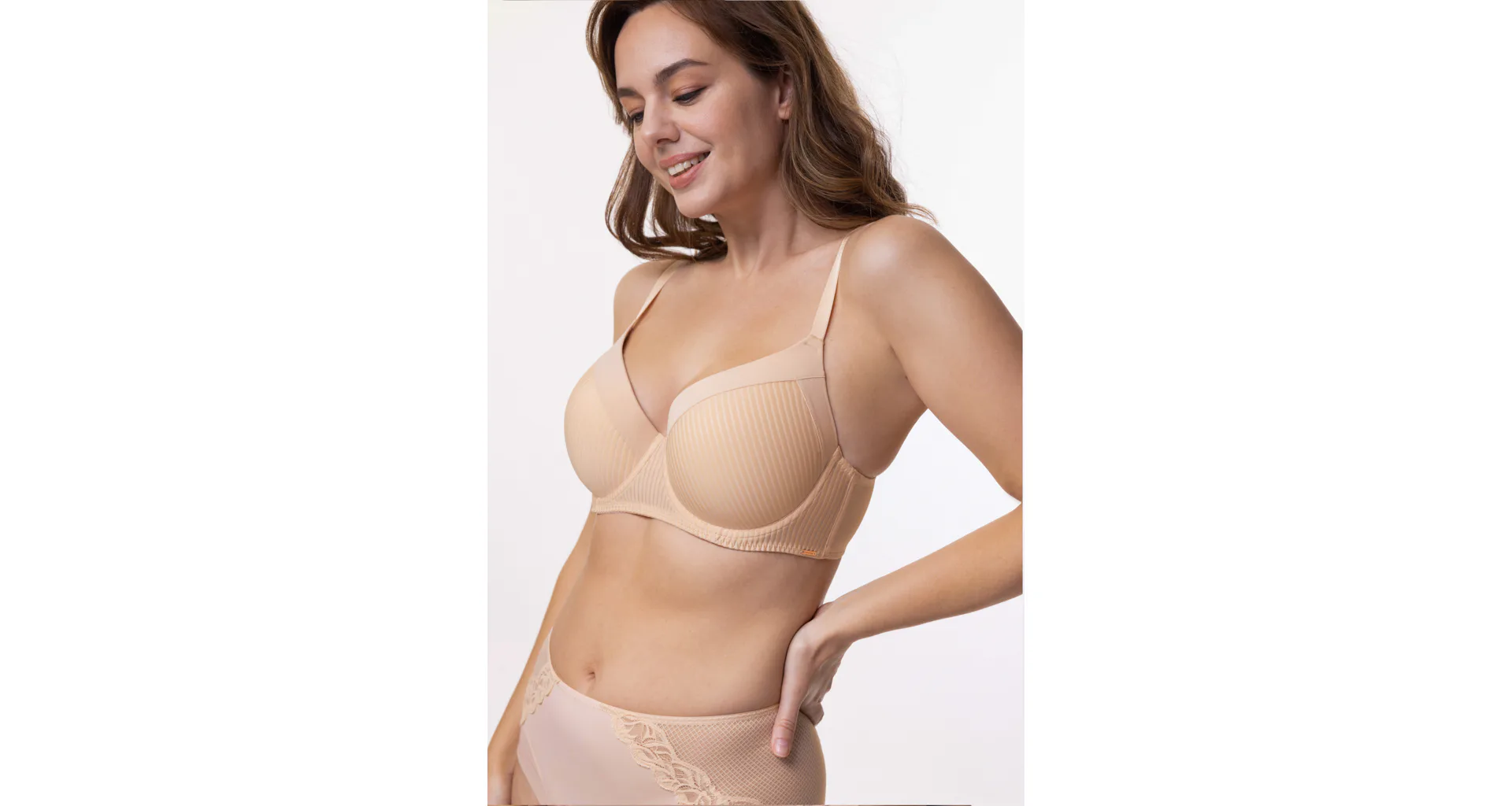 Ľahko vystužená podprsenka Dorina je z jemne prúžkovaného materiálu, čo ocenia najmä milovníci minimalistického dizajnu. Samozrejmosťou sú nastaviteľné ramienka, ktoré nikde netlačia a pomáhajú rovnomerne rozložiť váhu pŕs. Podprsenka je vhodná pre väčšie prsia, kostice nikde netlačia a poskytujú potrebnú podporu. Má zadné zapínanie s tromi háčikmi a tromi uťahovacími polohami. Vďaka hladkému povrchu a jemným švom zostáva diskrétna pod oblečením a je preto ideálnou voľbou na každodenné nosenie aj pod upnuté outfity.