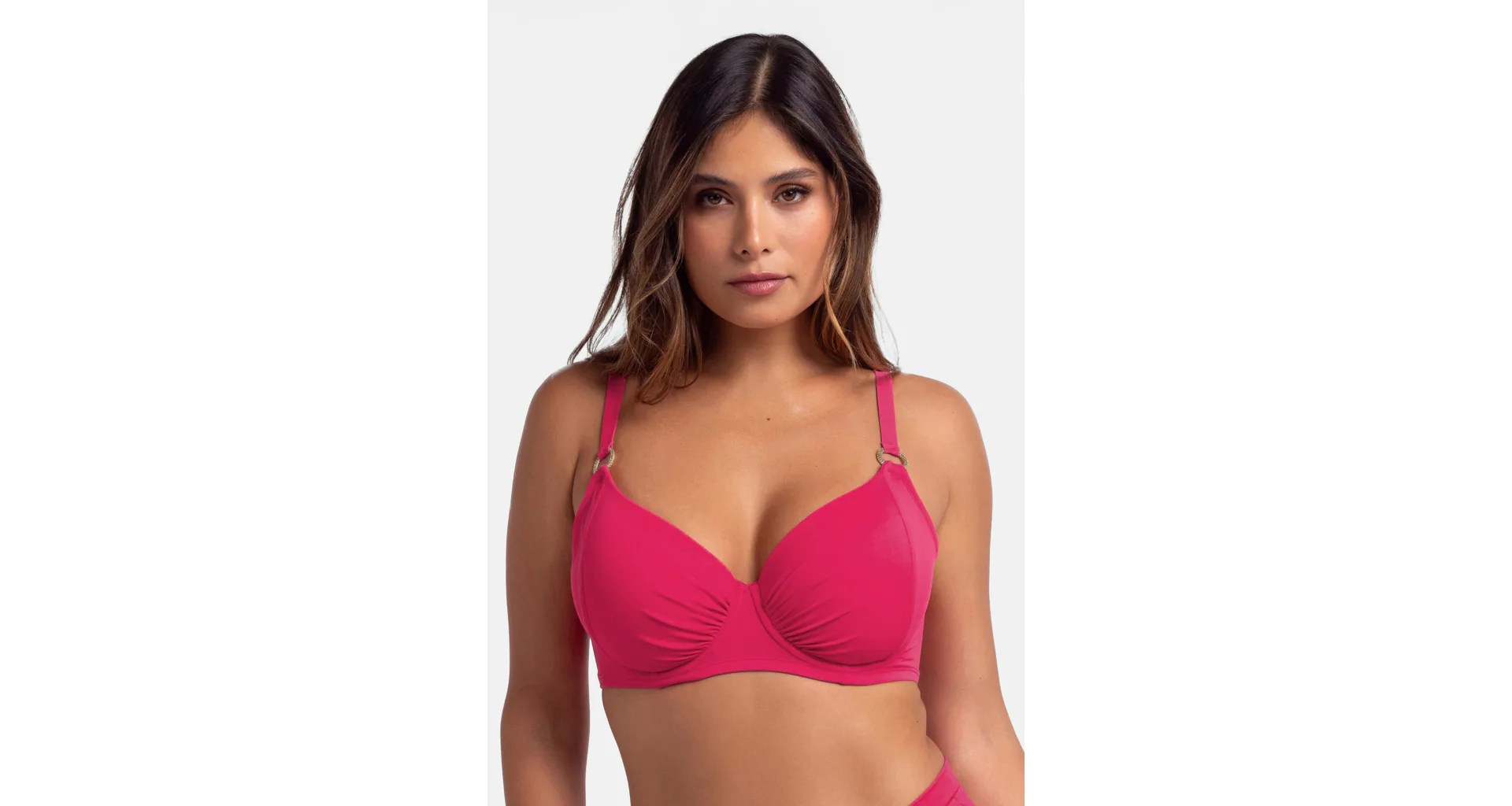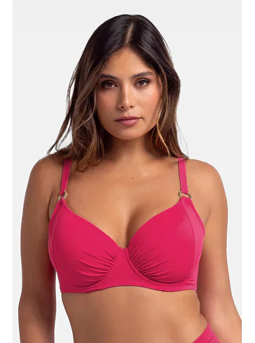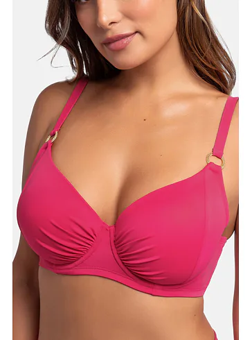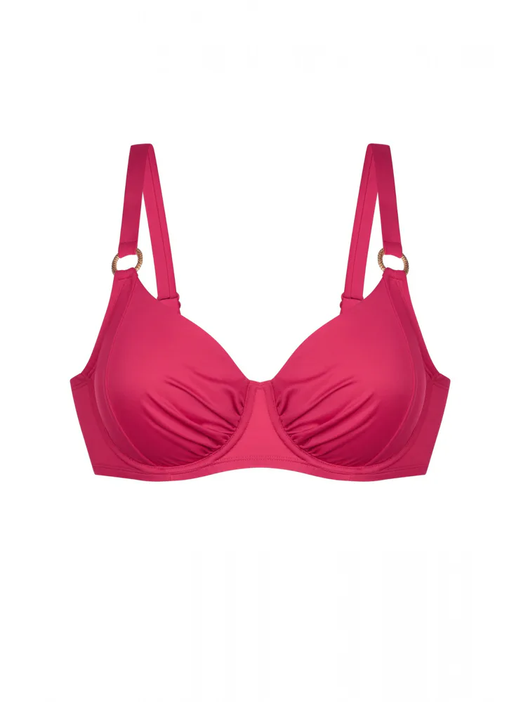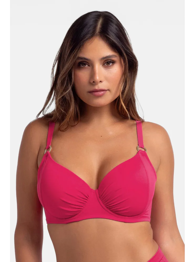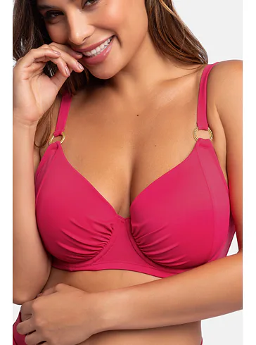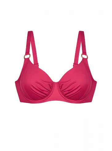 Ružová plavková podprsenka s kosticami má uzavretejší strih, ktorý poskytuje pevnú oporu a zaisťuje, že poprsie zostane pevne na svojom mieste. Nastaviteľné ramienka zaujmú ozdobnými krúžkami v zlatej farbe. Zapína sa vzadu na sponu. Nikde netlačí a nezarezáva sa, ideálna na letné dni strávené pri vode. Oživte váš plážový šatník o nevystuženú plavkovú podprsenku Dorina, ktorá je spojením štýlu a komfortu. K tejto podprsenke si možno zaobstarať v rovnakej farbe a vytvoriť tak dokonale zladený set.