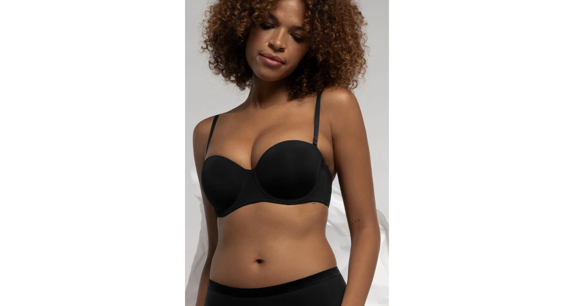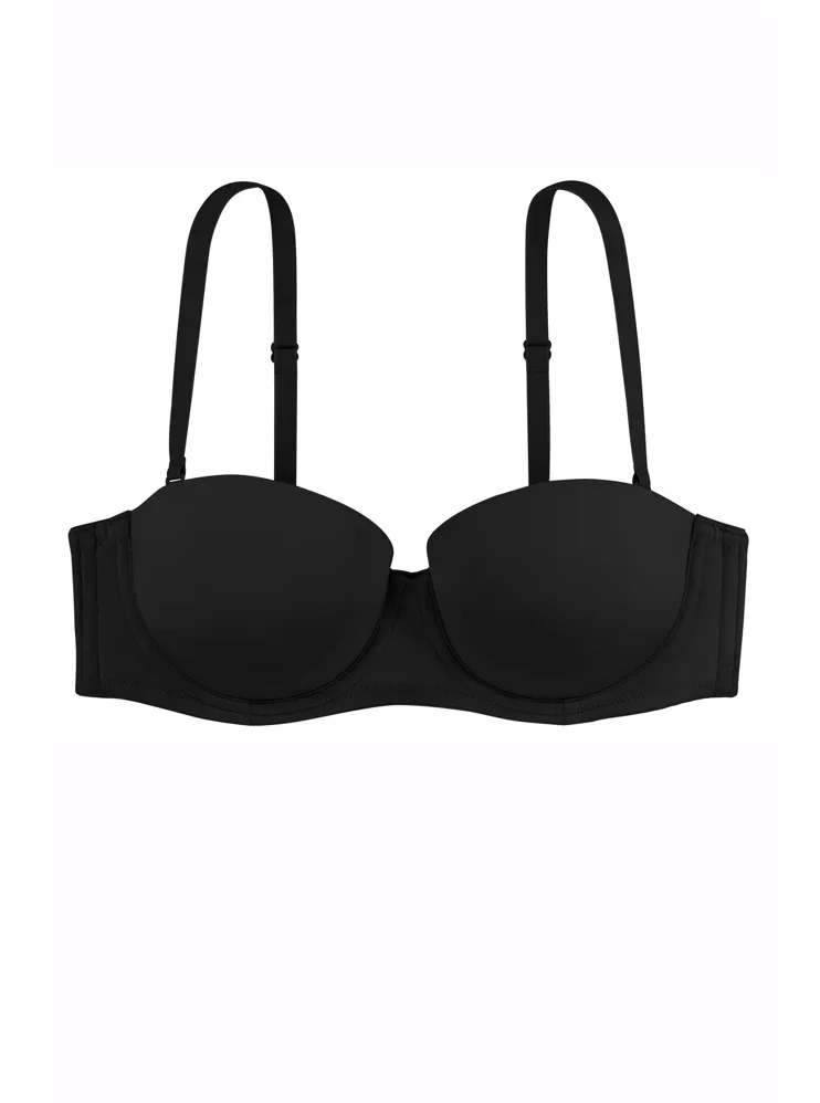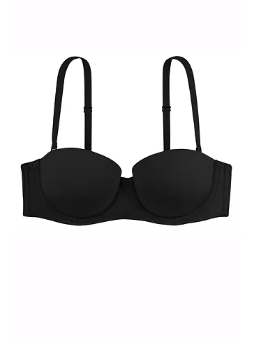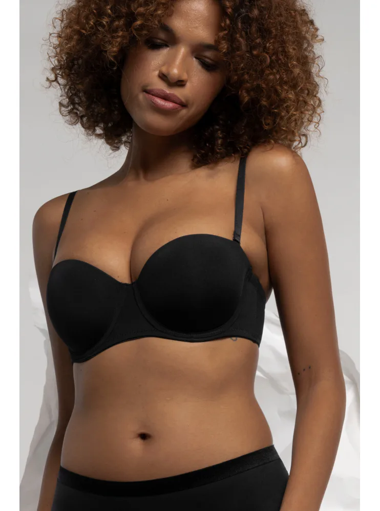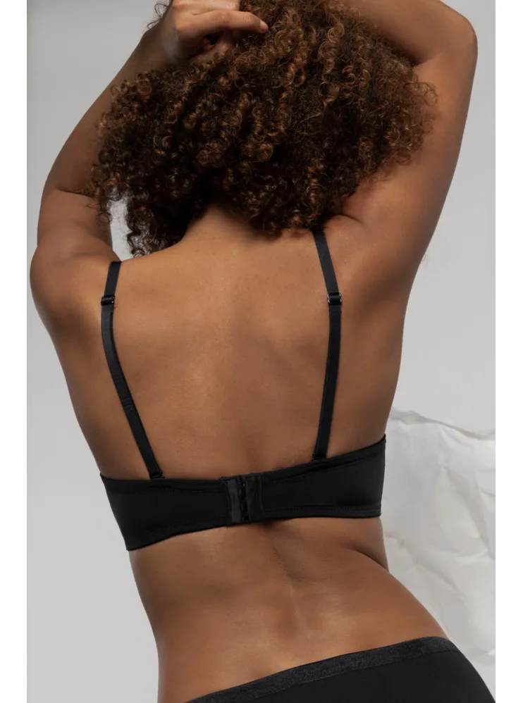 Samodržiaca čierna podprsenka v strihu balcony si získala u žien veľkú obľubu, nikde netlačí a prispôsobí sa každému vášmu pohybu. Jemný elastický úplet vám zaistí komfort po celý deň a ľahko sa udržuje. Vďaka odopínacím ramienkom je podprsenka vhodná aj pod oblečenie odhaľujúce ramená. Podprsenka vám bude dobre sedieť aj bez ramienok, pretože má po celom vnútornom obvode protišmykový silikónový prúžok. Ramienka je možné nielen odopnúť, ale aj zapnúť do kríža. Zadné zapínanie má na tri háčiky s dvoma polohami stiahnutia.