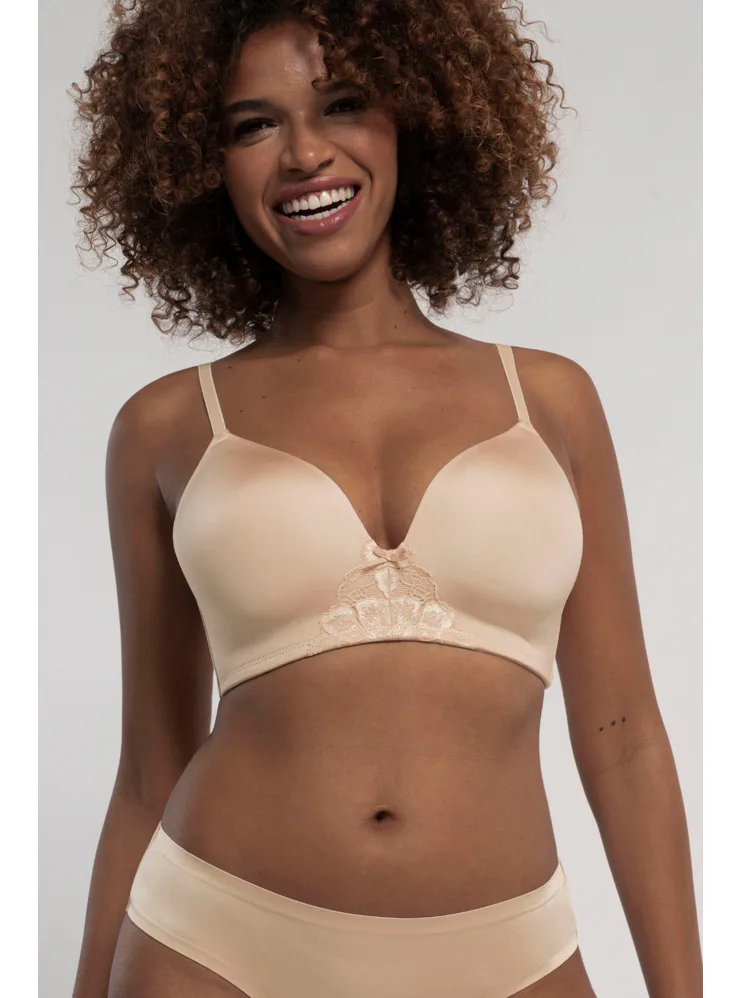 Telová podprsenka od nemeckej značky Dorina má hladké vystužené košíčky, ktoré sa vám nebudú rysovať pod oblečením. Bočné kostice sú nahradené flexibilnou výstuhou, ktorá sa lepšie prispôsobuje tvaru tela a pomáha udržovať tvar podprsenky. Má nastaviteľné ramienka a zadné zapínanie na dva háčiky s tromi polohami stiahnutia. Podprsenku je možné zaobstarať aj v bielej a čiernej farbe.