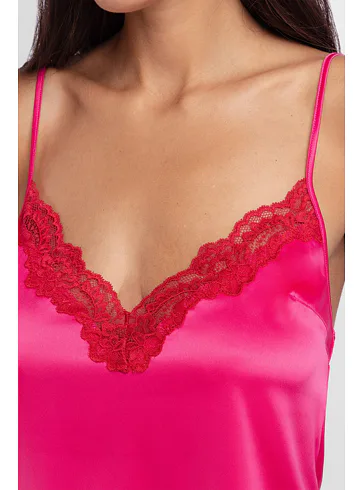 Nechajte sa rozmaznávať jemným saténom. Atraktívna ružová košieľka vytvára lichotivú siluetu a poskytuje maximálny komfort. Ideálne na spanie alebo ako sexy domáci odev. Výstrih do tvaru V zvýrazňuje zmyselná červená čipka. Dostupné vo veľkosti S-XL.