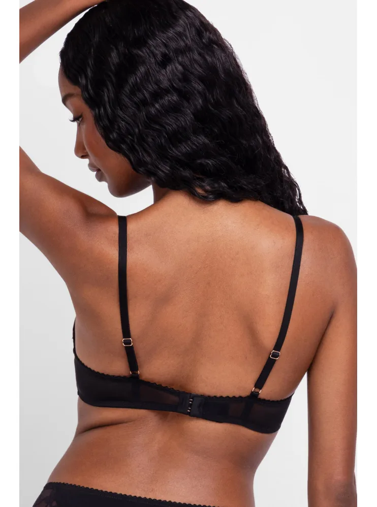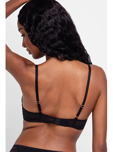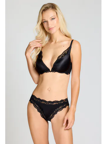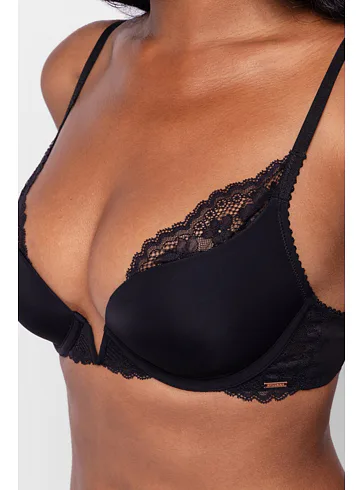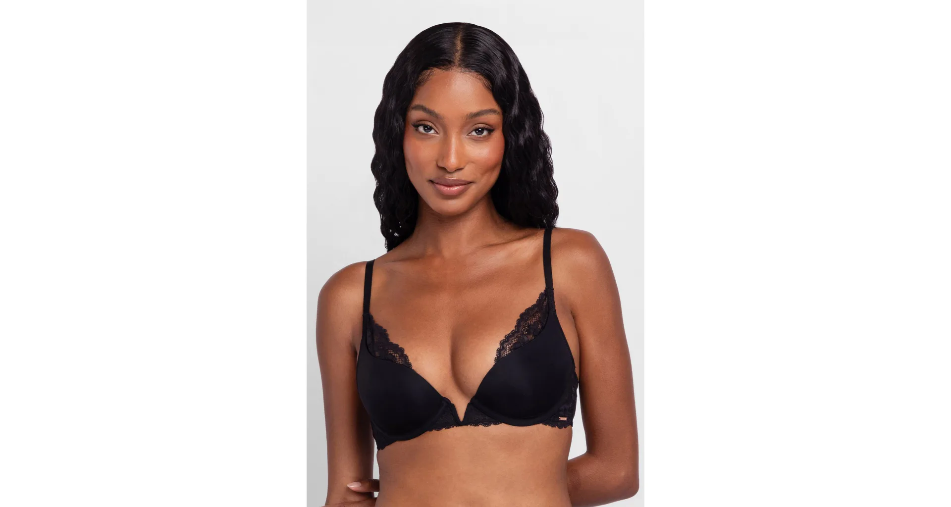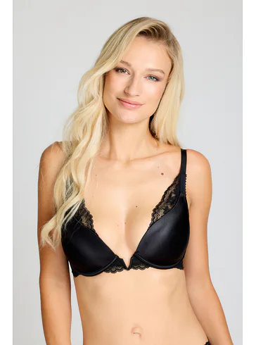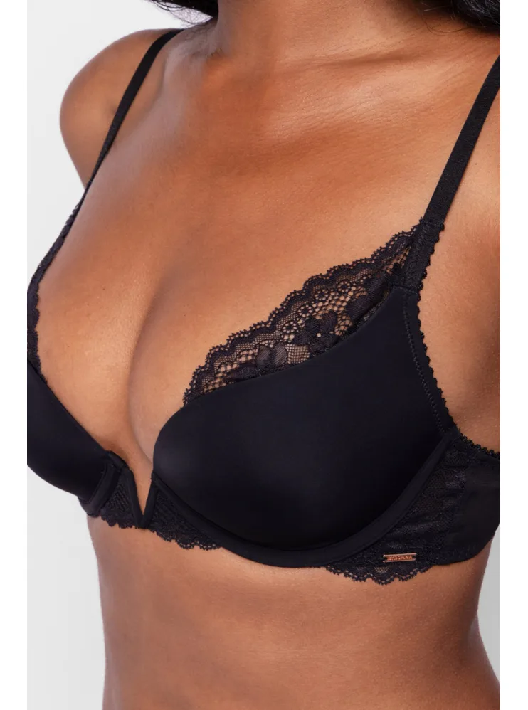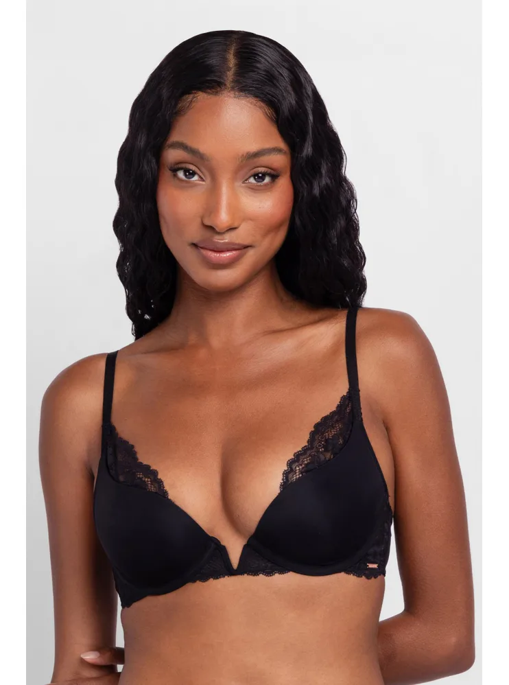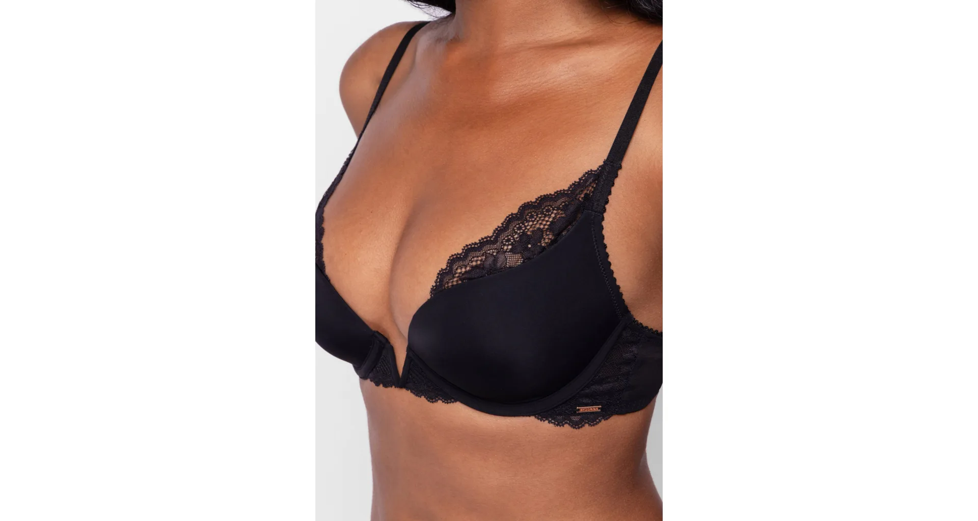 Doprajte si kombináciu komfortu a elegancie v čiernej tenko vystuženej podprsenke bez kostíc. Má veľmi nízky stred, ktorý nechá vyniknúť prirodzený tvar poprsia. Podprsenku zdobí čierna zmyselná čipka. Perfektný do hlbokých výstrihov.