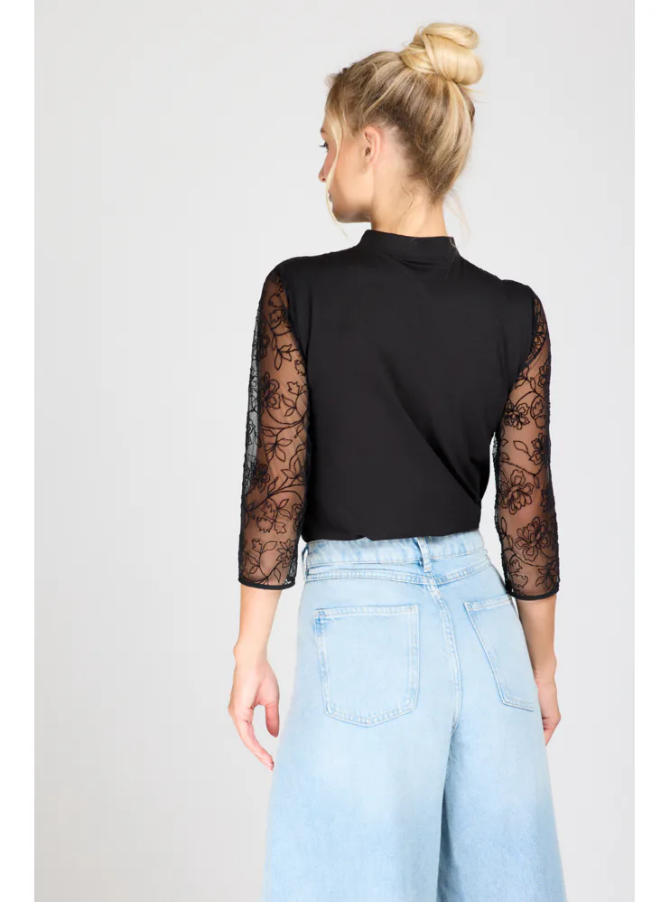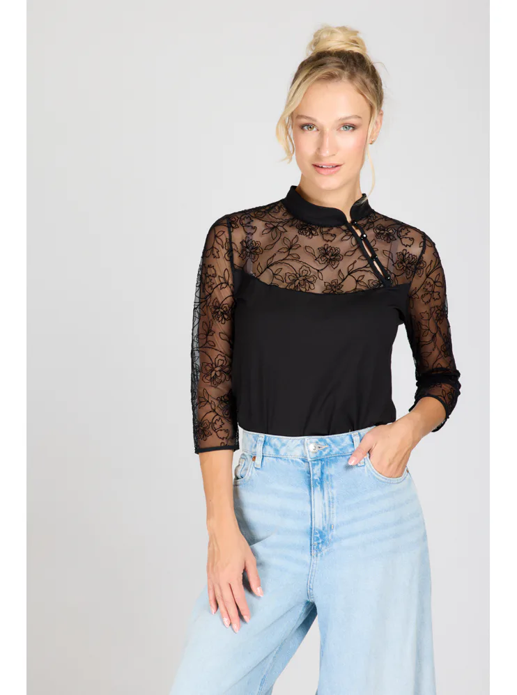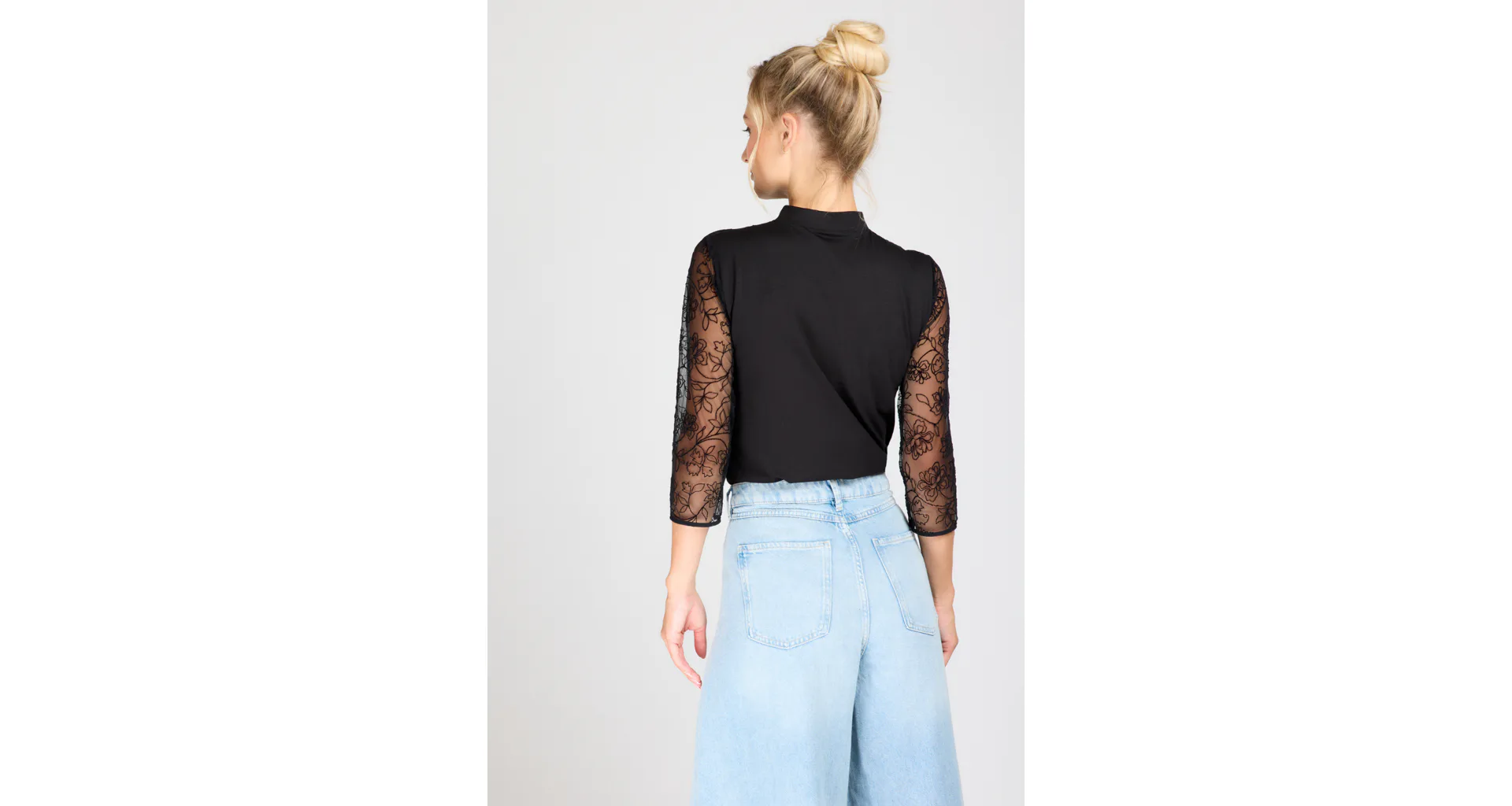 Objavte kúzlo nadčasovej elegancie v čiernej blúzke, ktorá zaujme na prvý pohľad jemným a prepracovaným dizajnom. Blúzka s trojštvrťovými rukávmi je vhodná na formálne aj neformálne príležitosti. Predstavuje spojenie ženskosti, štýlu a pohodlia.
