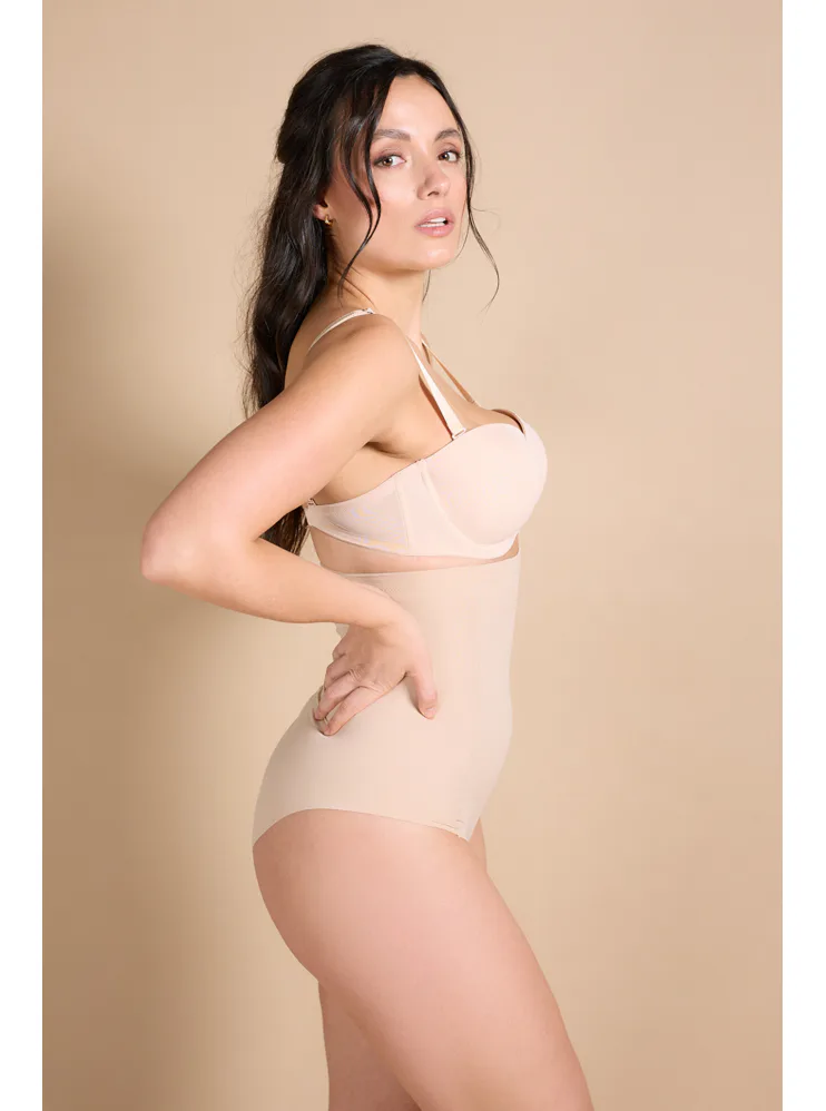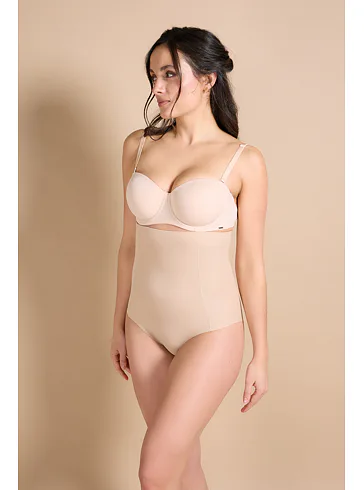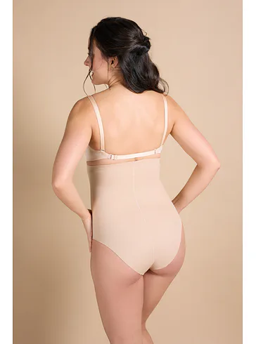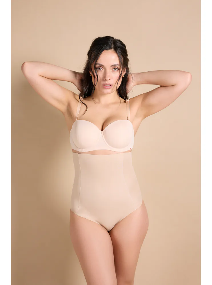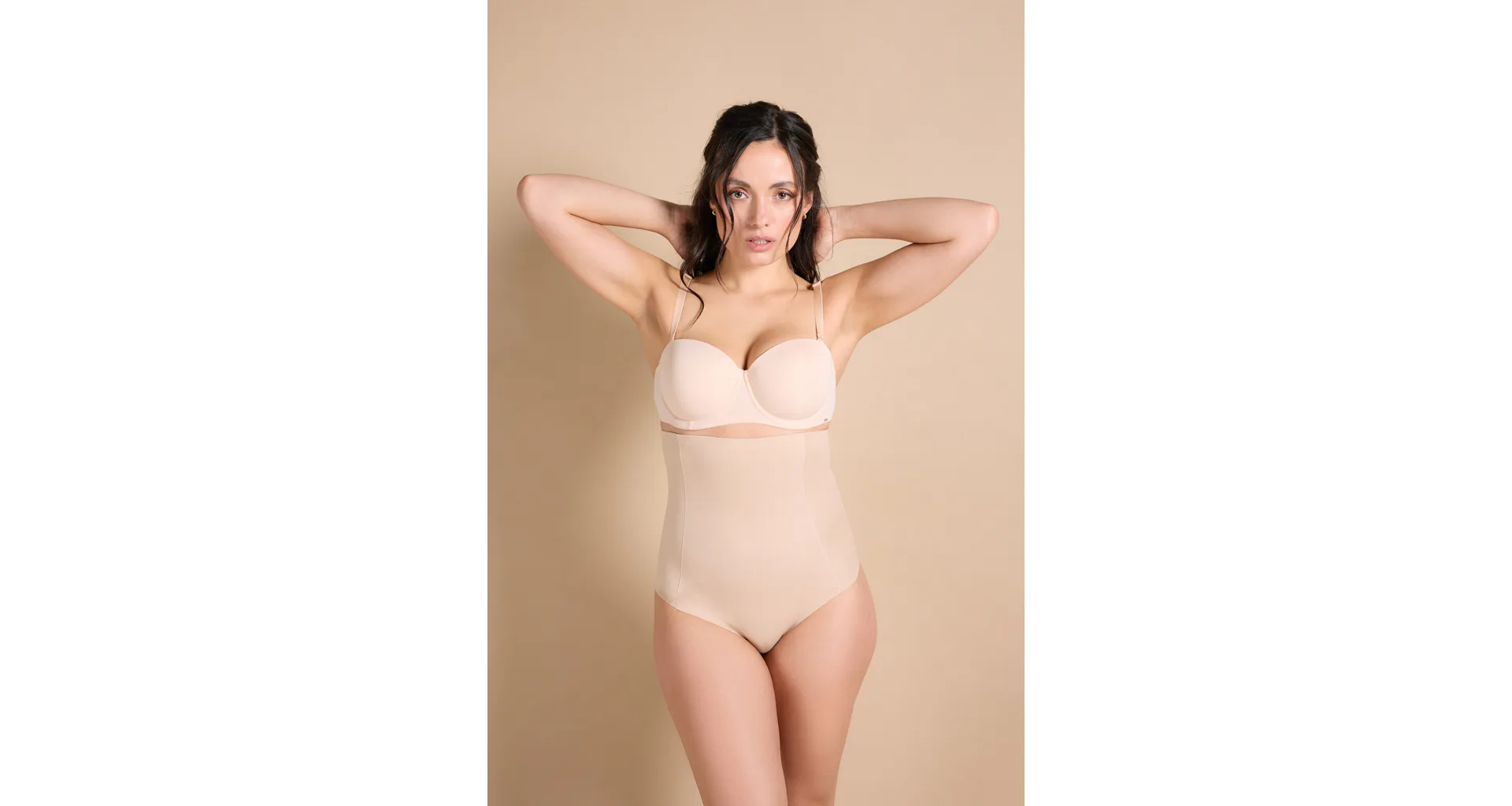 Kompresné nohavičky telovej farby majú na vnútornej strane pása silikónový bezpečnostný pás, ktorý zaisťuje, že zostanú na svojom mieste po celý deň. Vysoký strih pod prsiami krasne tvaruje celú oblasť bruška. Pre maximálne pohodlie a tvarovací efekt odporúčame vložiť horný okraj nohavičiek pod kostice a obvod podprsenky, čím sa zabezpečí dokonalé prispôsobenie a stabilita. V tejto spodnej bielizni sa budete cítiť sebavedomo, atraktívne a napriek tomu pohodlne.