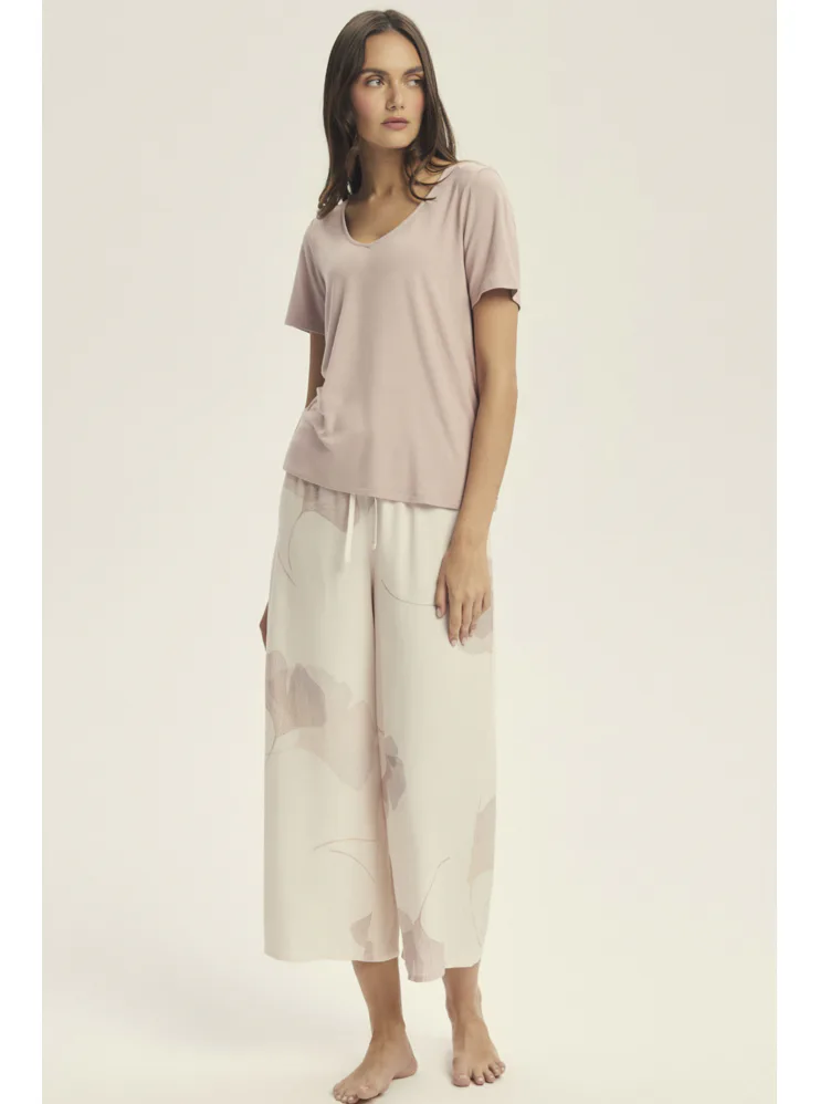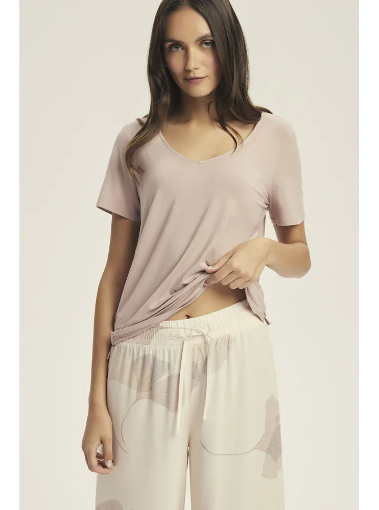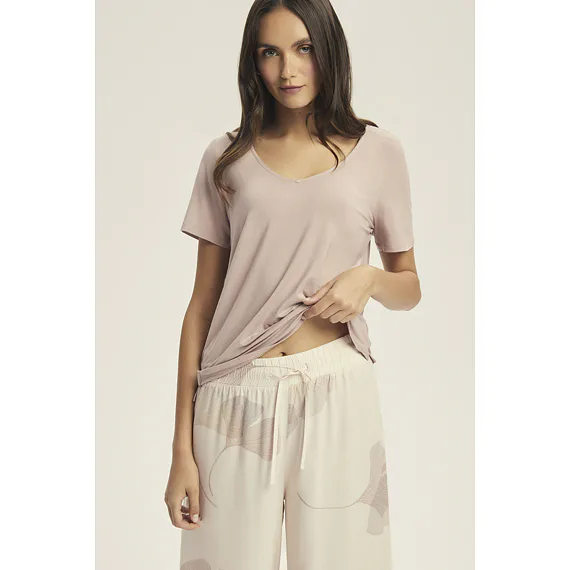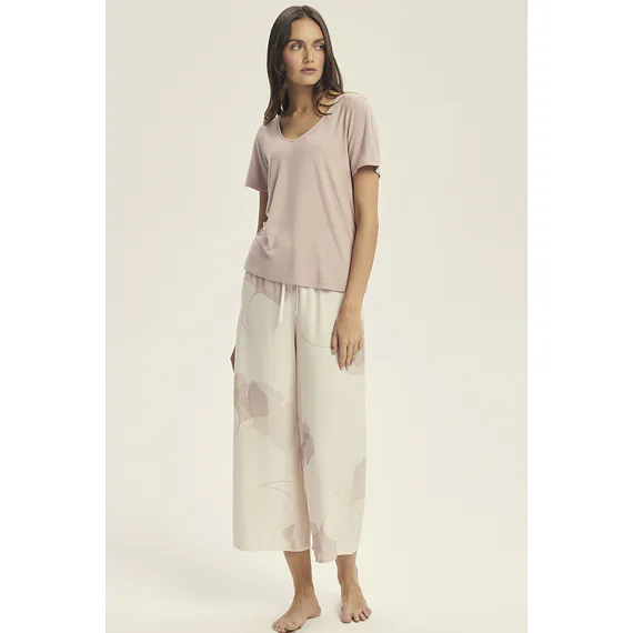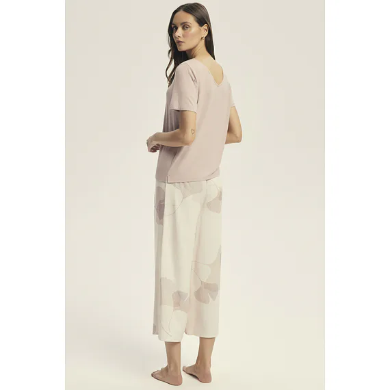 Vstúpte do sveta komfortu, dámske pyžamo si zamilujete na prvé obliekanie. Tričko s krátkym rukávom a okrúhlym výstrihom zaujme nadčasovým vzhľadom. Trojštvrťové nohavice s gumou a šnúrkou v páse sa dokonale prispôsobia vašej postave. K pyžamu je možné zaobstarať župan do setu.