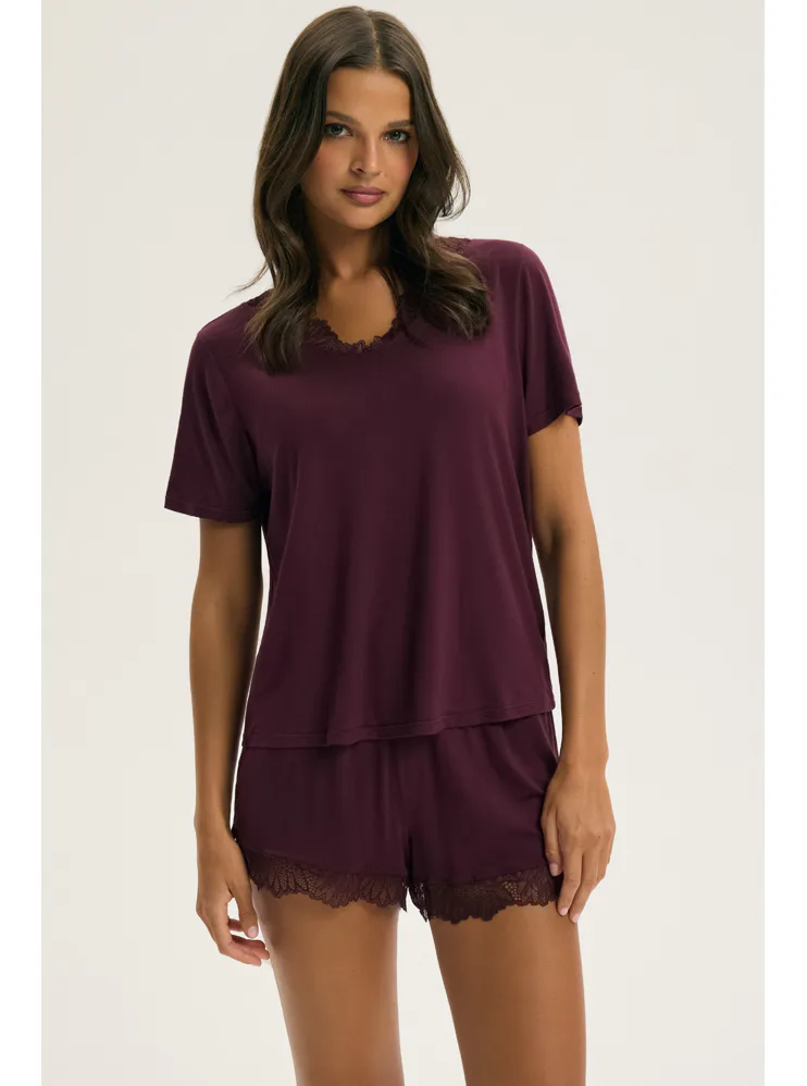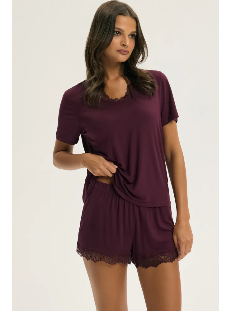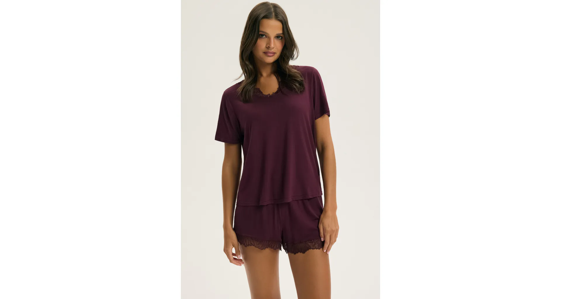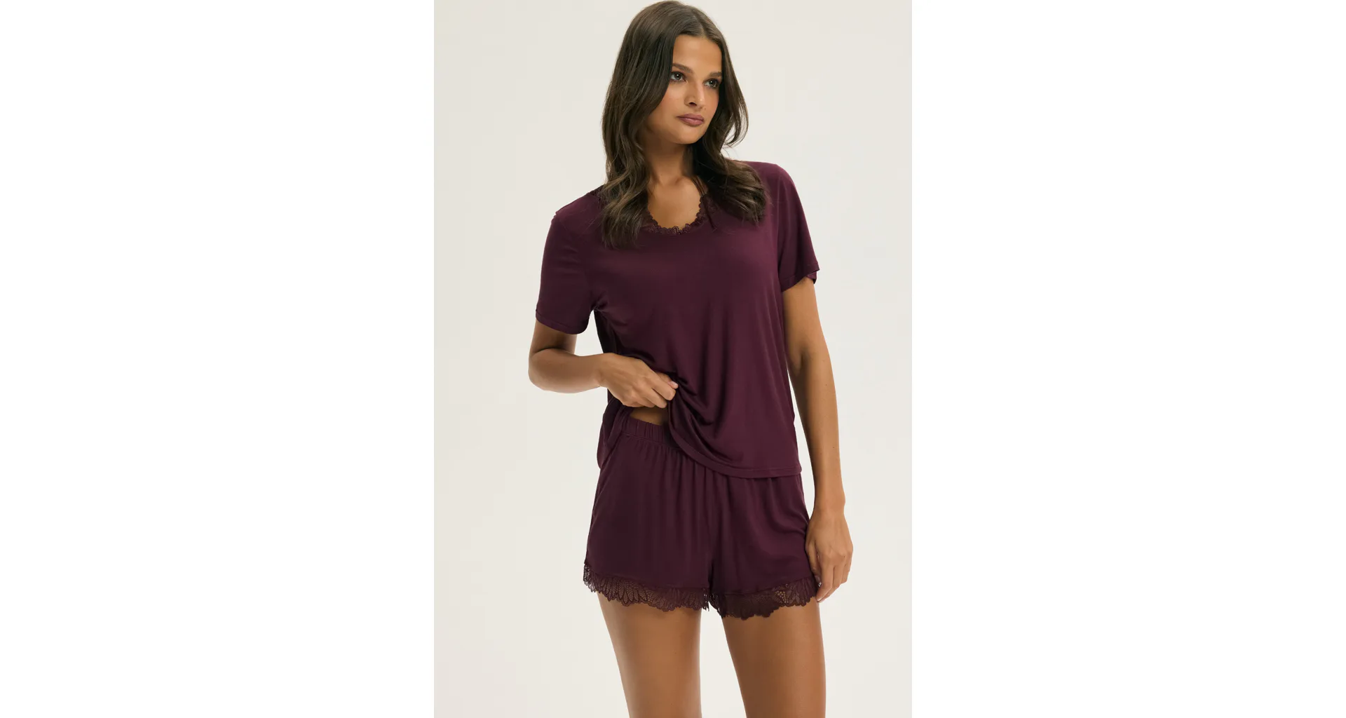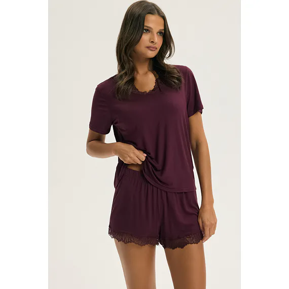 Hľadáte atraktívne a zároveň pohodlné pyžamo? Doprajte si vínové pyžamo, ktoré je vďaka viskóze a elastanu príjemné na dotyk a perfektne sa prispôsobí vašej postave. Tričko s krátkym rukávom a kraťasmi zdobí jemná čipka.