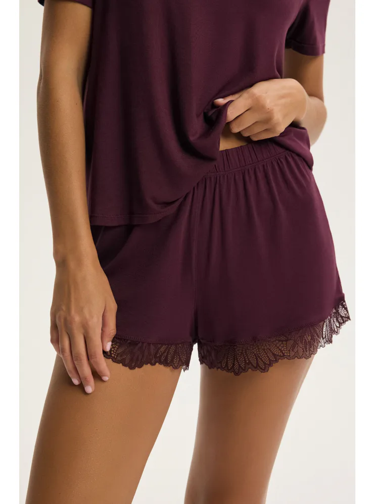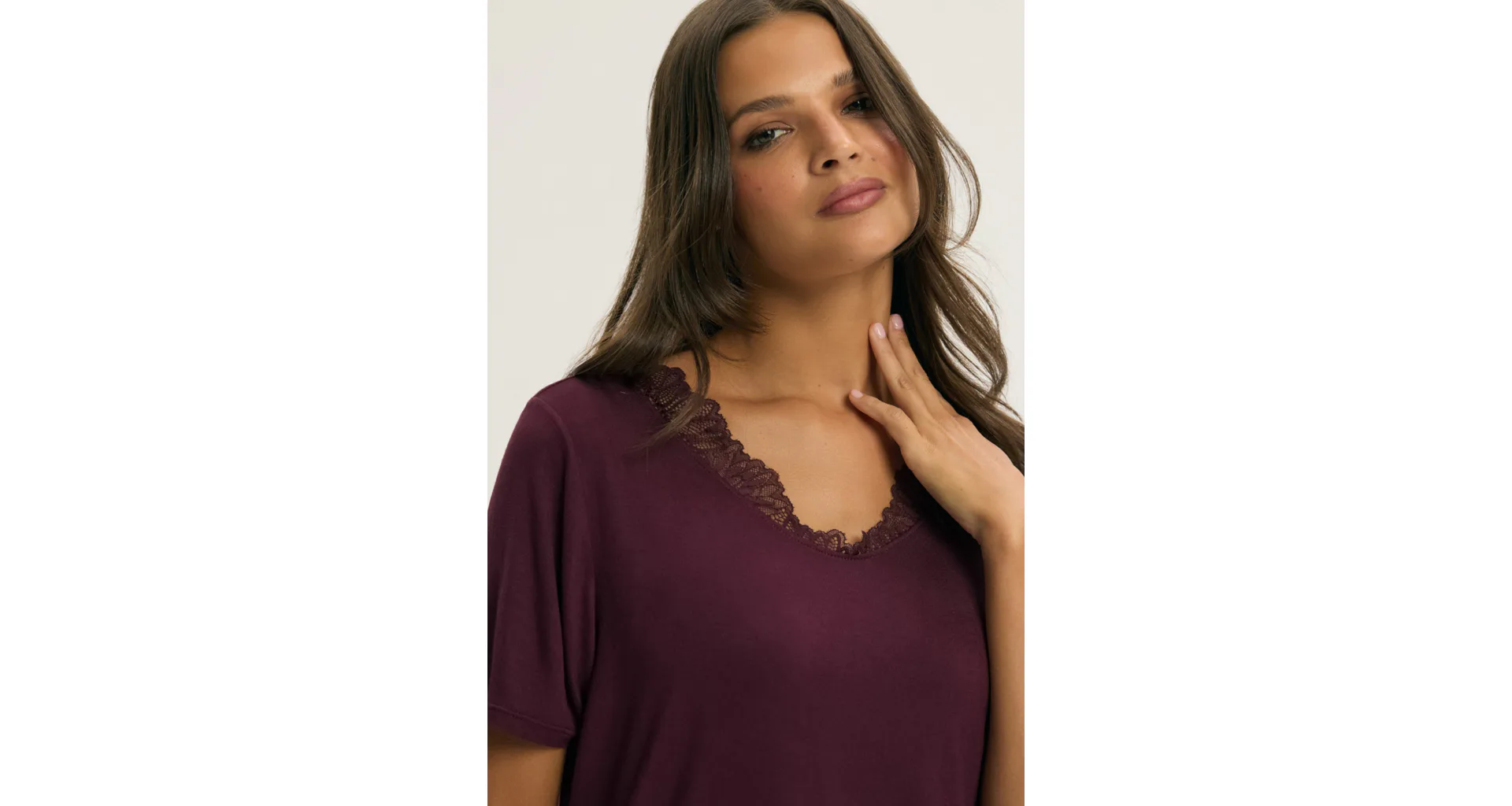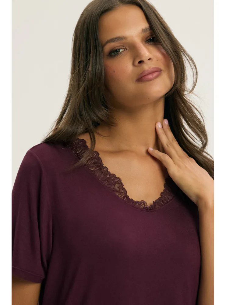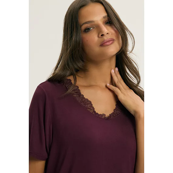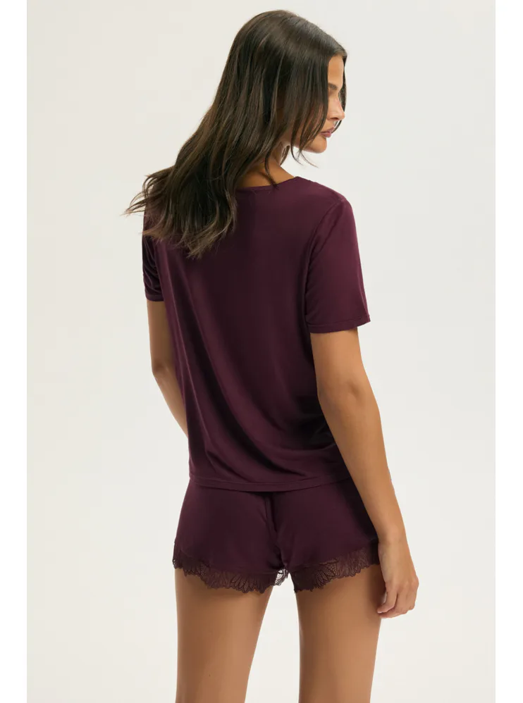 Hľadáte atraktívne a zároveň pohodlné pyžamo? Doprajte si vínové pyžamo, ktoré je vďaka viskóze a elastanu príjemné na dotyk a perfektne sa prispôsobí vašej postave. Tričko s krátkym rukávom a kraťasmi zdobí jemná čipka.