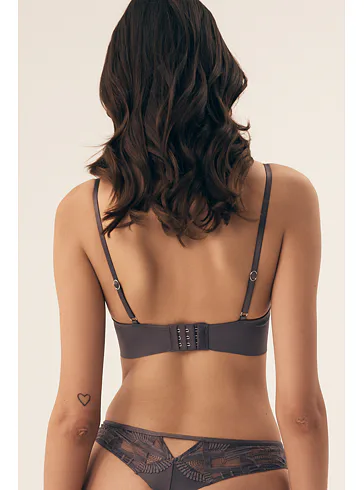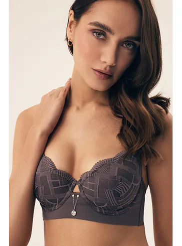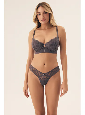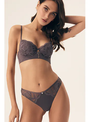 Sivá push-up podprsenka s kosticami poskytuje poprsiu potrebnú oporu. Udrží prsia v požadovanej výške a vytvorí atraktívnu siluetu. Zaujme vás čipkovanými košíčkami a lesklým príveskom, ktorý dodá podprsenke luxusný vzhľad. Opticky zväčší poprsie a zvýrazní váš dekolt. Má klasické nastaviteľné ramienka a zapínanie na háčik vzadu. Chcete kompletnú súpravu spodnej bielizne? Kúpte si klasické nohavičky alebo tangá v rovnakom dizajne, ktoré sa hodia k podprsenke.