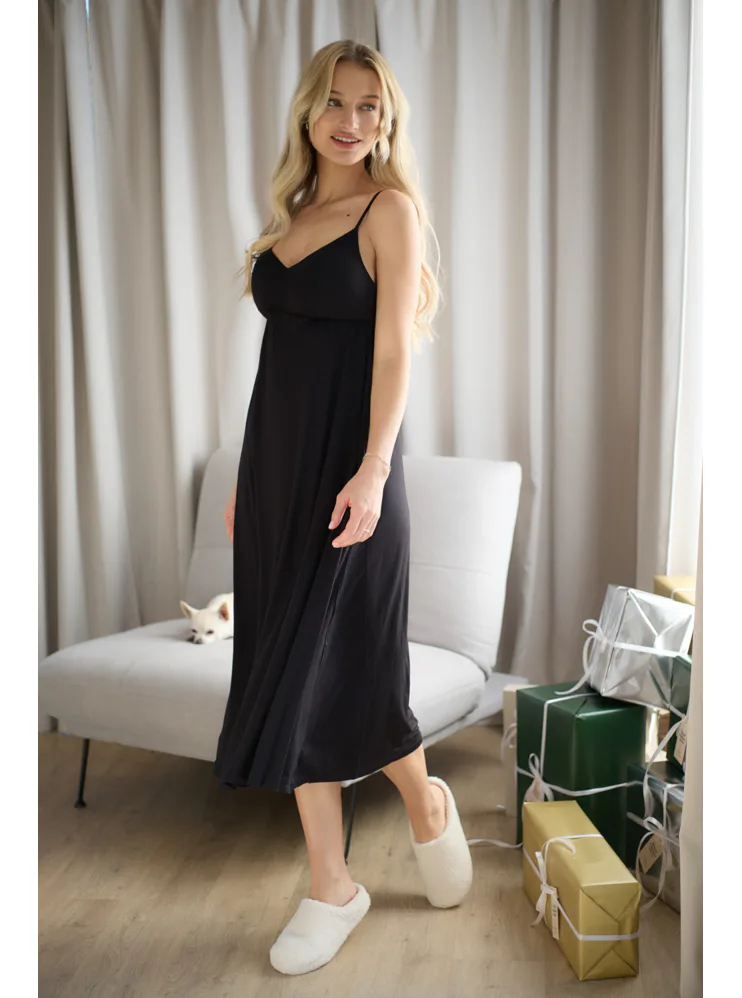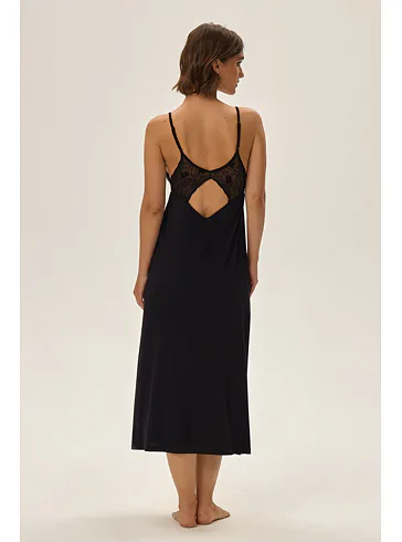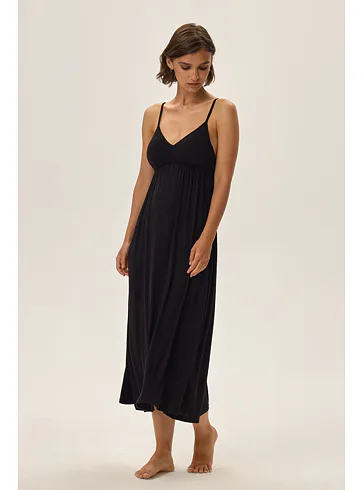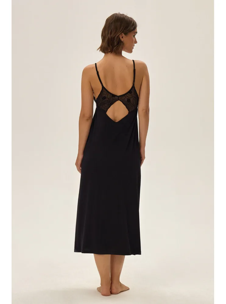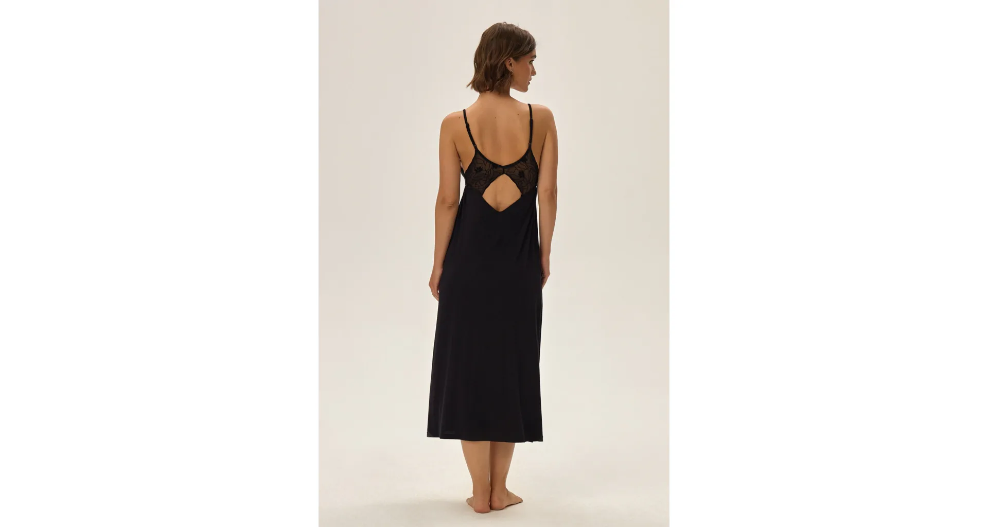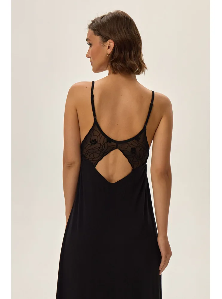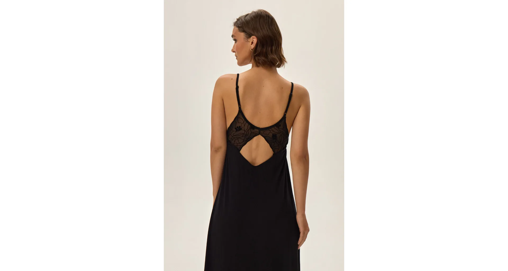 Nočná čierna košeľa s vystuženými košíčkami bez kostíc prsia príjemne zafixuje a pritom poskytuje maximálny komfort. Viskózový materiál zaujme svojou mäkkosťou, priedušnosťou, a dokonca aj trochu chladí. Šmrnc dodáva košieľke ozdobný tyl na chrbte.