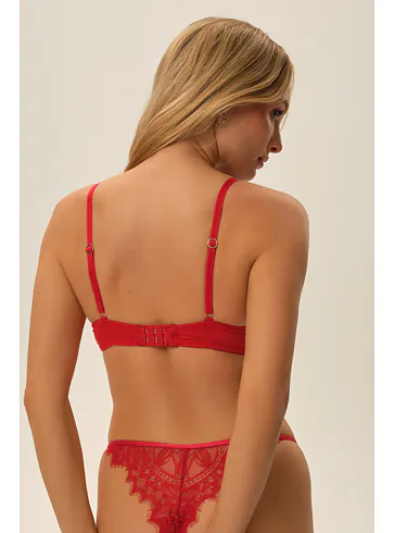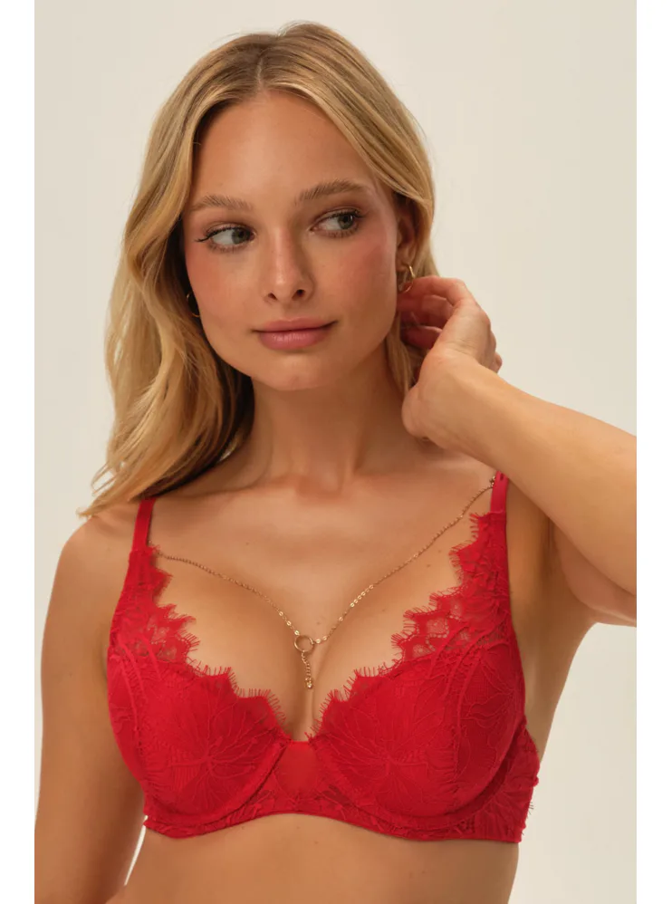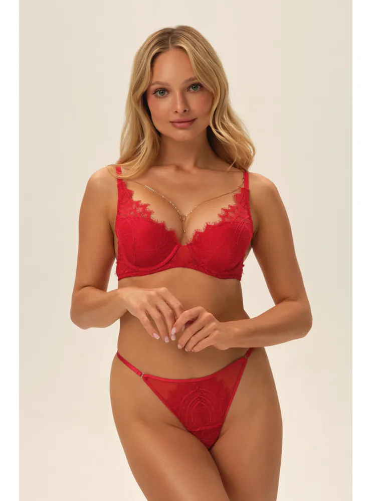 Rafinovaná podprsenka s push-up efektom opticky zväčší poprsie až o jednu veľkosť. V prednej časti podprsenku zdobí odopínateľná retiazka, ktorá upúta pozornosť a zvýrazní váš dekolt. Červená podprsenka nikdy nevyjde z módy, je symbolom ženskosti a zmyselnosti. K tejto podprsenke si možno zaobstarať nohavičky v rovnakom dizajne.