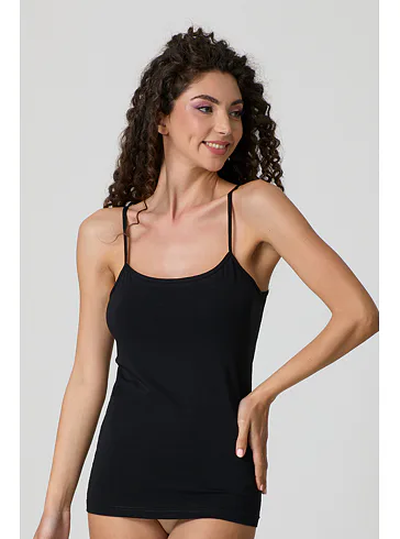 Elastický top predstavuje spojenie pohodlia a elegancie. Dokonale sa prispôsobí vašej postave, nosiť ho môžete doma aj do práce. Čierne tielko je vyrobené z bavlny, modalu a elastanu, ktoré umožňujú pokožke voľne dýchať a zaisťujú príjemný pocit pri nosení.