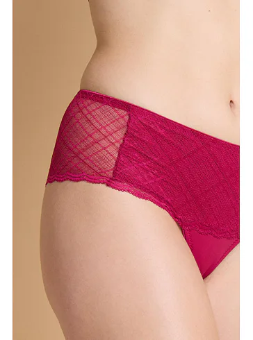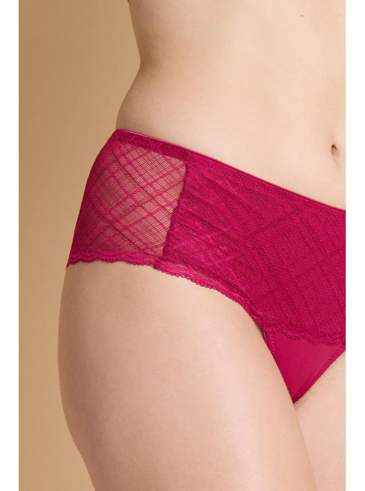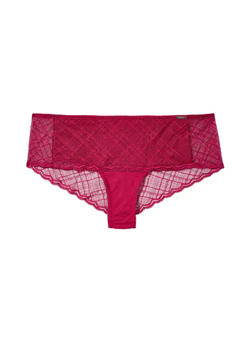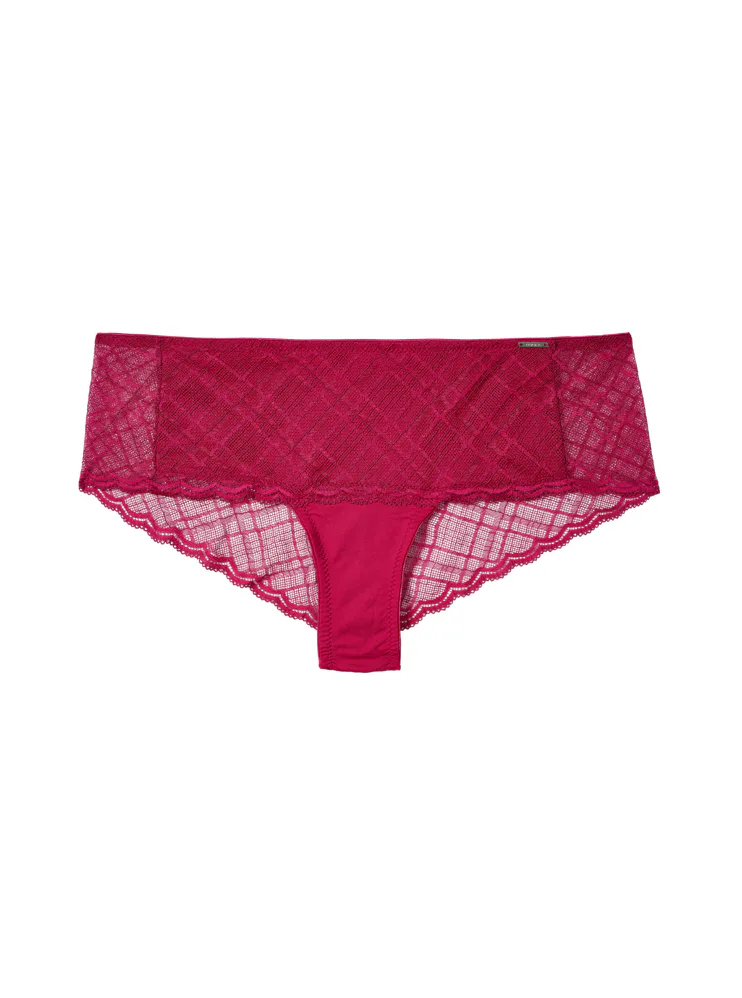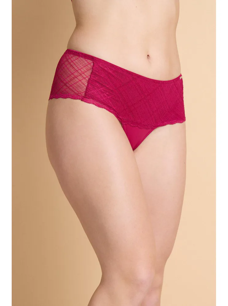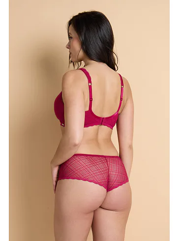 Nohavičky panty v karmínovej farbe zdobí čipka, ktorá im dodáva romantický nádych. Nohavičky Aurora sú ideálne na každodenné nosenie, vhodné aj pre plné tvary. Vytvoria sexi okrúhly zadoček, nikde neškrtia a nezarezávajú sa. Tento strih je medzi ženami veľmi obľúbený, perfektne padne a zaručí pohodlie. K nohavičkám si možno zaobstarať aj podprsenku v karmínovej farbe z rovnakej kolekcie.
