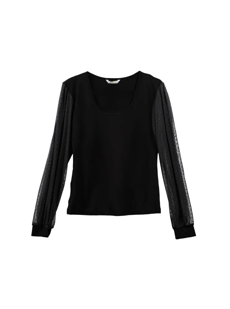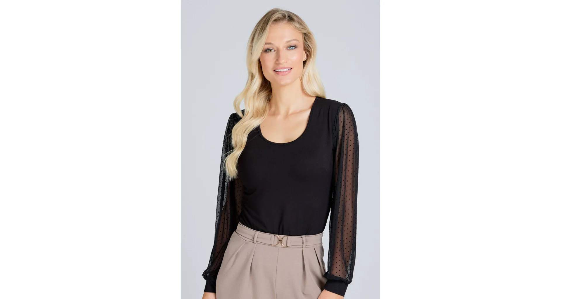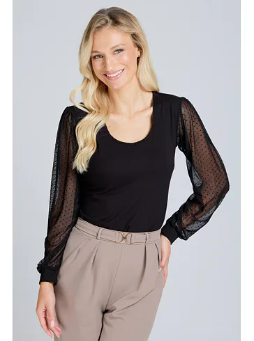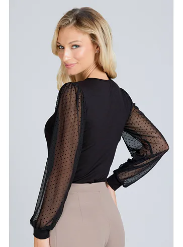 Dámska blúzka z viskózy je hebká, vzdušná a dobre odvádza vlhkosť. Dlhé rukávy z tylu zdobí bodkovaný vzor, ktorý modelu dodáva hravý a štýlový vzhľad. Blúzka vyzerá skvele s elegantnými nohavicami, sukňou alebo s džínsami.
