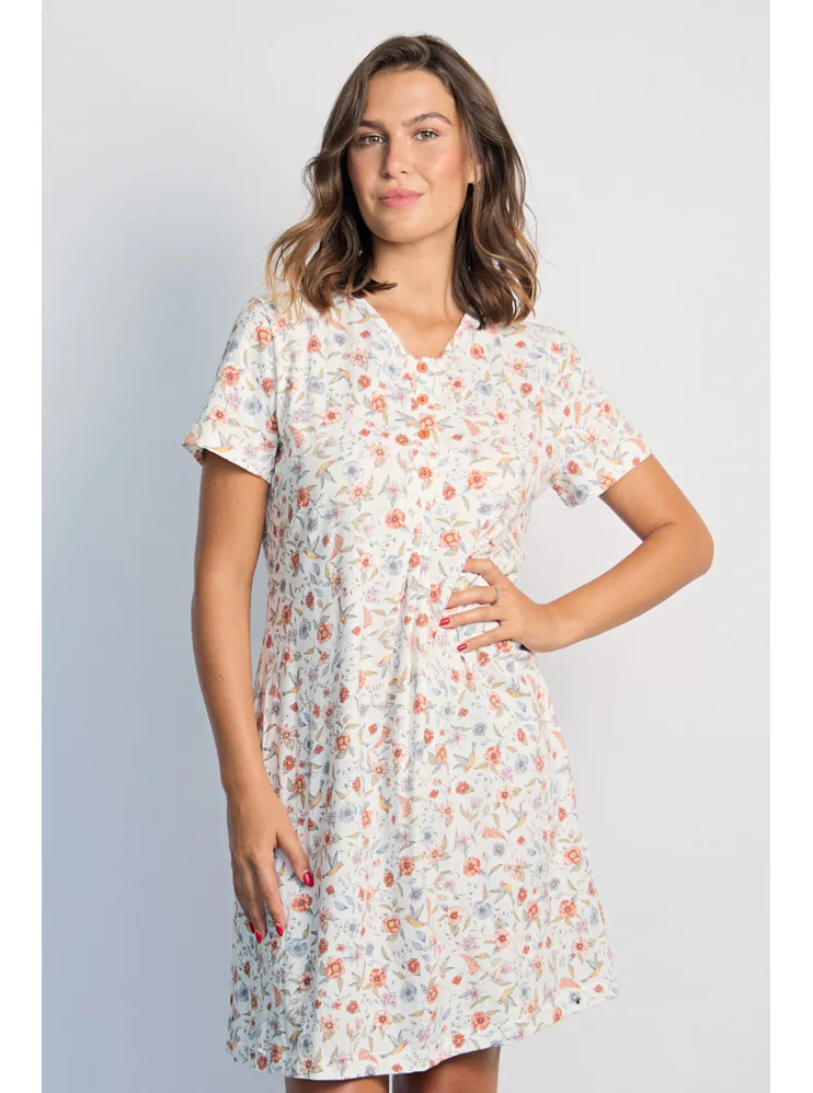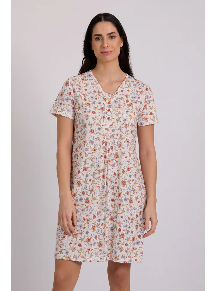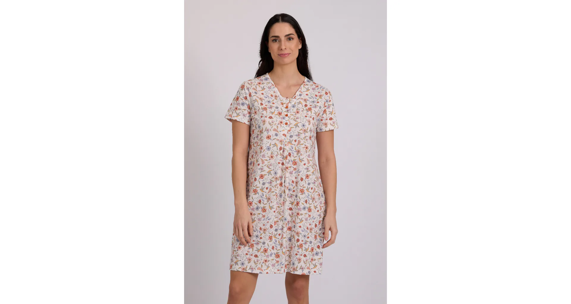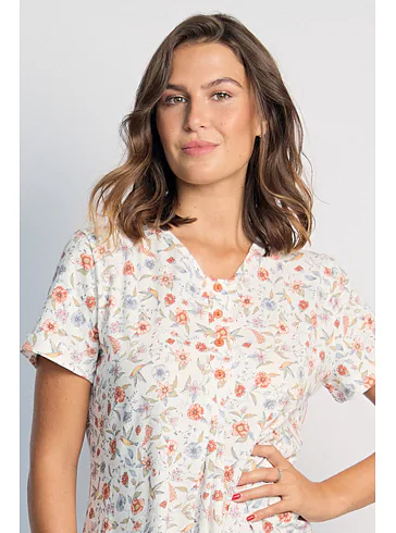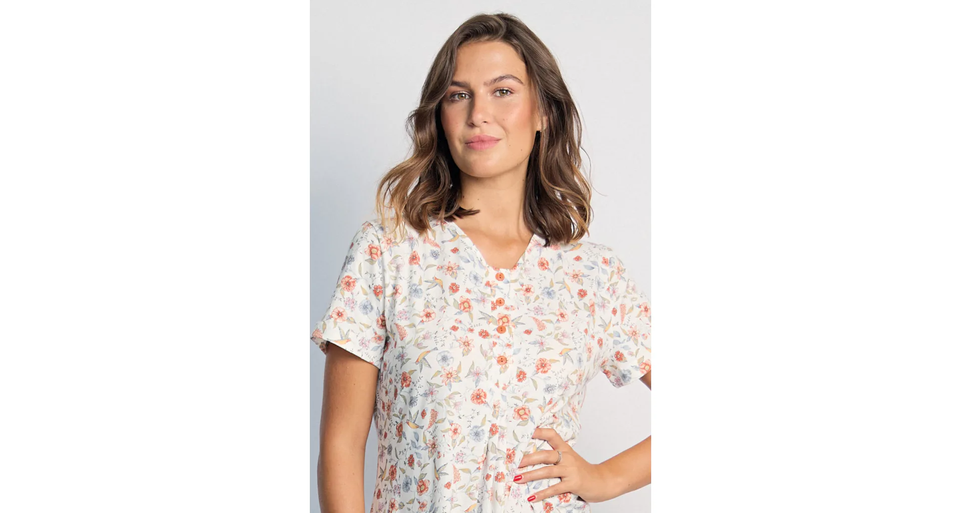 Nočná dámska košeľa z príjemného bavlneného úpletu vám zaistí pokojný spánok. Košeľa s kvetinovým vzorom má voľný strih do A, vďaka ktorému je vhodná pre všetky typy postáv.