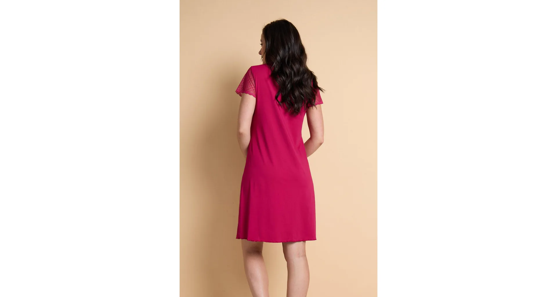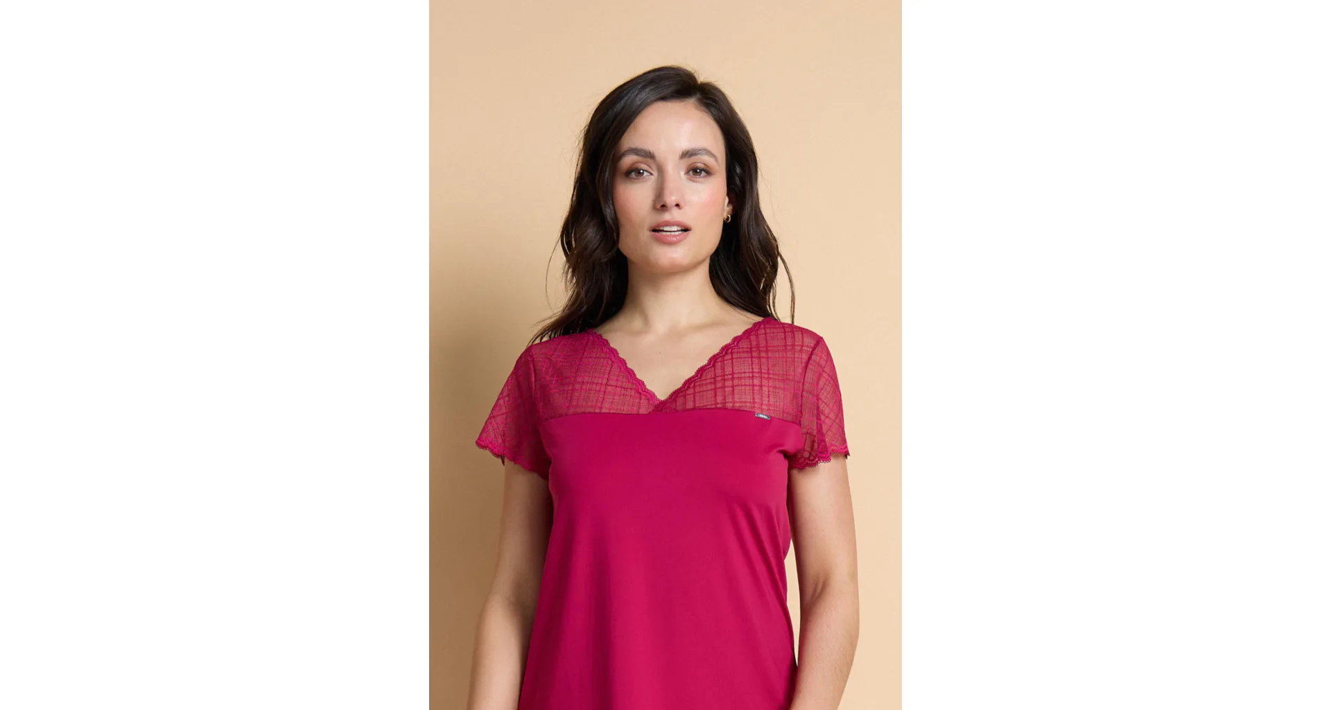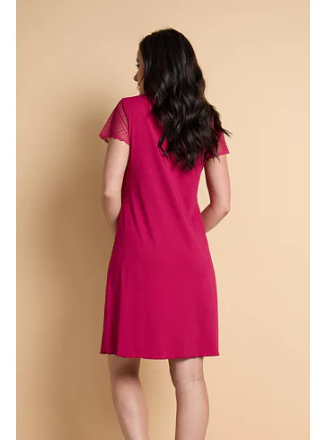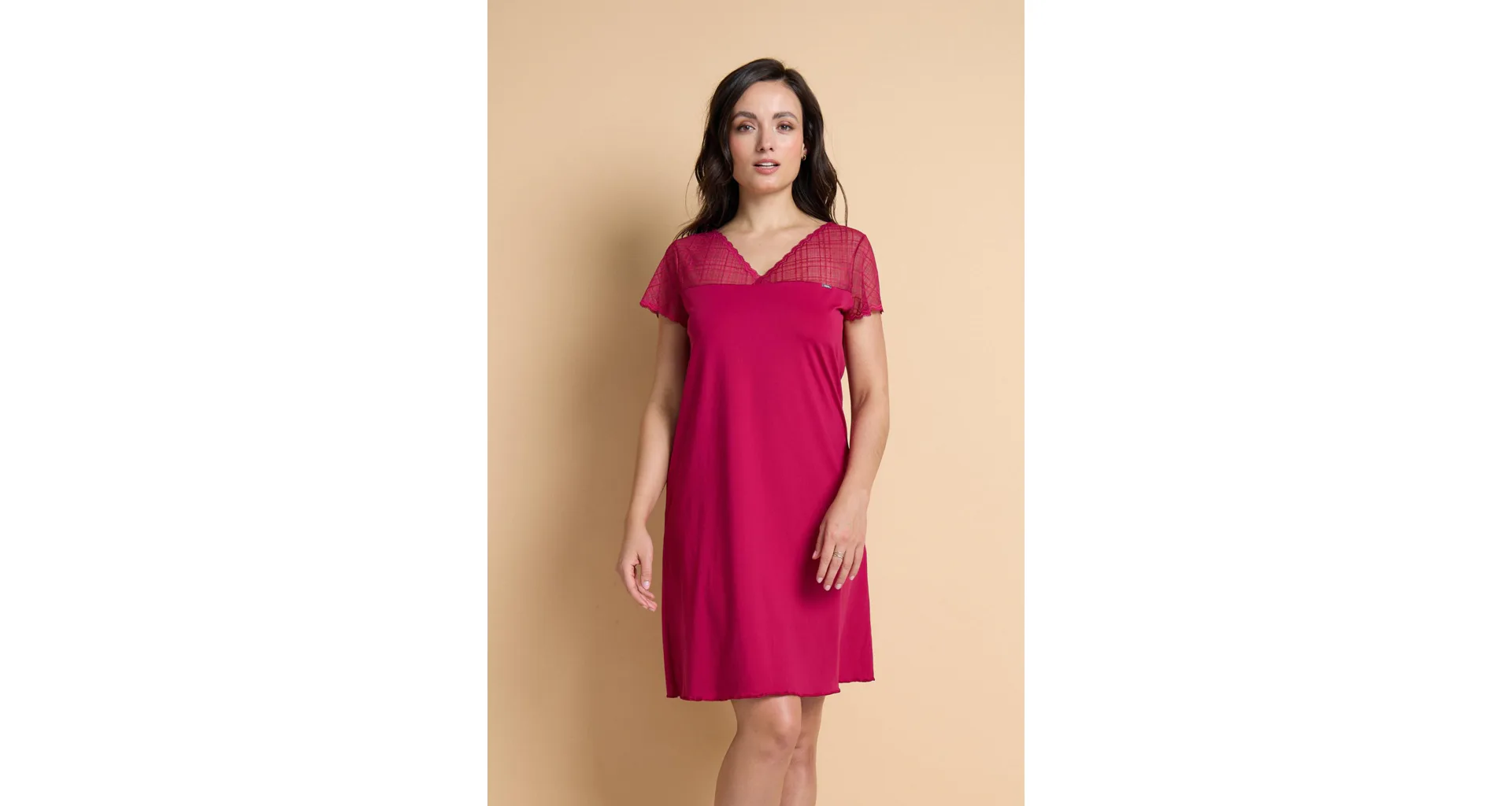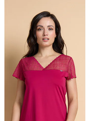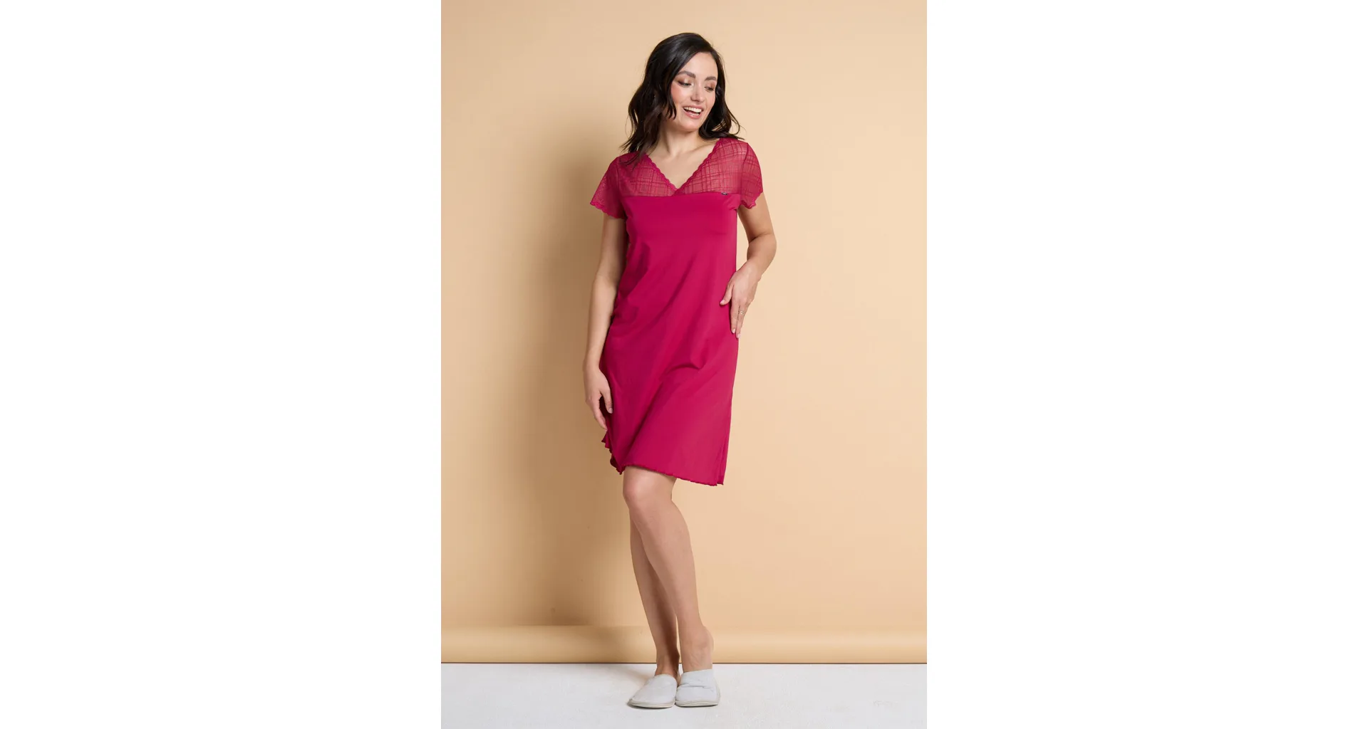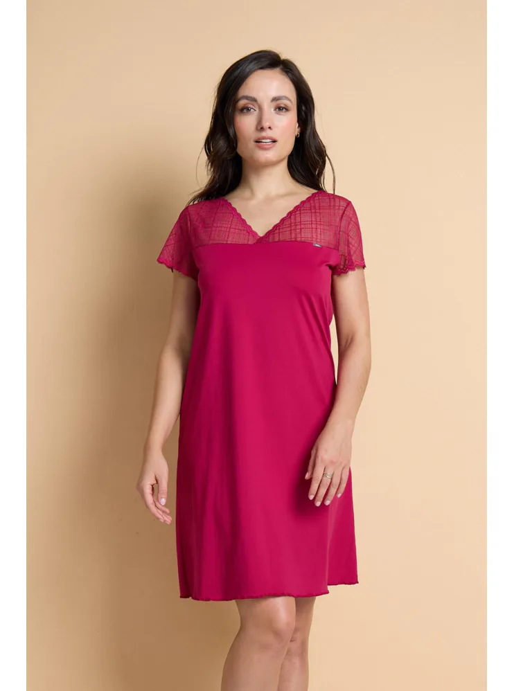 Karmínová nočná košieľka je vyrobená z mikromodalu (prírodné vlákno z bukových pilín), ktorý vyniká jemnosťou a pružnosťou. Košielka voľnejšieho strihu siaha ku kolenám a zaujme jemnou čipkou v hornej časti. Košieľku znosíte nielen na spanie, využitie má aj ako elegantný domáci odev. Objednajte si košieľku na e-shope, vyskúšajte zadarmo na akejkoľvek našej predajni.