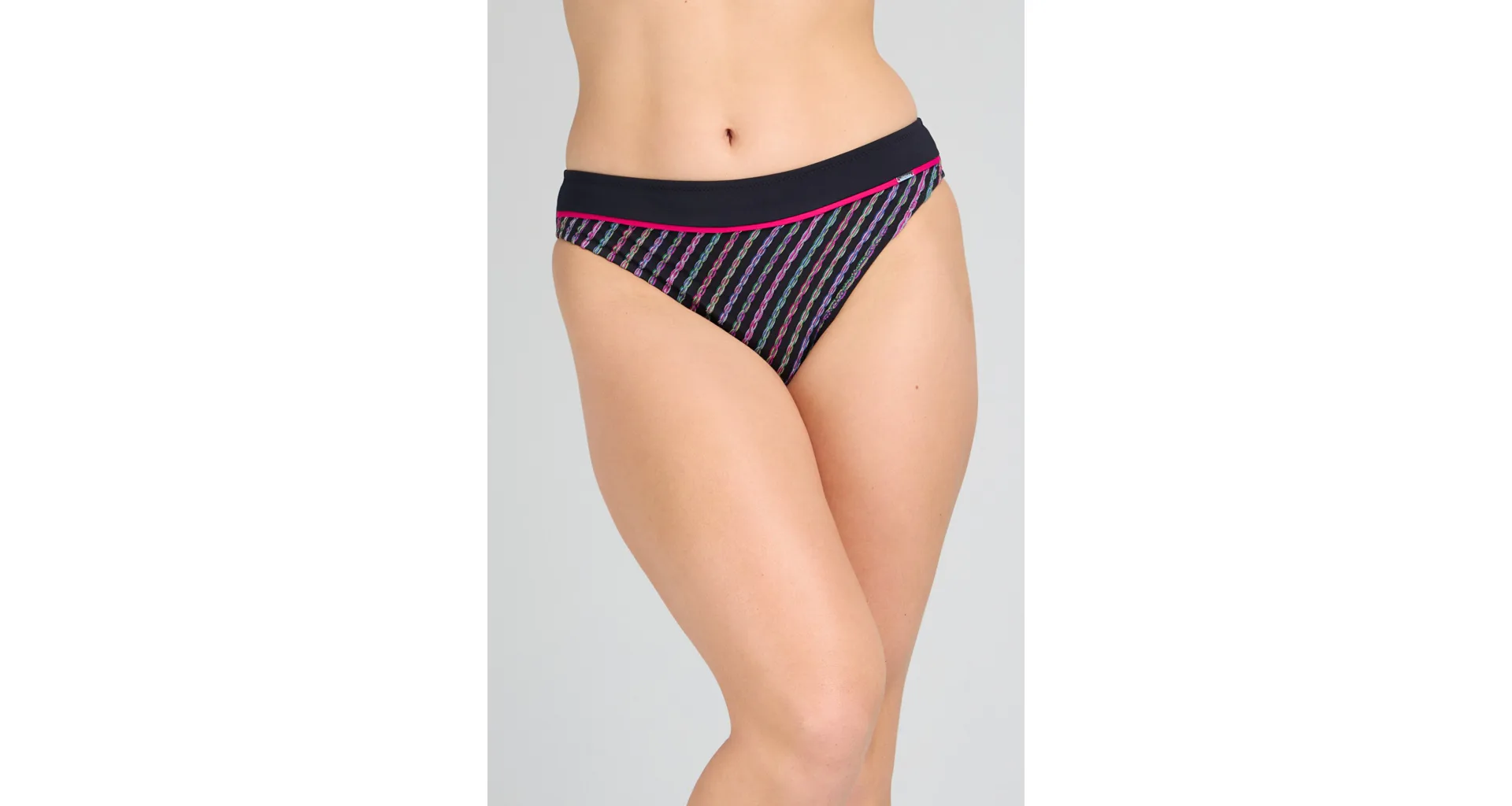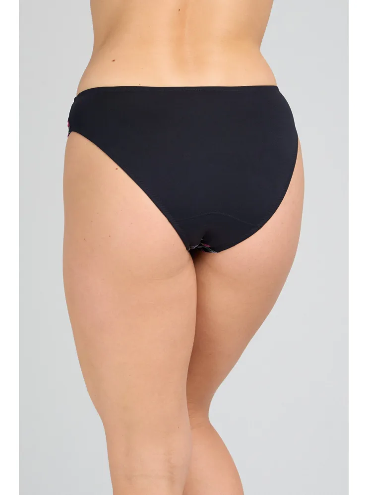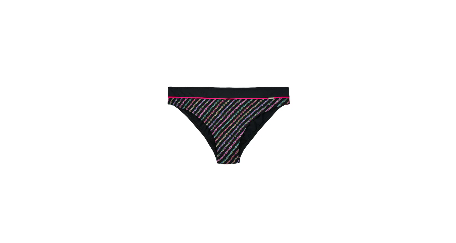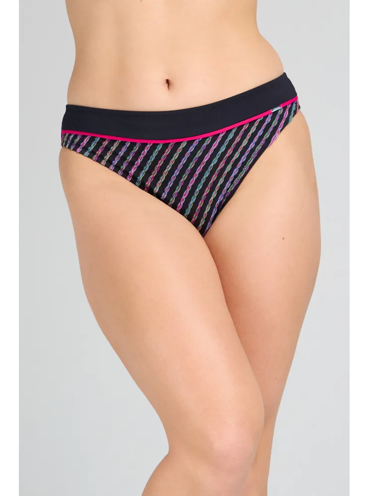 Plavkové nohavičky majú klasický strih, podčiarknu prirodzené ženské krivky a zaujmú farebným 3D vzorom na čiernom podklade. Horný čierny lem zdobí jemná ružová linka. plaviek Bliss.
