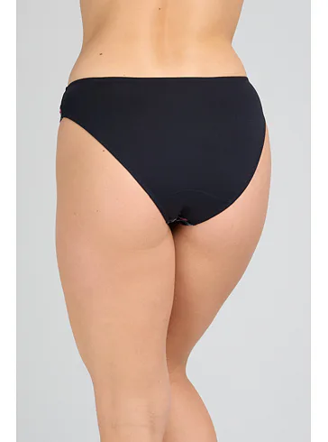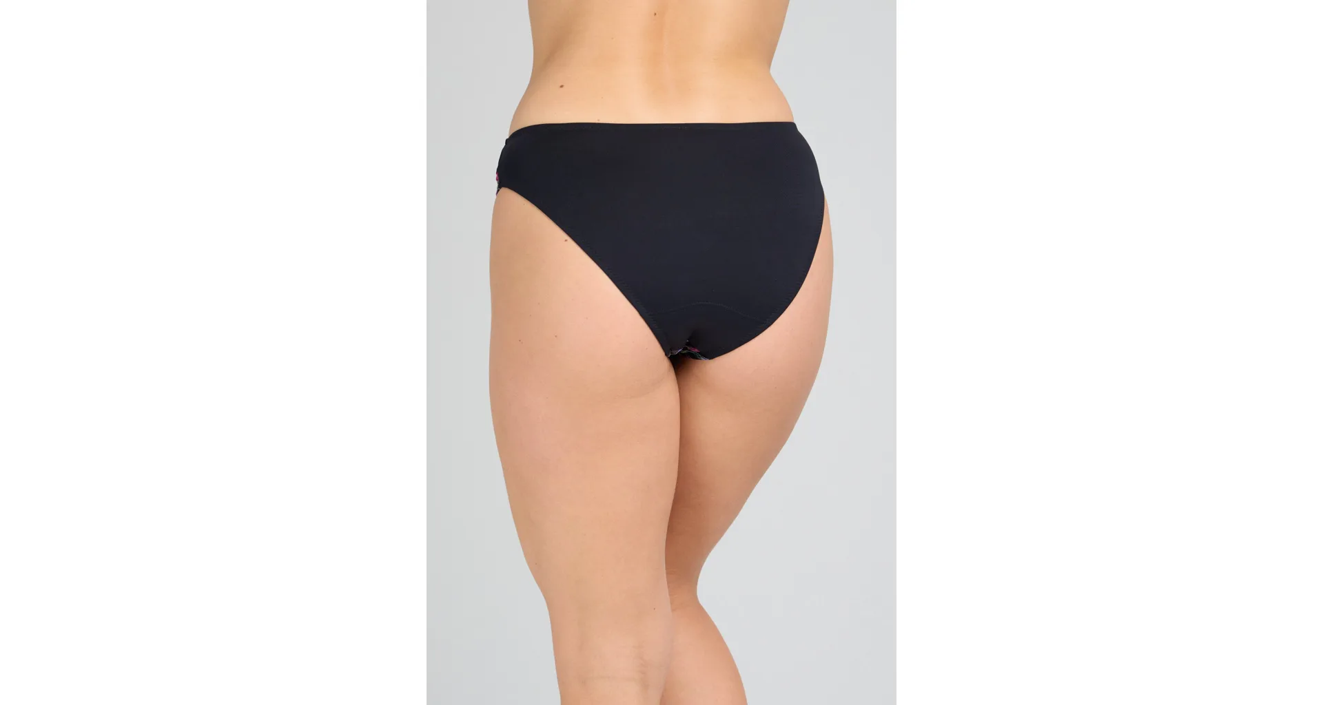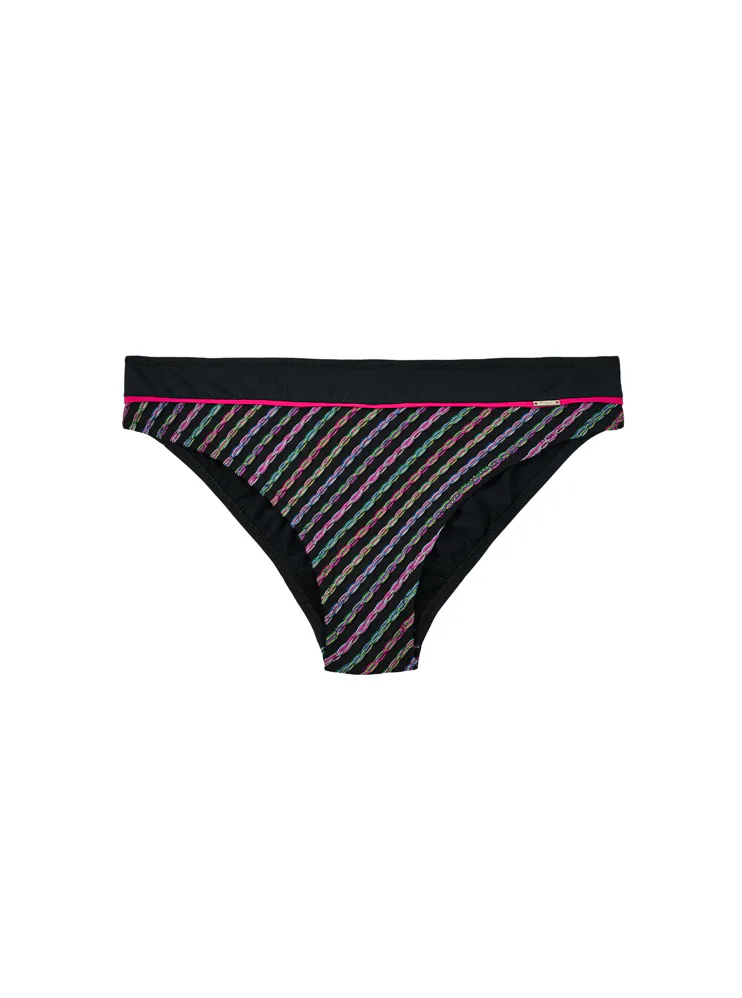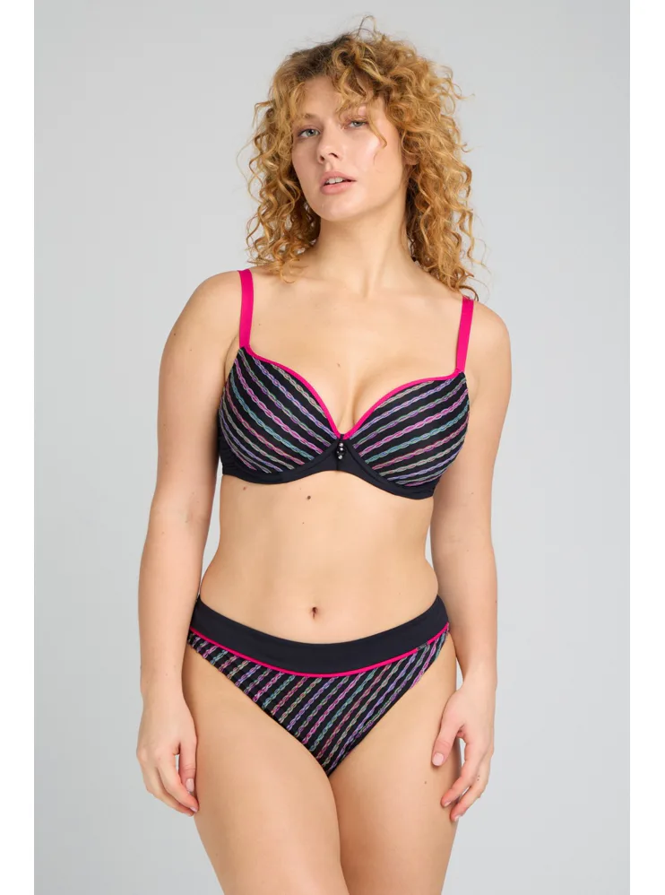 Plavkové nohavičky majú klasický strih, podčiarknu prirodzené ženské krivky a zaujmú farebným 3D vzorom na čiernom podklade. Horný čierny lem zdobí jemná ružová linka. plaviek Bliss.