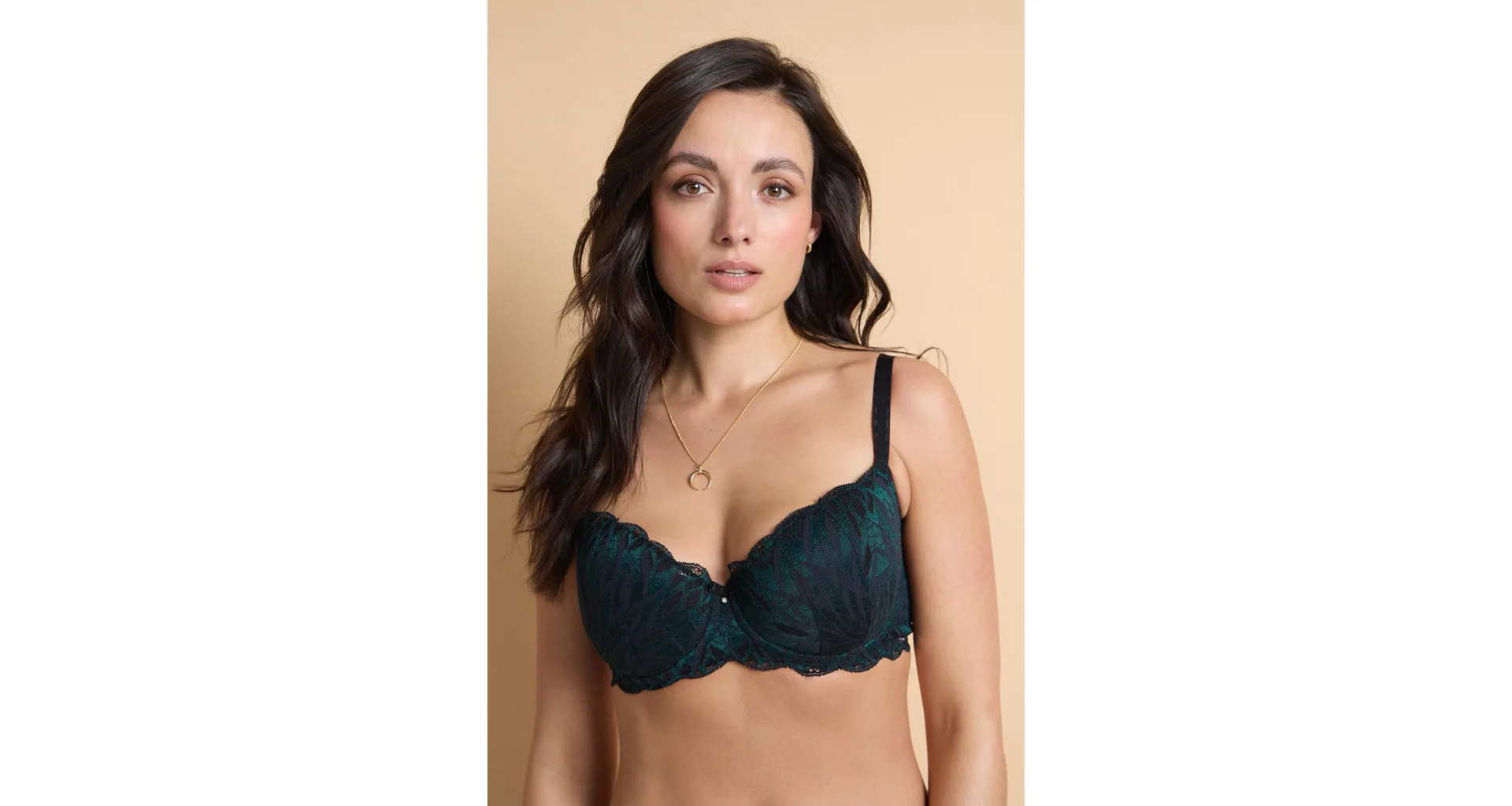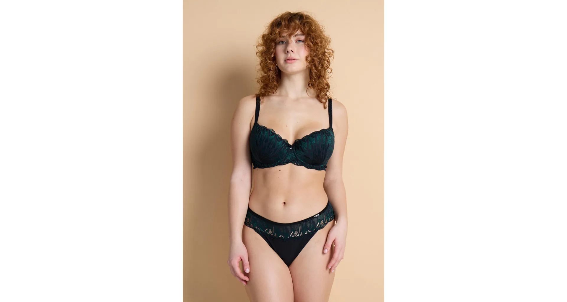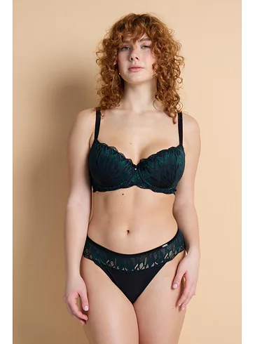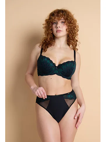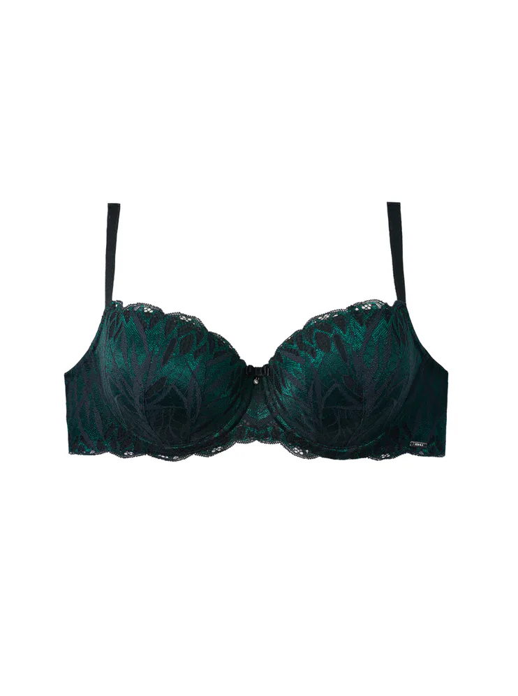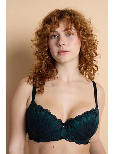 Podprsenka v strihu Sexy-Fit sa vďaka všitým flexi kosticiam prispôsobí každému vášmu pohybu, vytvorí neodolateľný hlboký dekolt a nikde netlačí. Jemné vystuženie krásne zaoblí vaše prsia. Strih balcony je medzi ženami veľmi obľúbený. Urobte si radosť celokrajkovou podprsenkou z elegantnej čierno-zelenej čipky. Žakárové ramienka možno nastaviť podľa potreby a zapínanie je vzadu na háčiky. Podprsenku je možné zakúpiť vo veľkosti B až H.