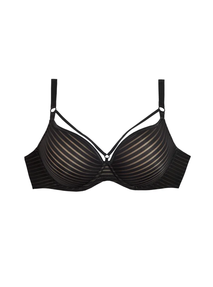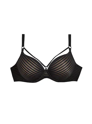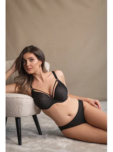 Hladká podprsenka zaujme sexi opasky, ktoré jej dodávajú šmrnc. Poskytne potrebnú oporu a dokonale sa prispôsobí vašim krivkám. Úplet čiernej podprsenky využíva efekt striedajúcich sa plných a priesvitných prúžkov, ktoré vytvárajú elegantný vzhľad.