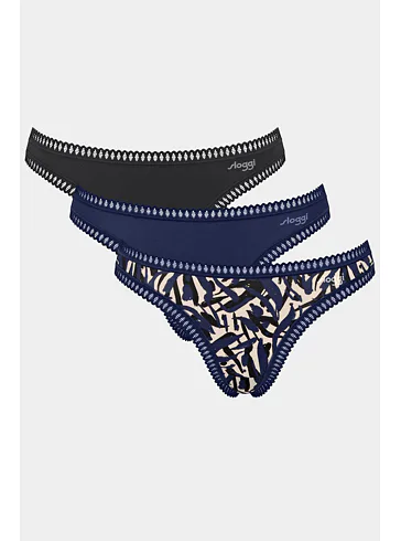 Výhodné balenie troch kusov táng je ideálne na každodenné nosenie. Bavlnené tangá v modrej, čiernej a vzorovanej variante zdobia jemné kontrastné lemovanie, ktoré im dodáva elegantný vzhľad. Vykúzli neodolateľné pozadie a zaistí pohodlie pri nosení.