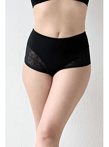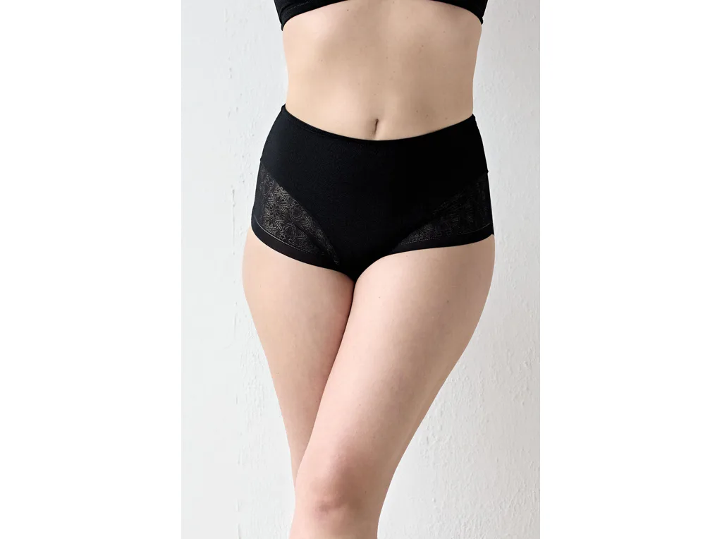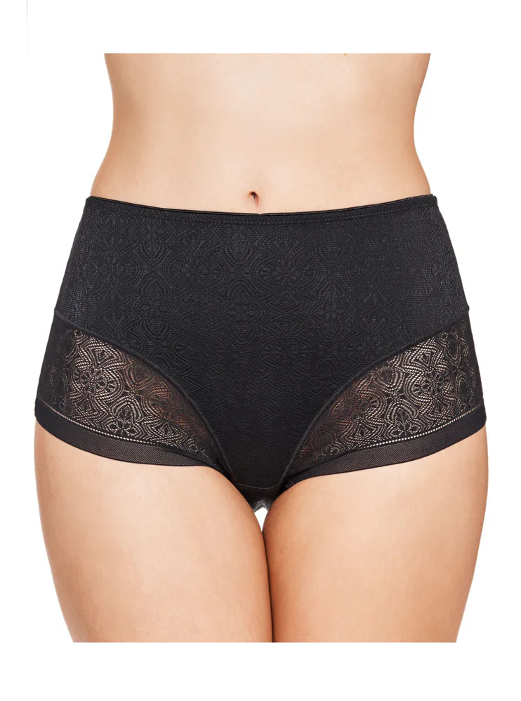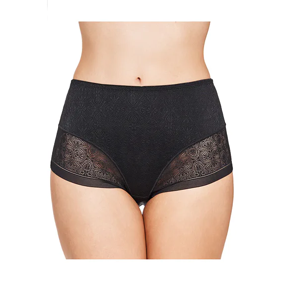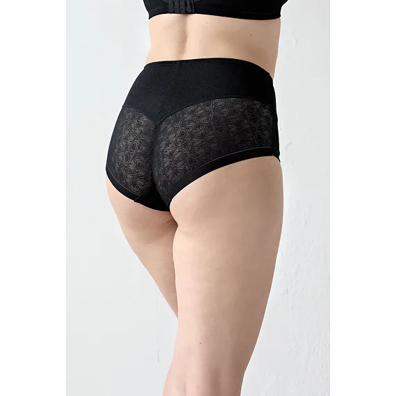 Čierne sťahovacie nohavičky so zvýšeným pásom majú formujúci efekt, vykúzlia krásnu siluetu a zaistia hladký a prirodzený vzhľad pod upnutým oblečením. Šev do tvaru Y v zadnej časti opticky vytvaruje zadoček a zvýrazní krivky. Elegantná čipka zdobí predný aj zadný diel nohavičiek. Samozrejmosťou je zosilnený bavlnený klin na zaistenie maximálneho komfortu. Formujúce nohavičky môžete zaobstarať aj v telovej farbe.