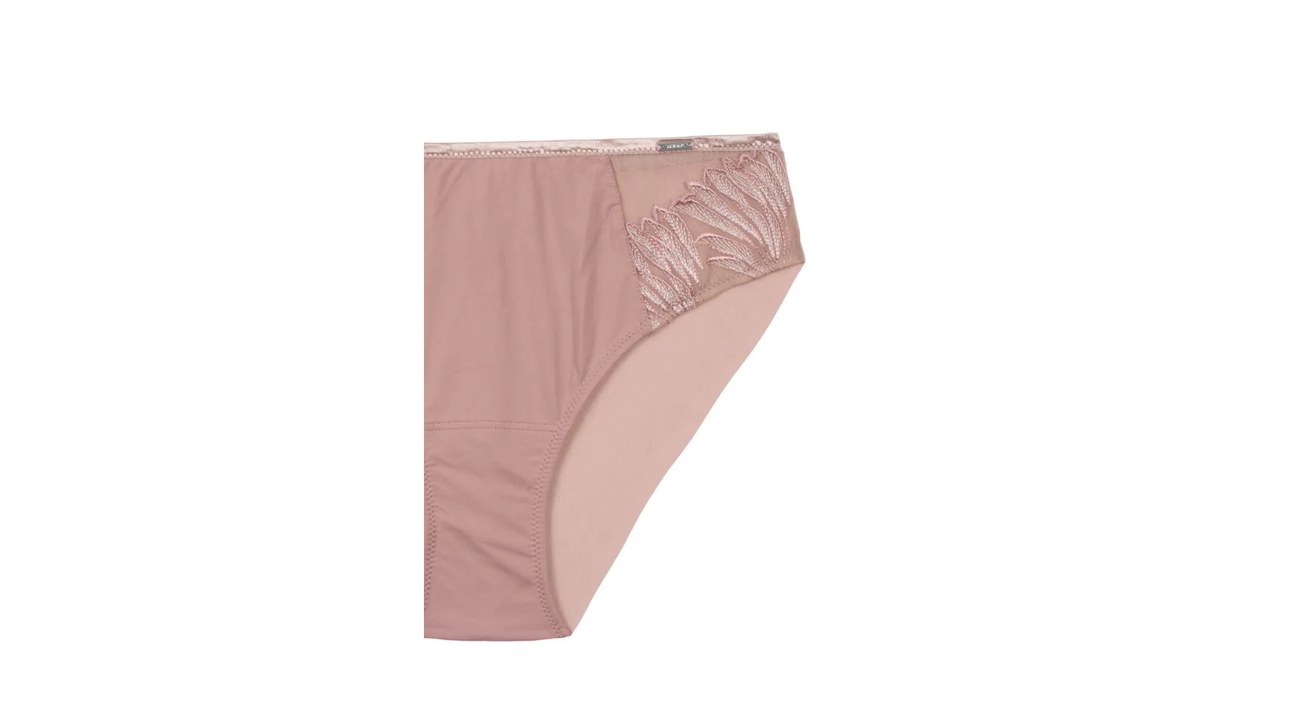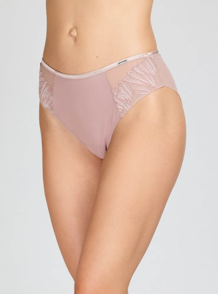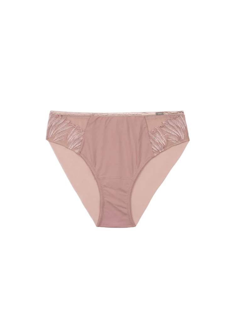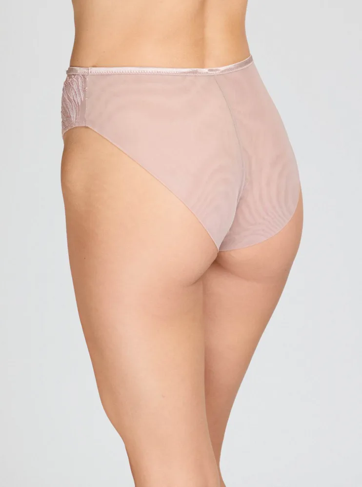 Pohodlie začína pri dokonale padnúcej spodnej bielizni. Nohavičky v klasickom strihu zaisťujú komfort po celý deň. Predný diel zdobí výšivka s lesklými vláknami, ktorá dodáva nohavičkám luxusný vzhľad. Jemný tyl na zadnom diele bez gumičiek vytvára hladkú siluetu.