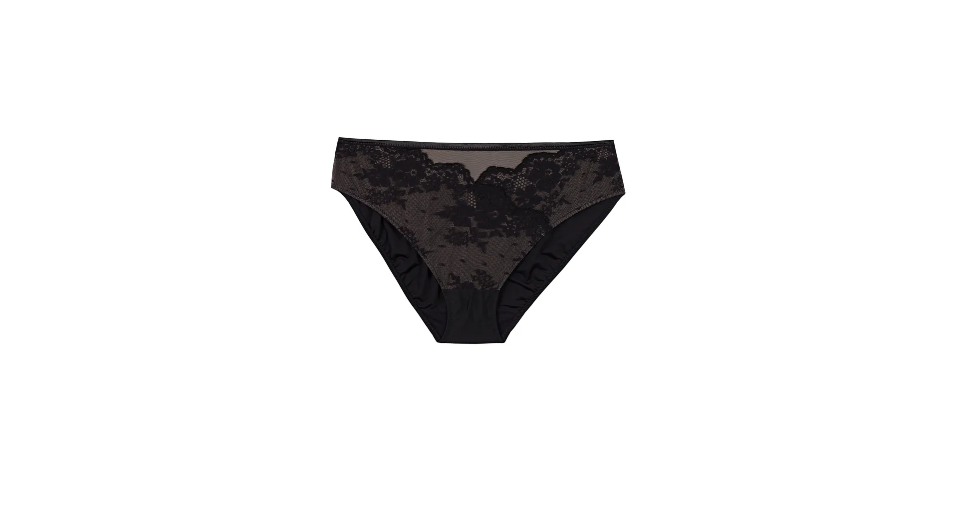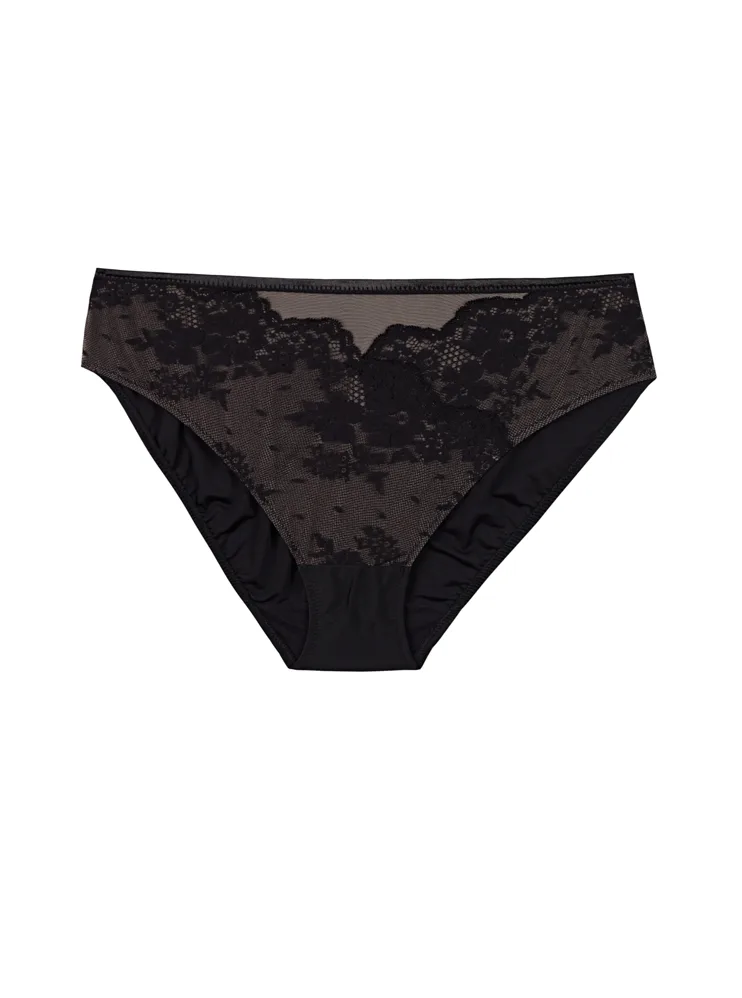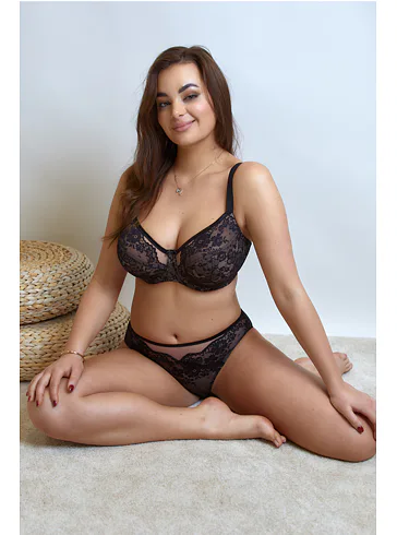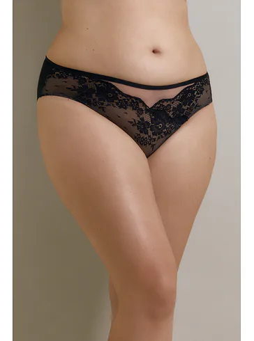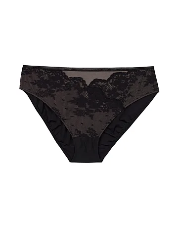 Dámske klasické nohavičky vás uchvátia čiernou rafinovanou čipkou s kvetinovým motívom na nugátovom podklade. Zadný diel nohavičiek je hladký. Univerzálny klasický strih lichotí každej postave a poskytuje plné krytie zadočku a bokov.