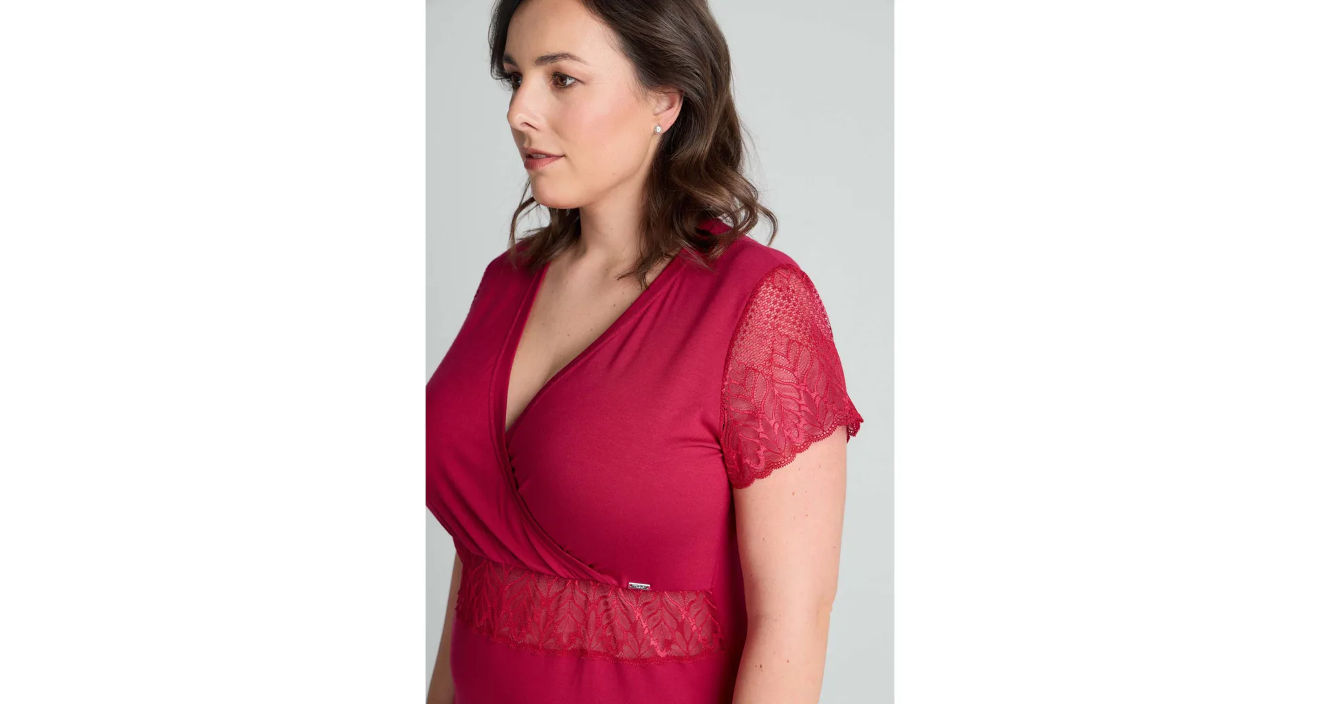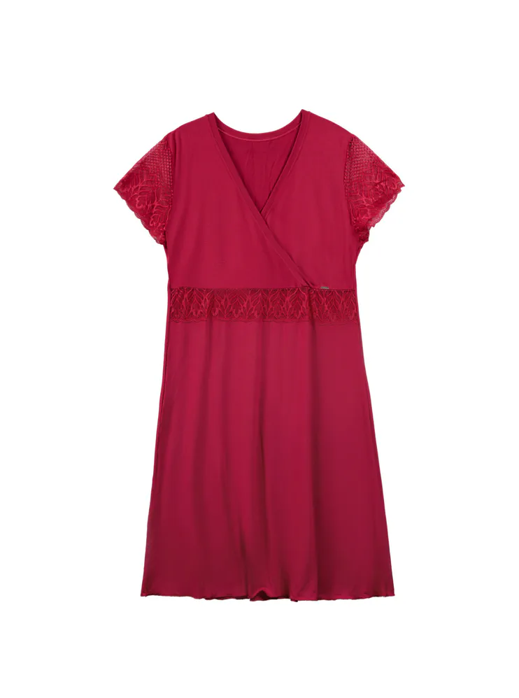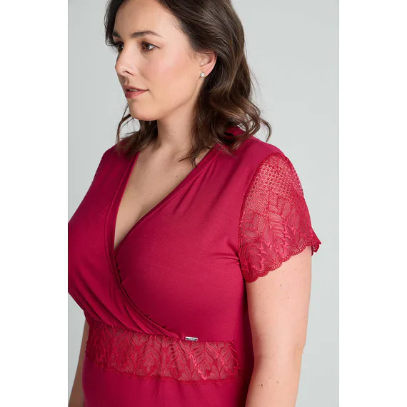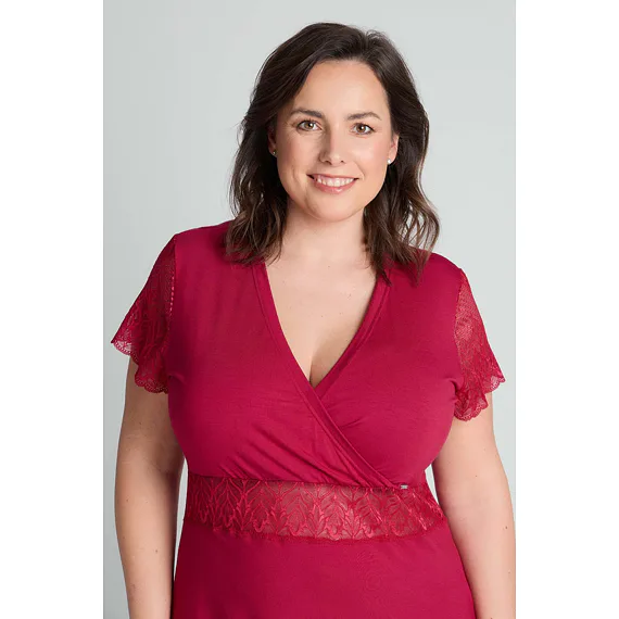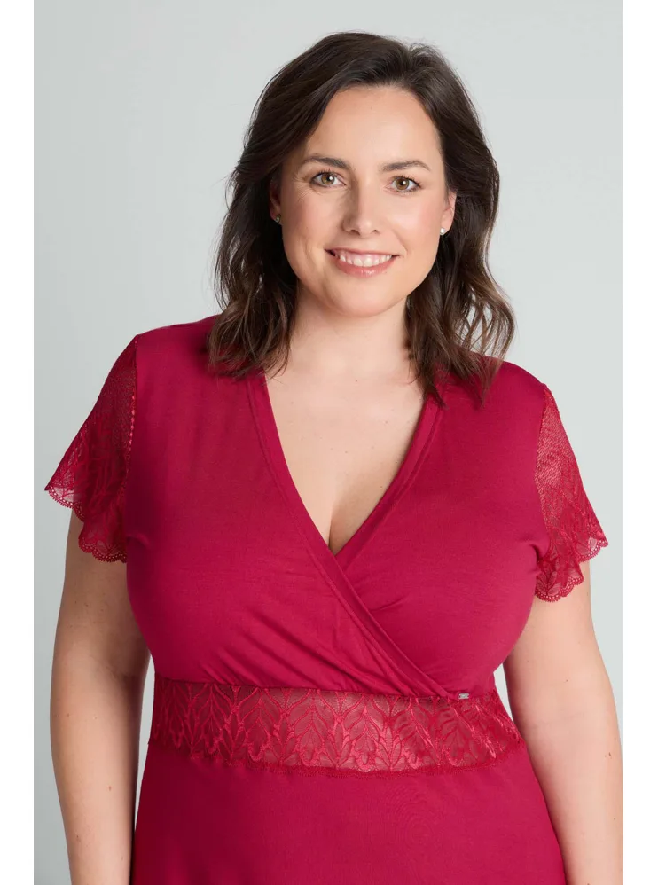 Uspávajte a prebúdzajte sa v mäkkej a splývavej nočnej košeli, ktorá je vyrobená z modalového vlákna. Červená košeľa zaujme jemnou čipkou pod prsiami a na rukávoch. Obľúbený strih s krížením vo výstrihu lichotí postave a pôsobí elegantne.