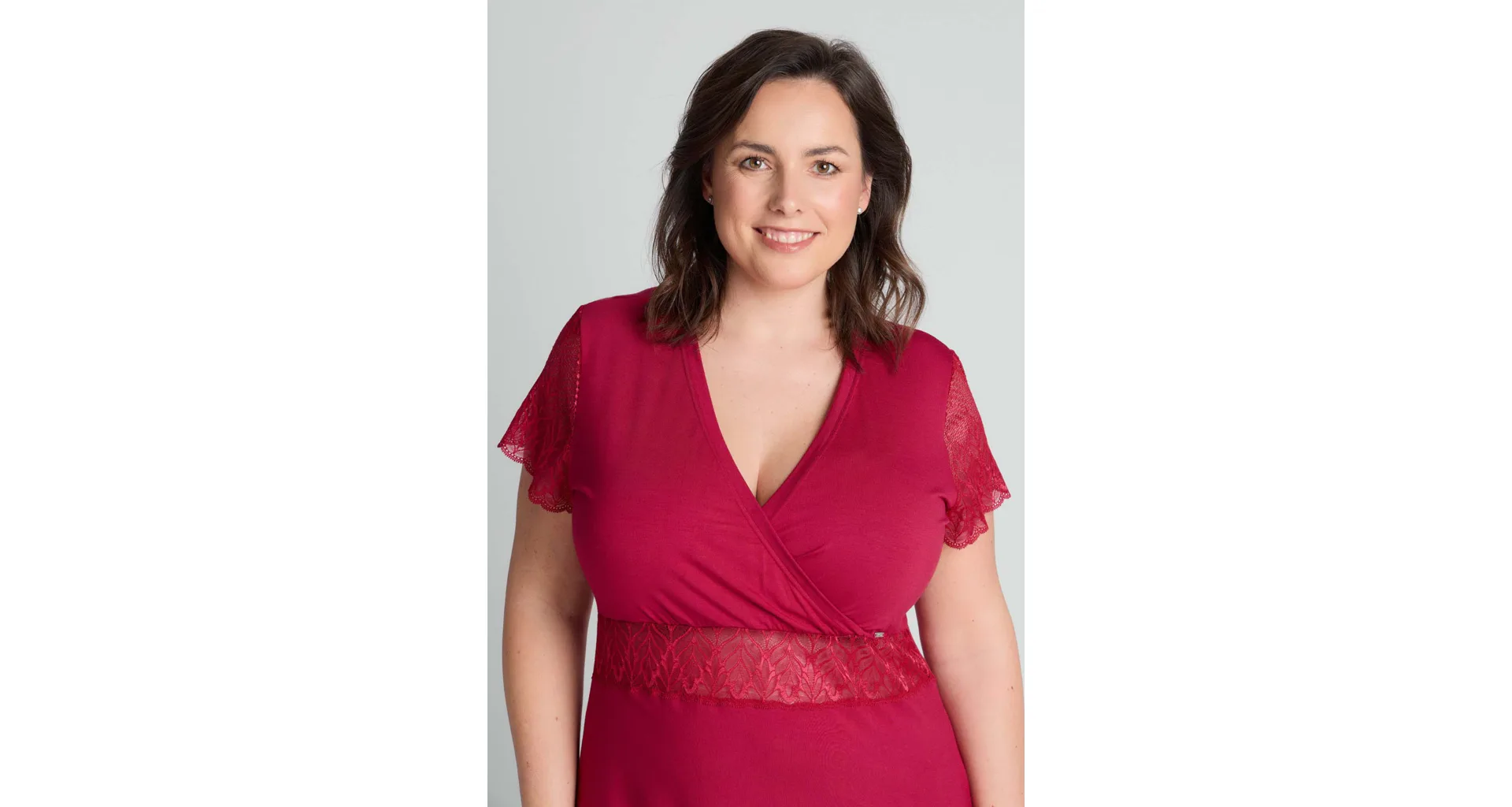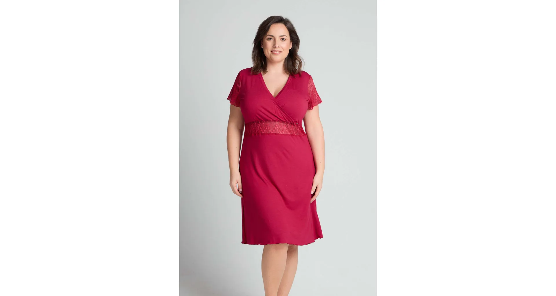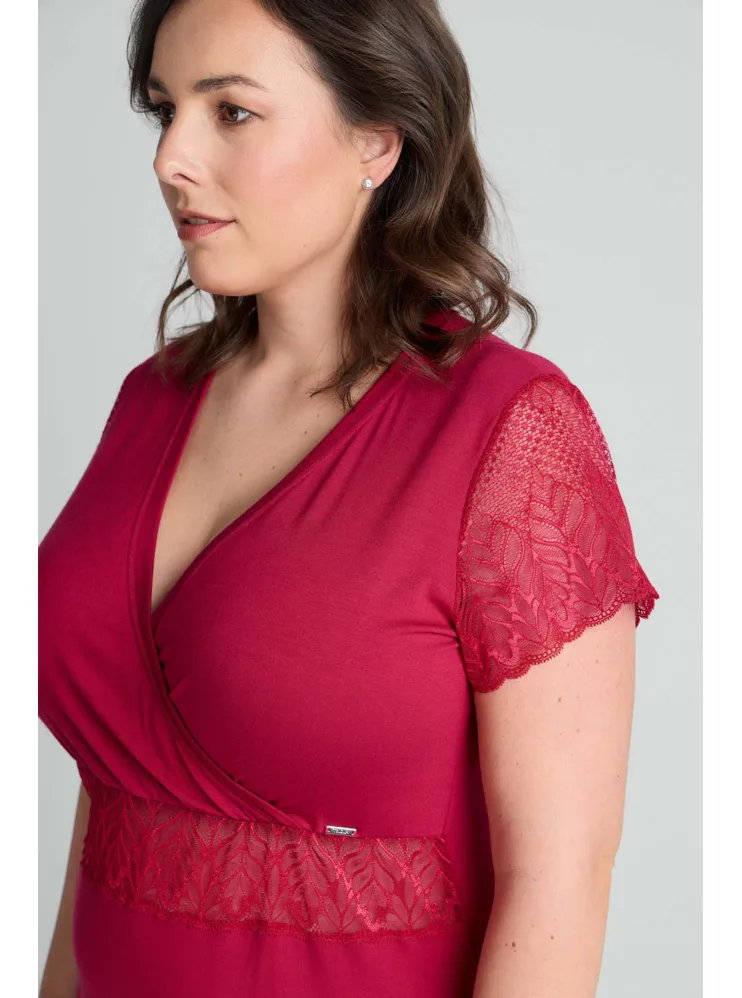Uspávajte a prebúdzajte sa v mäkkej a splývavej nočnej košeli, ktorá je vyrobená z modalového vlákna. Červená košeľa zaujme jemnou čipkou pod prsiami a na rukávoch. Obľúbený strih s krížením vo výstrihu lichotí postave a pôsobí elegantne.