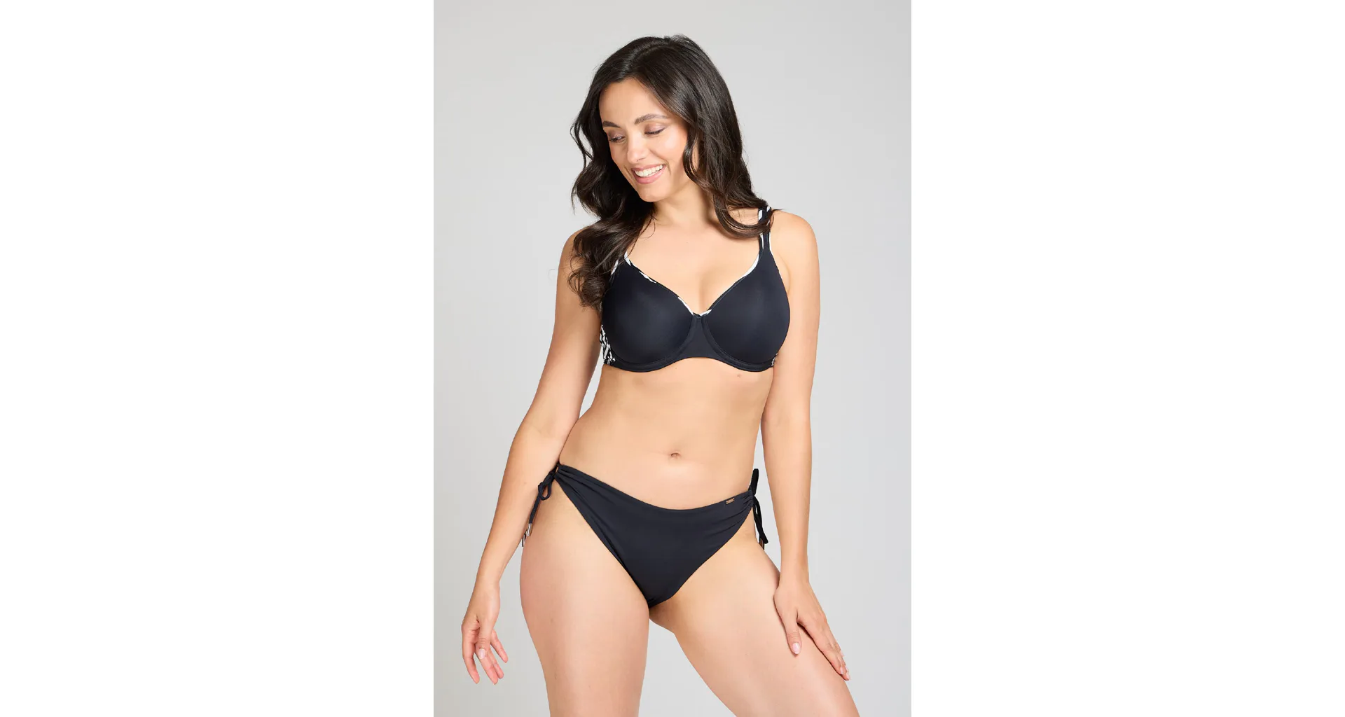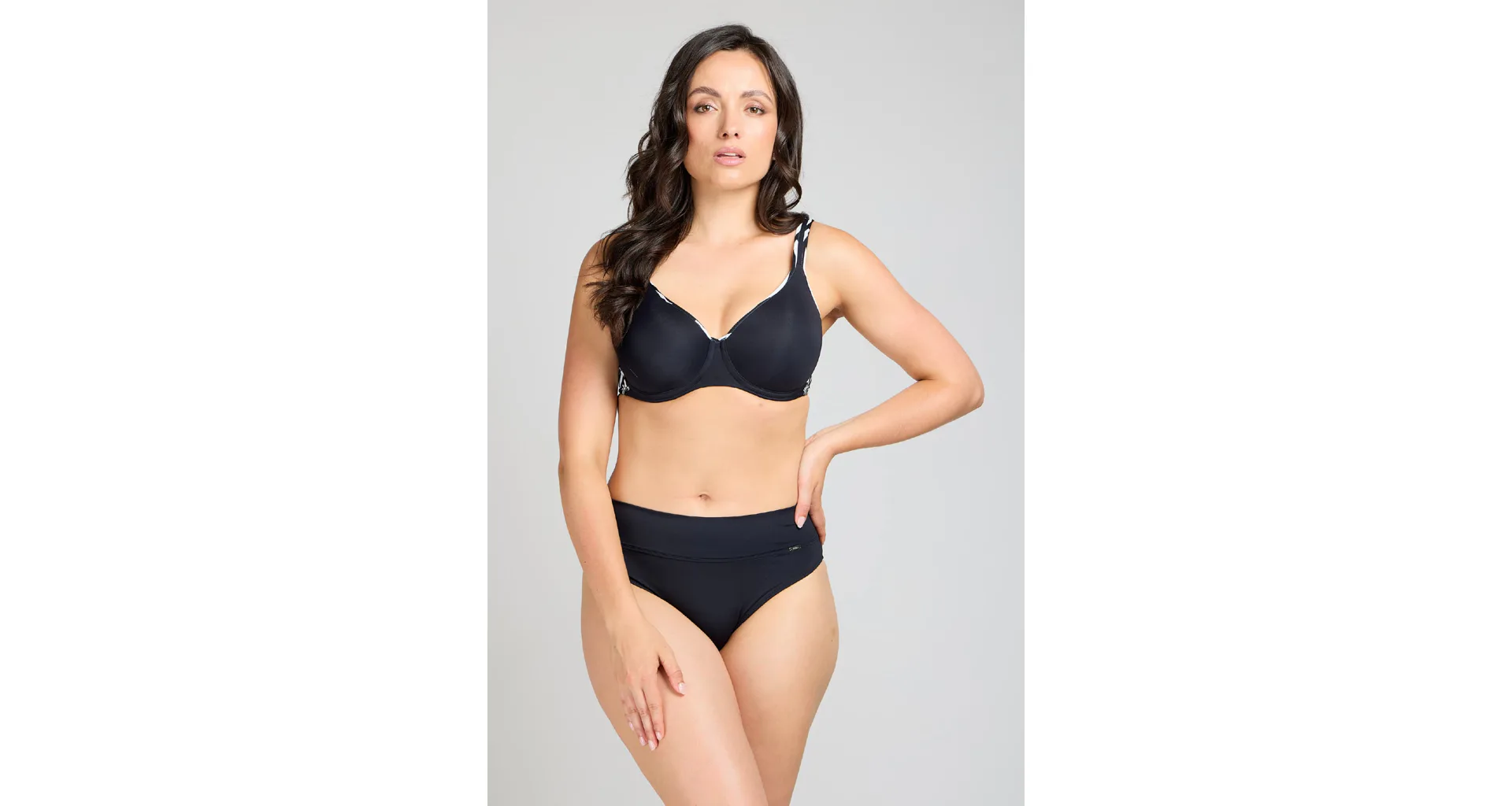 Plavková podprsenka má pohodlné, zaguľatené kostice, ktoré dodávajú modelu pekný tvar. Zadný diel plaviek je podložený pevným úpletom, ktorý udrží aj veľké prsia. Variabilné ramienka je možné zapnúť klasicky, do kríža alebo zaviazať za krkom. K podprsenke zaobstaráte aj plavkové nohavičky do setu.
