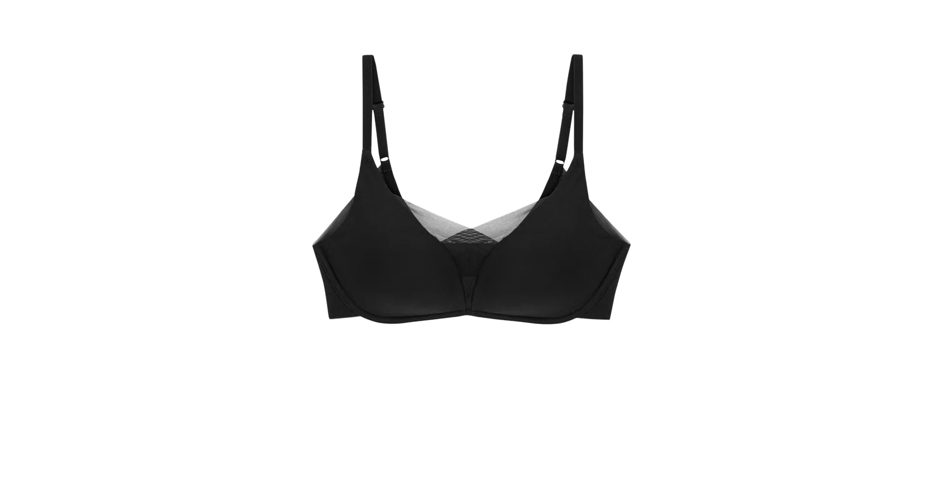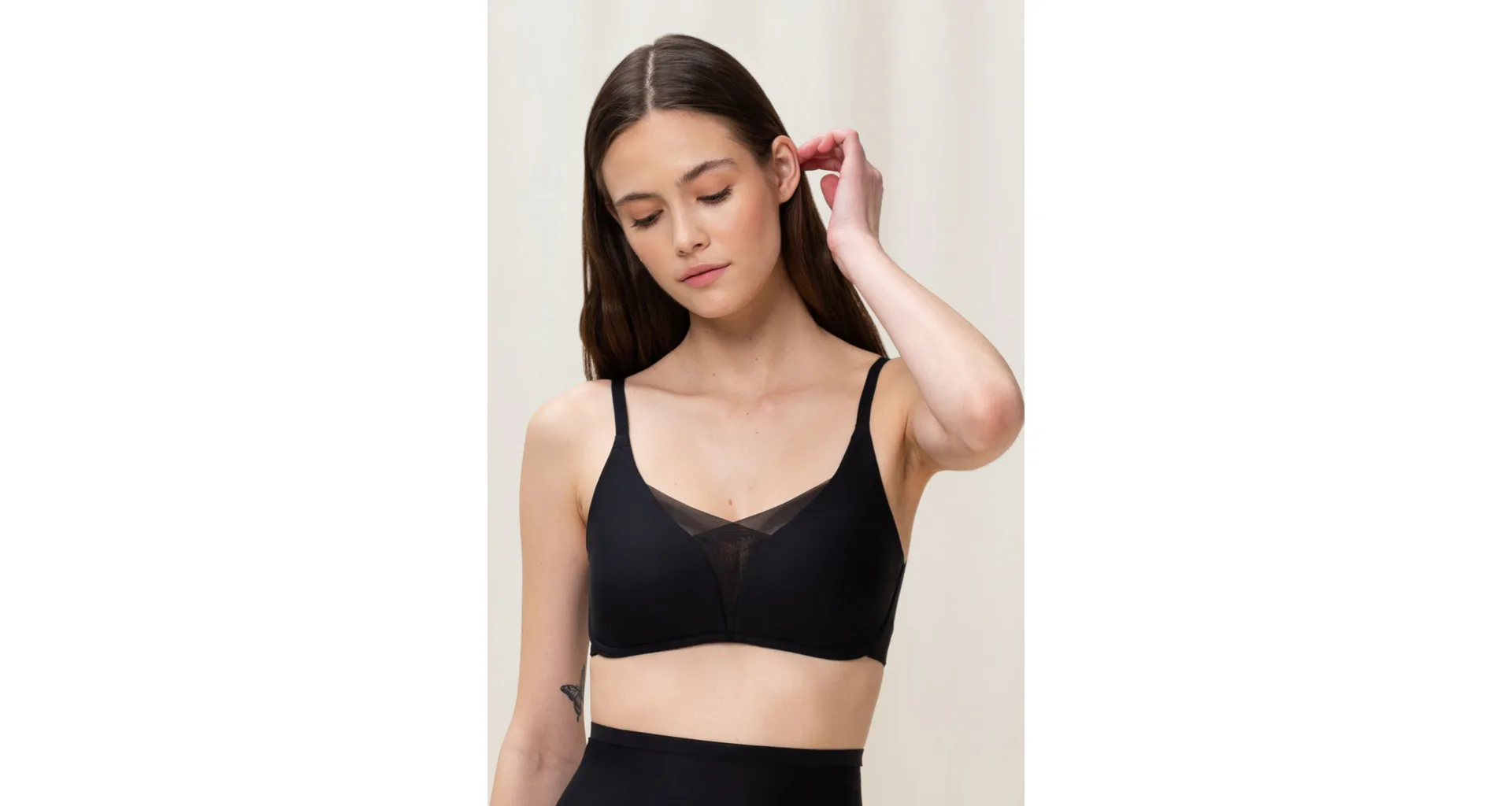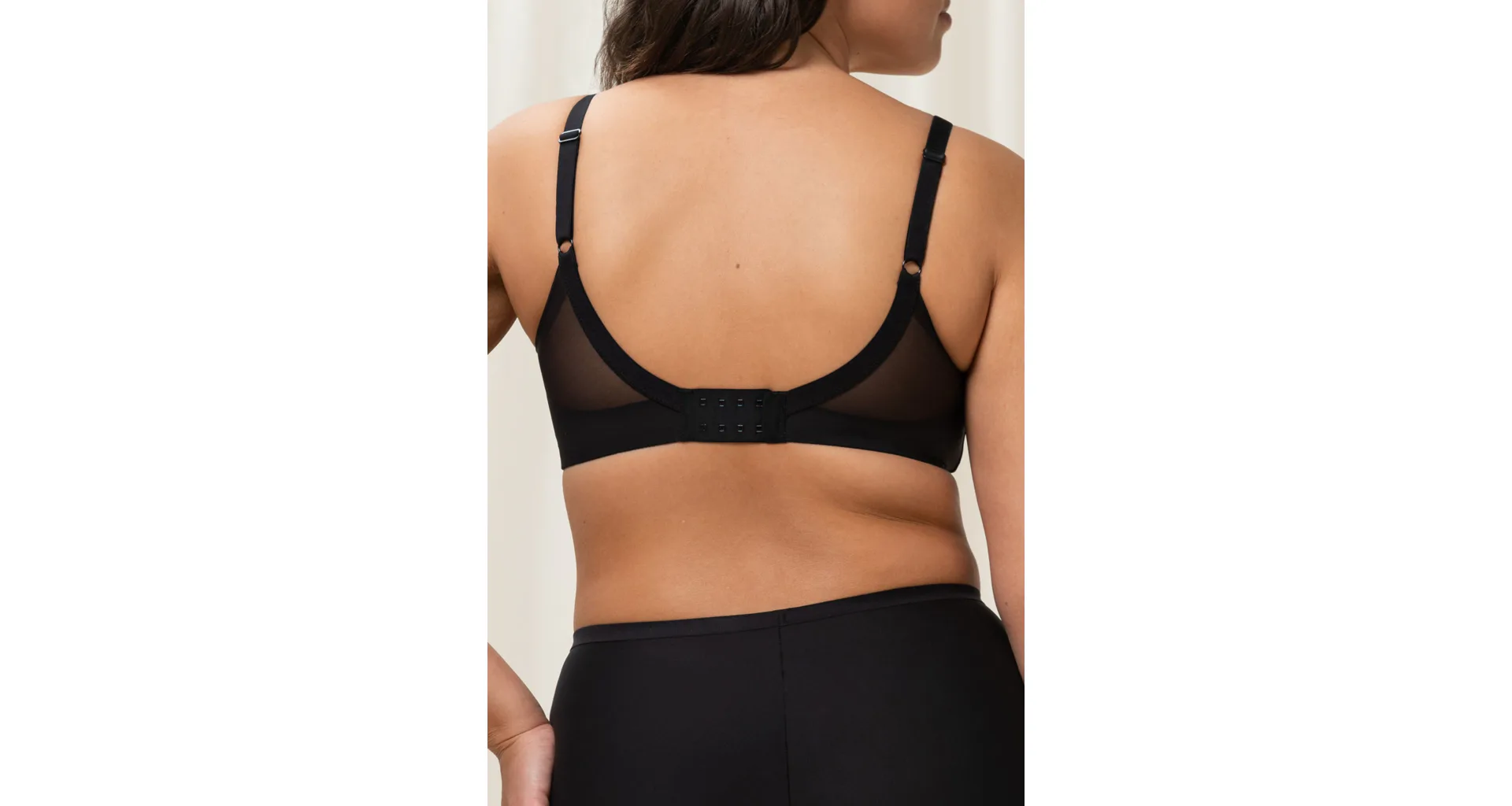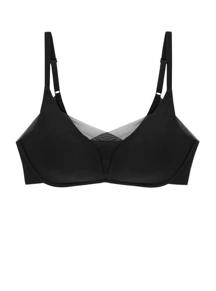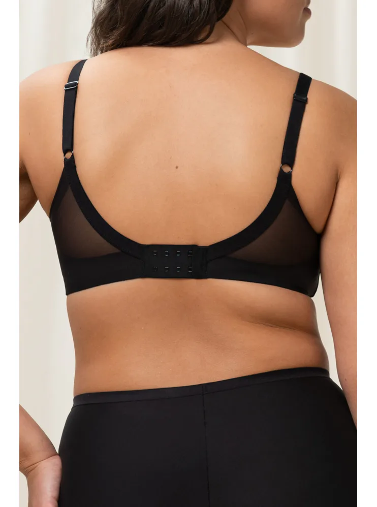 Čierna podprsenka bez kostíc je vyrobená zo špeciálne navrhnutej 4D tkaniny, ktorá poskytuje vyššiu úroveň podpory, perfektne sa prispôsobí vašej postave a veľmi dobre absorbuje vlhkosť. Zaujme prekríženou, vrstvenou sieťovinou utvárajúcou hlboký výstrih do tvaru písmena V. Hladké košíčky sa vám nebudú rysovať pod priliehavým oblečením. Má nastaviteľné ramienka a zapínanie vzadu na dva háčiky so štyrmi polohami stiahnutia, pri väčších veľkostiach nájdete zapínanie na tri háčiky.