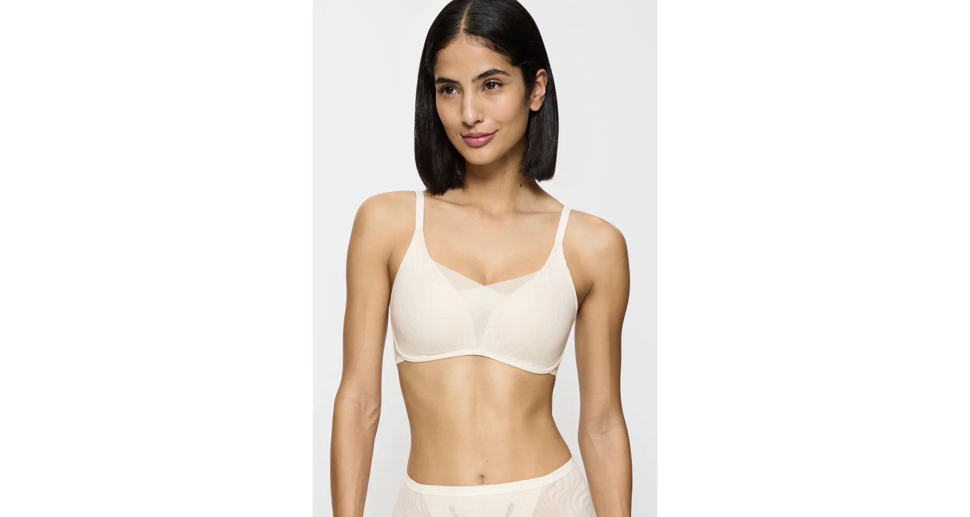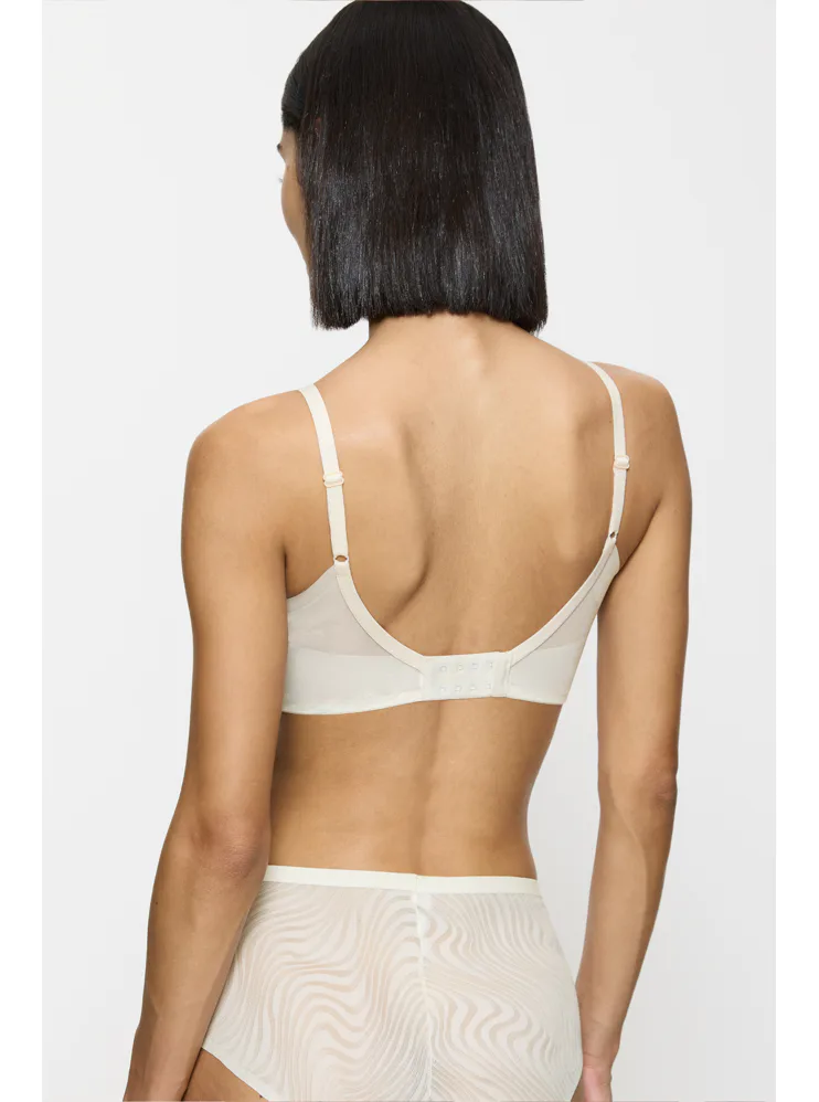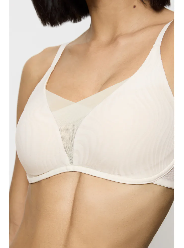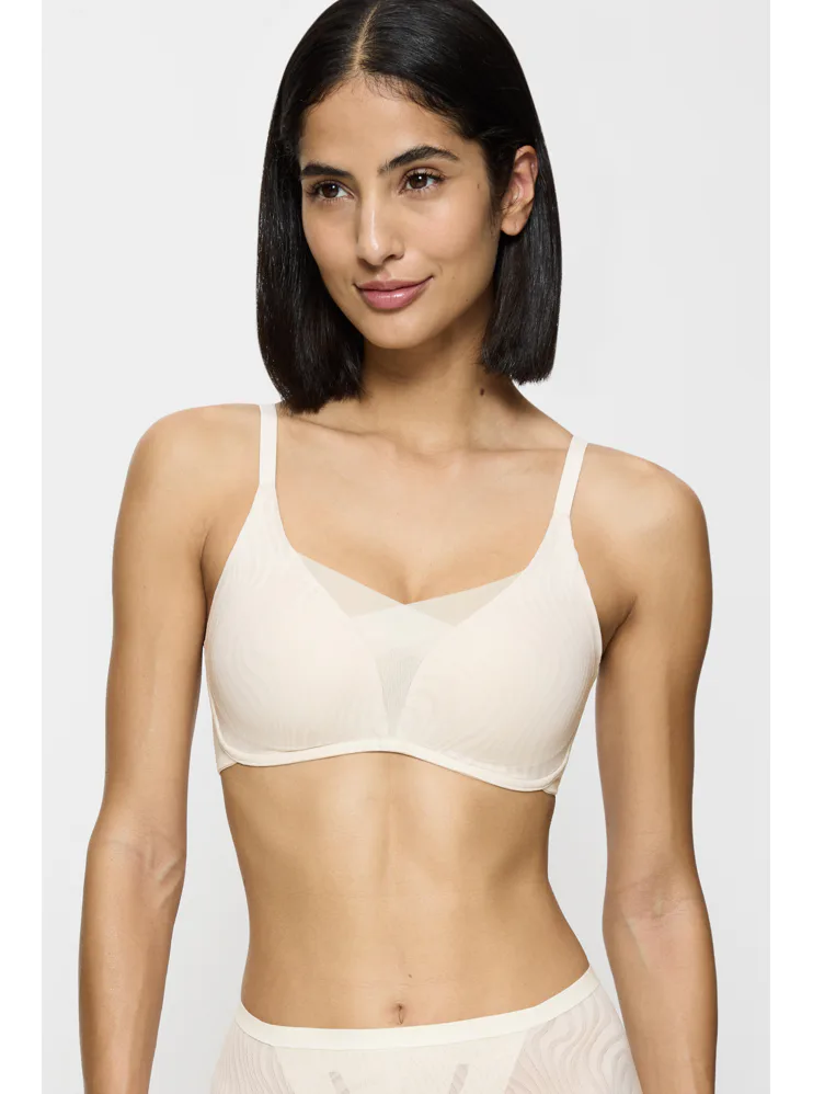 Krémová podprsenka bez kostíc je vyrobená zo špeciálne navrhnutej 4D tkaniny, ktorá poskytuje vyššiu úroveň podpory, dokonale sa prispôsobí vašej postave a veľmi dobre absorbuje vlhkosť. Zaujme prekríženou vrstvenou sieťovinou tvoriacou hlboký výstrih do V. Hladké košíčky nebudú vidieť pod priliehavým oblečením. Má nastaviteľné ramienka a vzadu zapínanie pomocou dvoch háčikov so štyrmi polohami uťahovania, vo väčších veľkostiach nájdete zapínanie na tri háčiky.