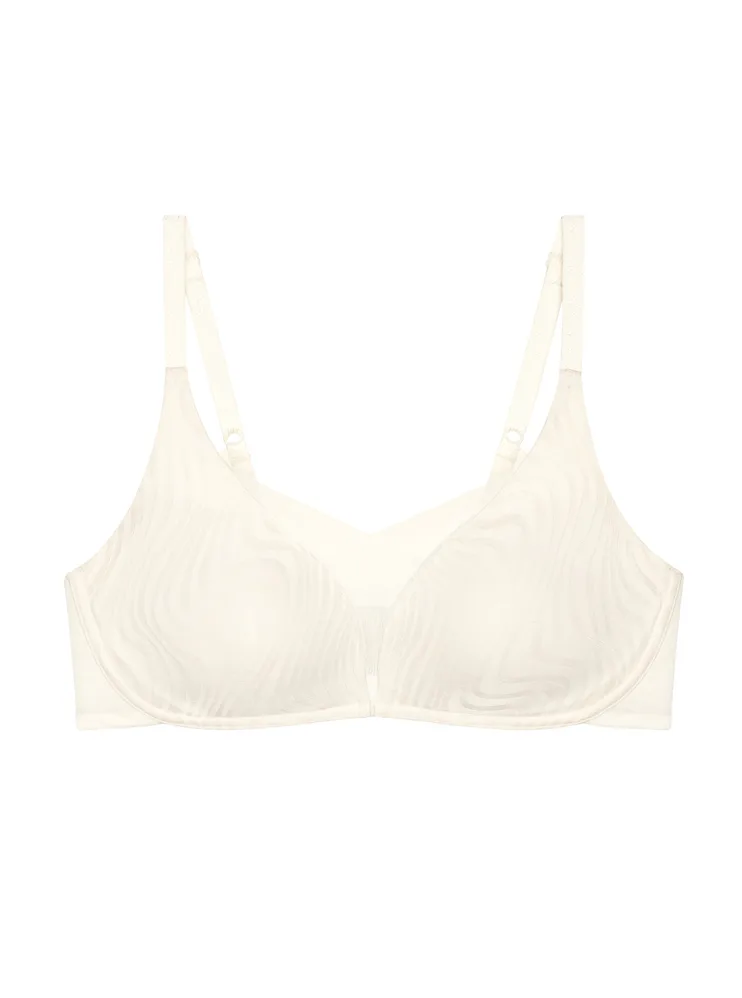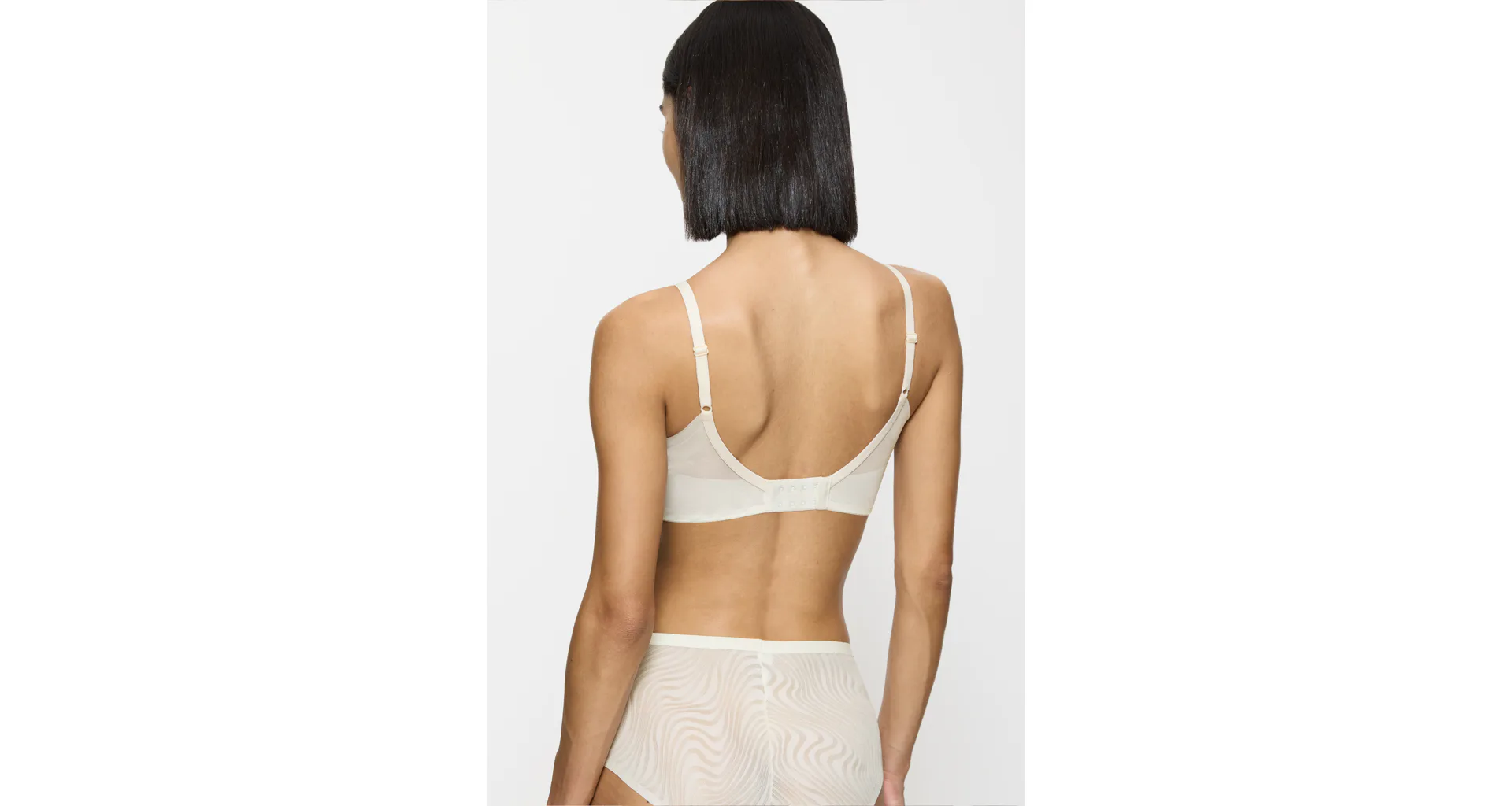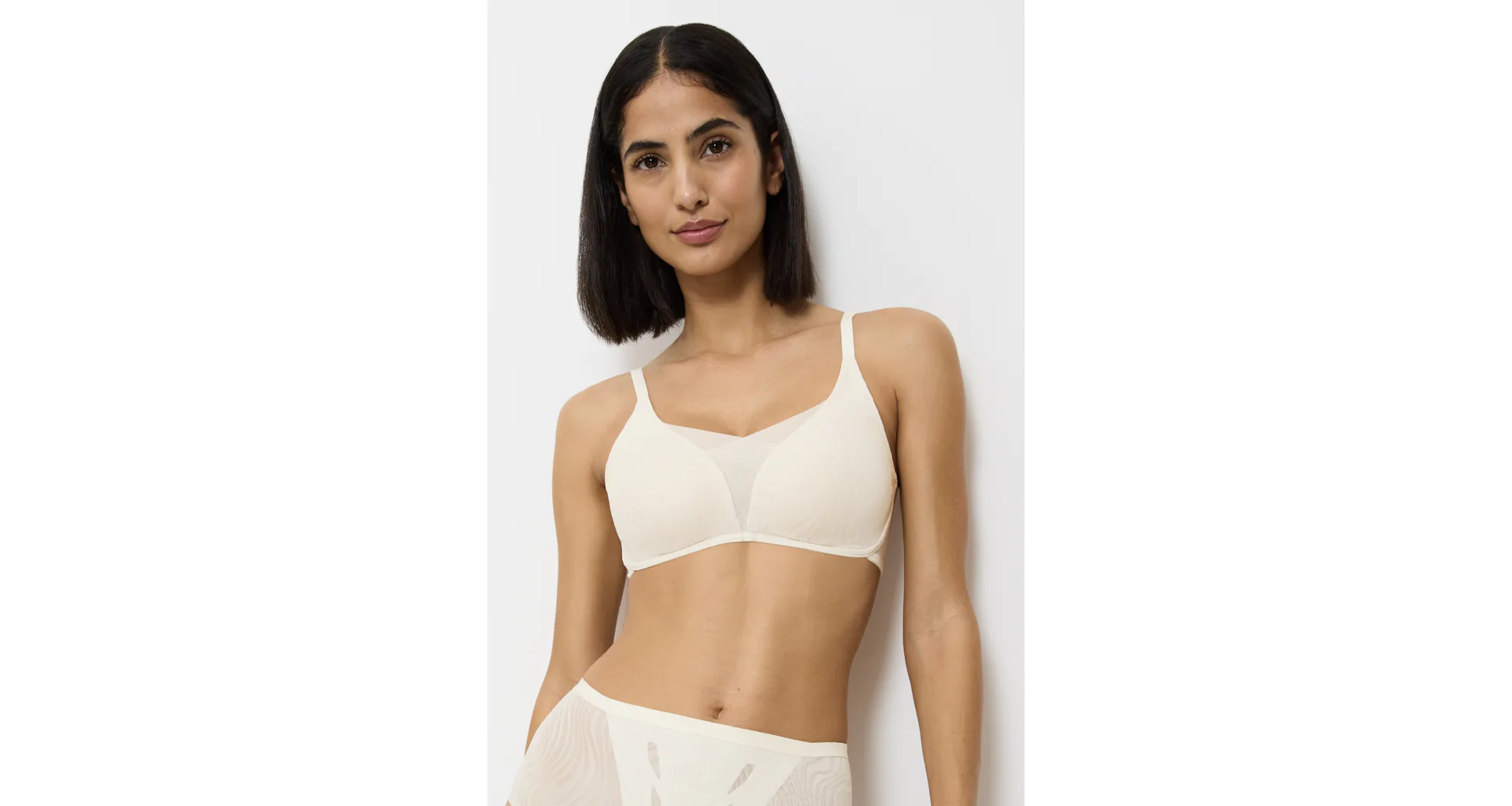 Krémová podprsenka bez kostíc je vyrobená zo špeciálne navrhnutej 4D tkaniny, ktorá poskytuje vyššiu úroveň podpory, dokonale sa prispôsobí vašej postave a veľmi dobre absorbuje vlhkosť. Zaujme prekríženou vrstvenou sieťovinou tvoriacou hlboký výstrih do V. Hladké košíčky nebudú vidieť pod priliehavým oblečením. Má nastaviteľné ramienka a vzadu zapínanie pomocou dvoch háčikov so štyrmi polohami uťahovania, vo väčších veľkostiach nájdete zapínanie na tri háčiky.